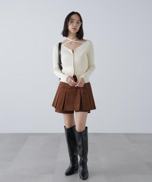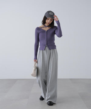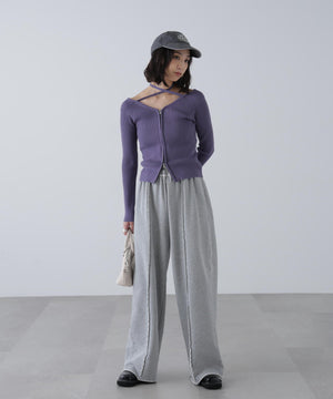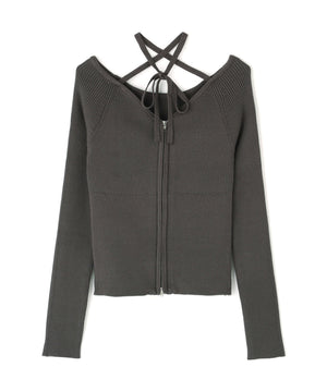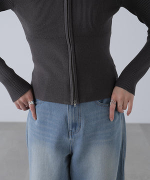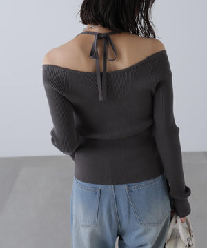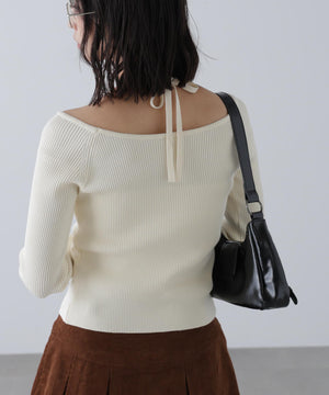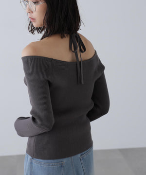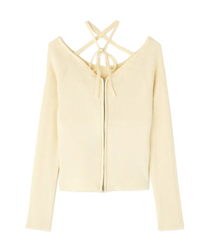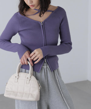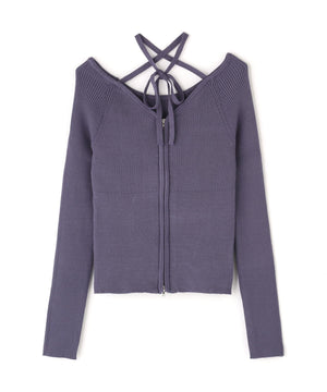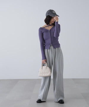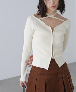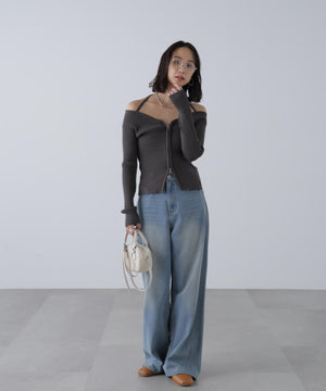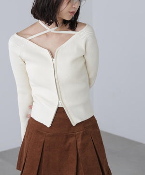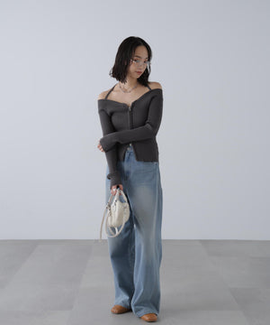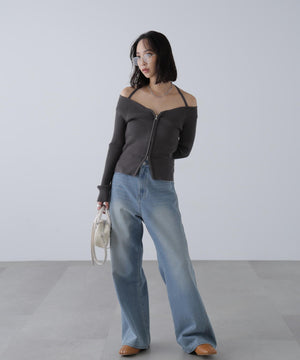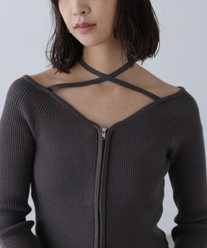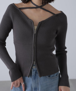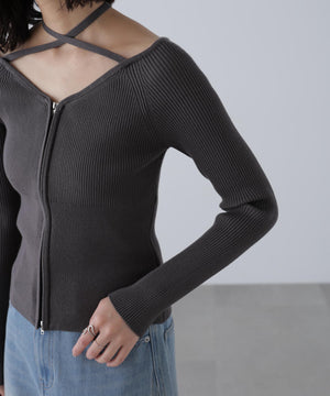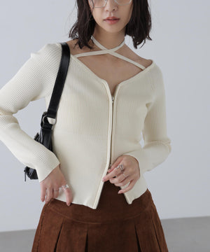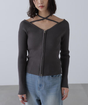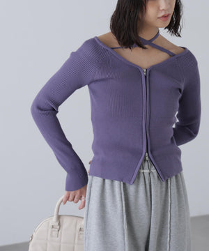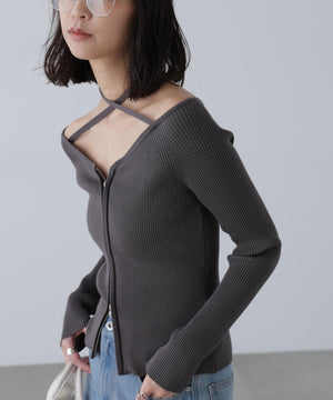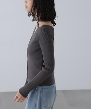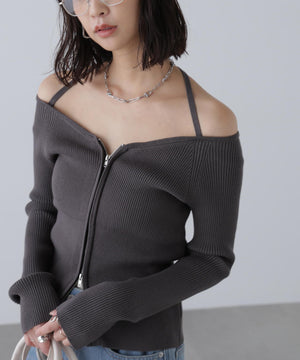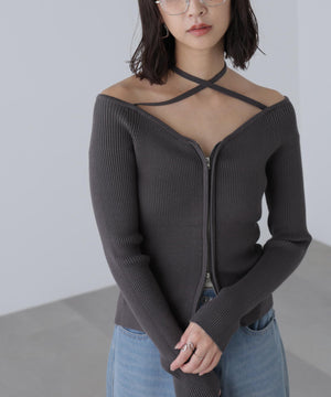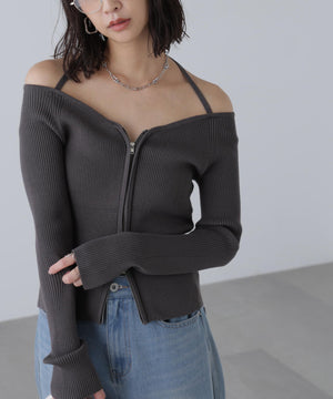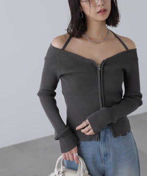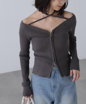 ジップアップオフショルダーリブニット