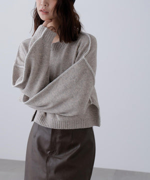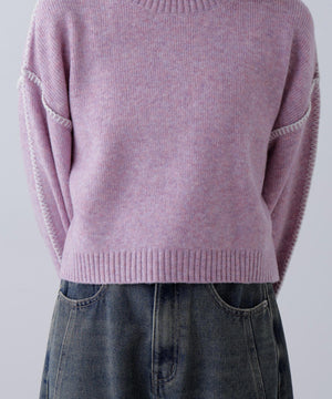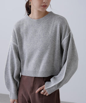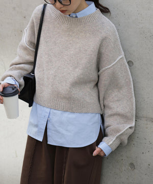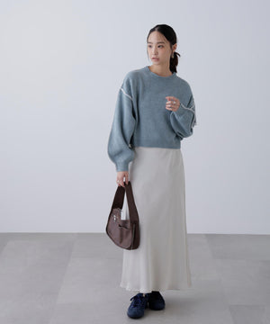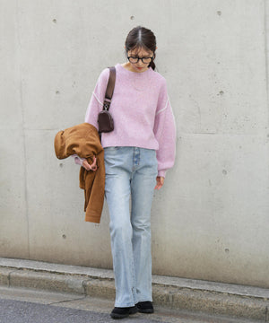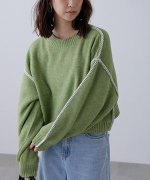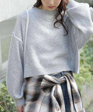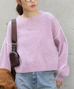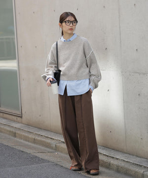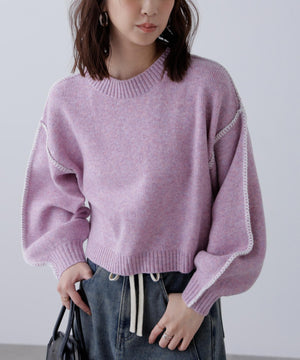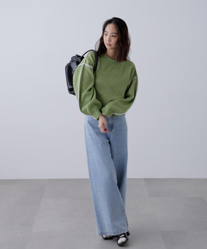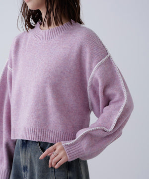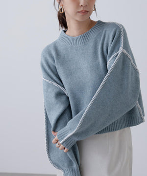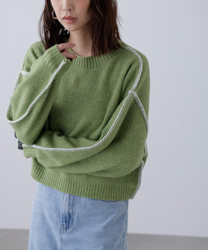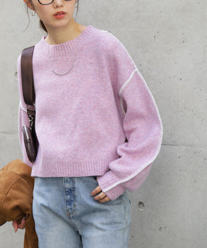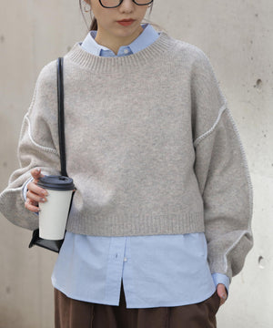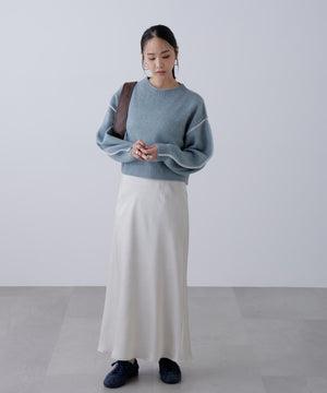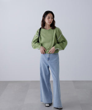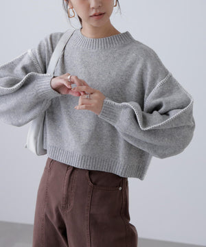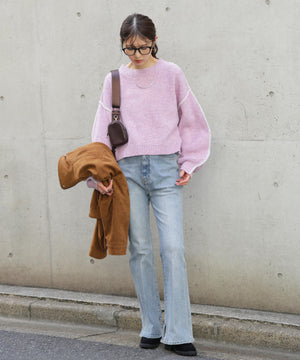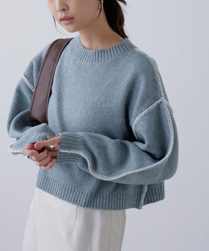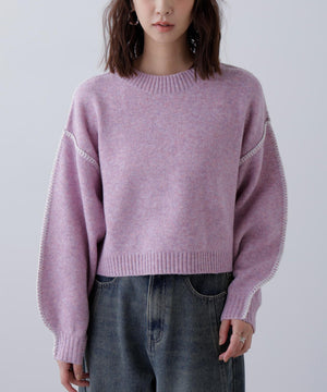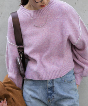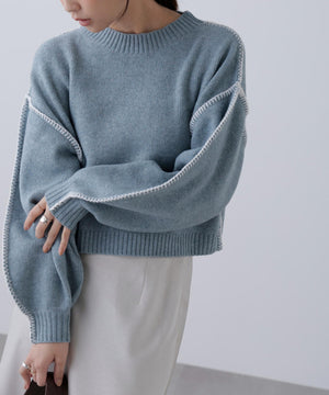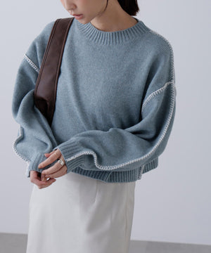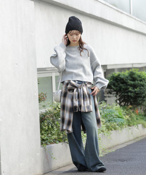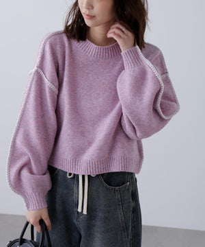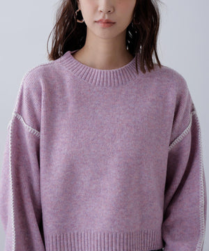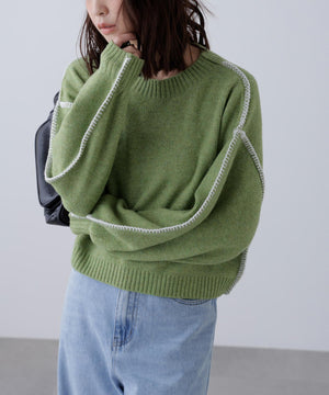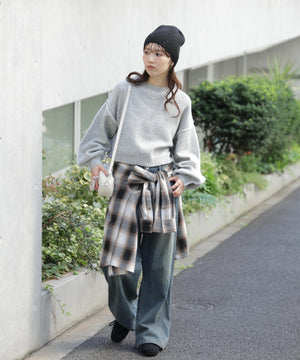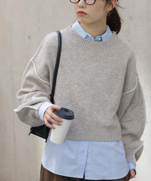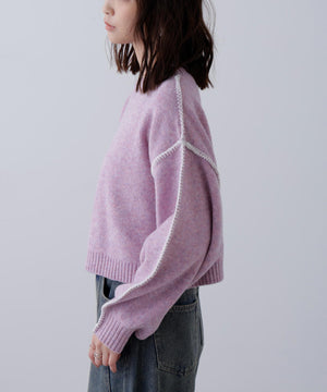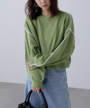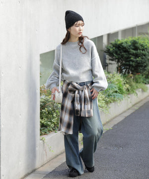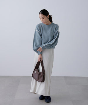毎年好評の杢ストレッチ総針配色ステッチニットが今年も登場!もちっとした膨らみのある糸のニットプルオーバーです。ゆるっとドロップショルダー部分から袖と裾まわりに配色ステッチを施し、デザインポイントになっています。ワイドめのシルエットながらもクロップド丈でバランスがとりやすいです。杢ベージュ・グリーンは昨年と同色、杢グレー・杢パープル・ブルーは今年の新色です。クロップド丈なのでパンツでもスカートでも合わせやすいです。