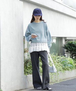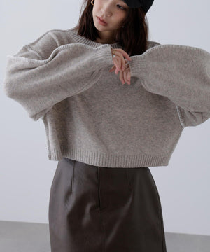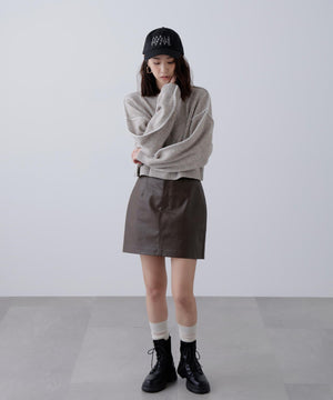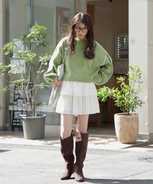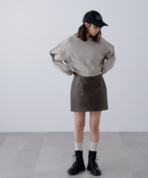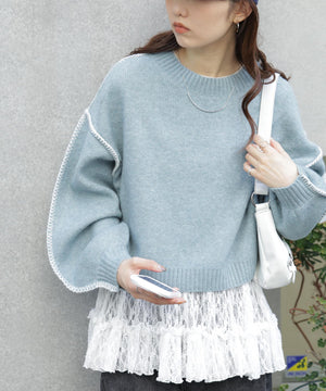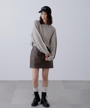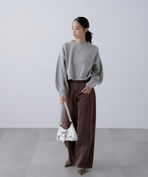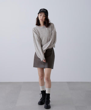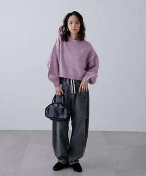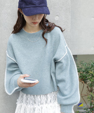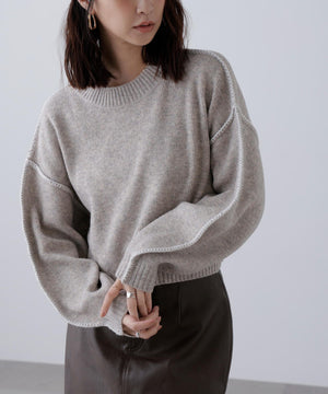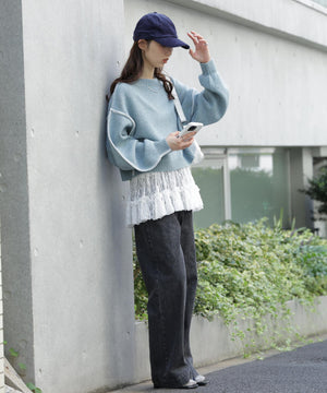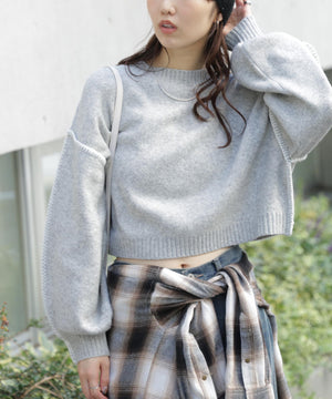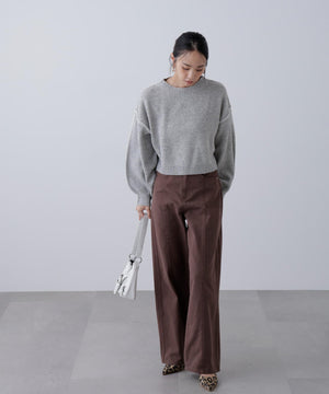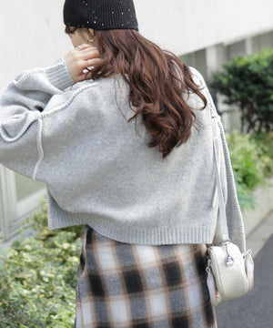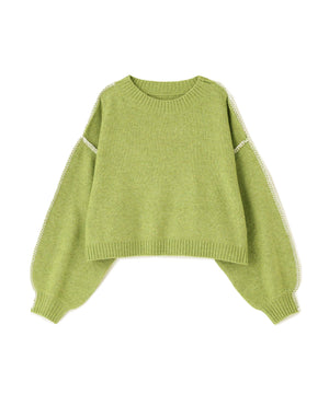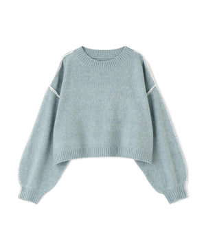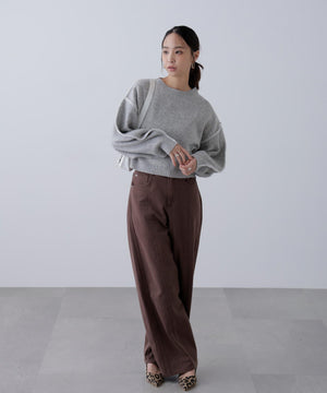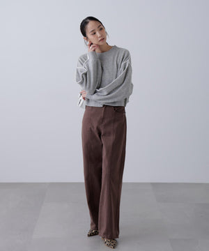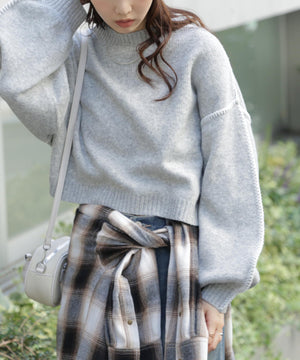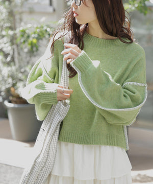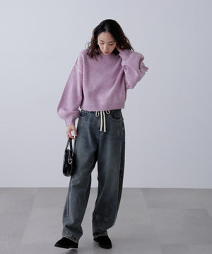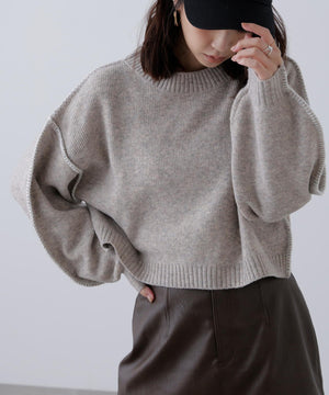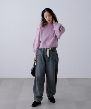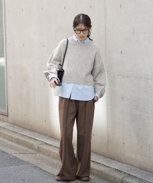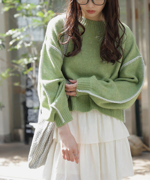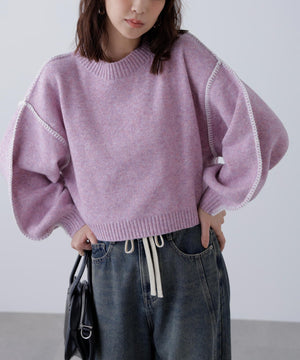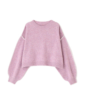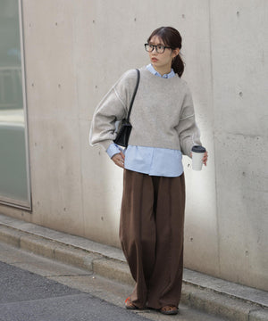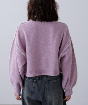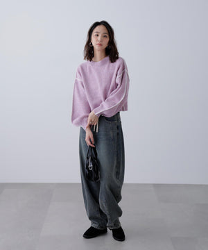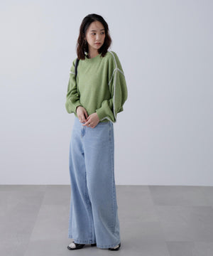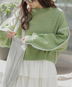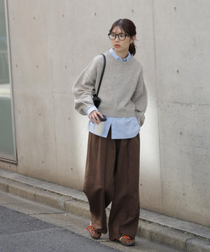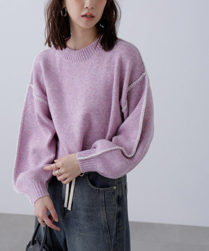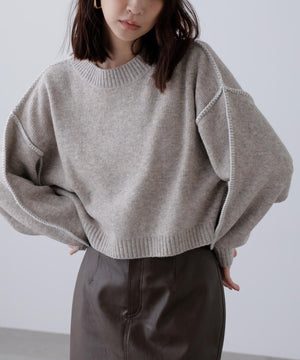 毎年好評の杢ストレッチ総針配色ステッチニットが今年も登場!もちっとした膨らみのある糸のニットプルオーバーです。ゆるっとドロップショルダー部分から袖と裾まわりに配色ステッチを施し、デザインポイントになっています。ワイドめのシルエットながらもクロップド丈でバランスがとりやすいです。杢ベージュ・グリーンは昨年と同色、杢グレー・杢パープル・ブルーは今年の新色です。クロップド丈なのでパンツでもスカートでも合わせやすいです。