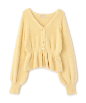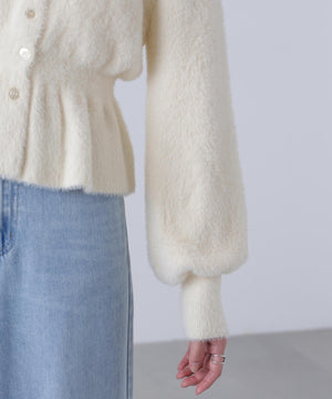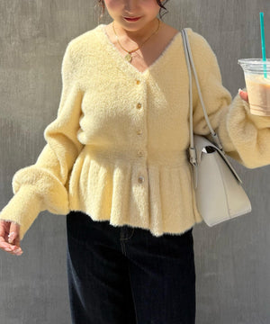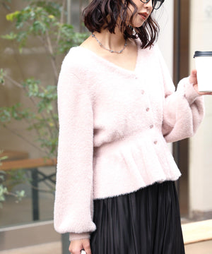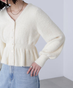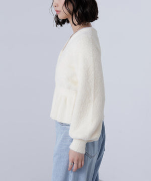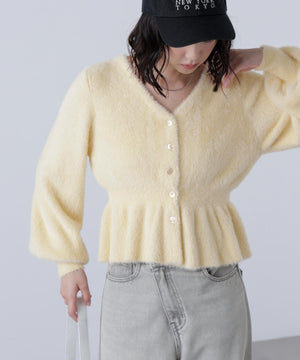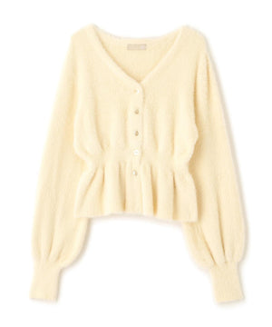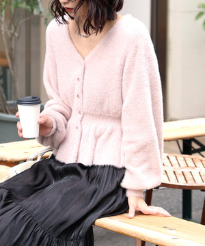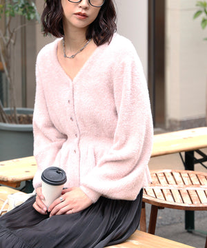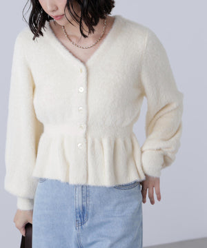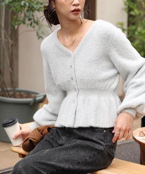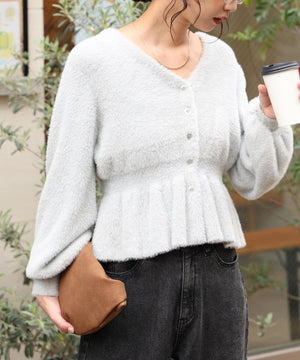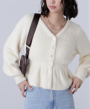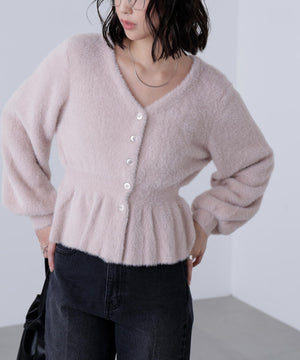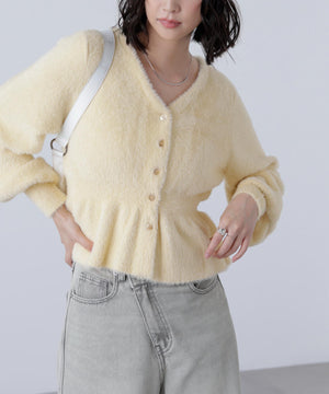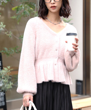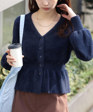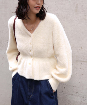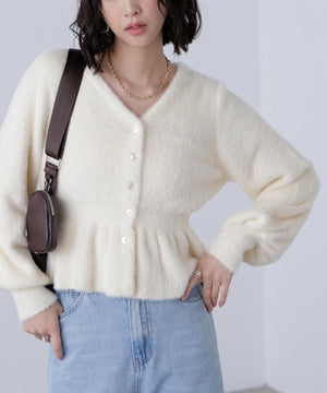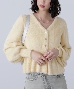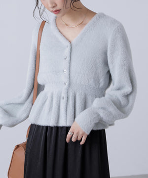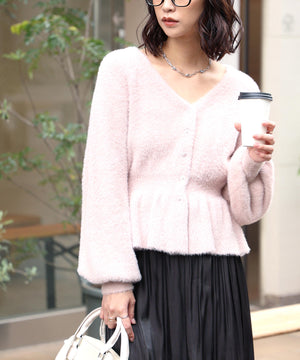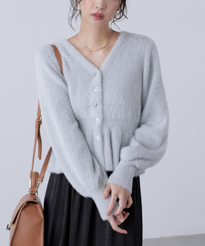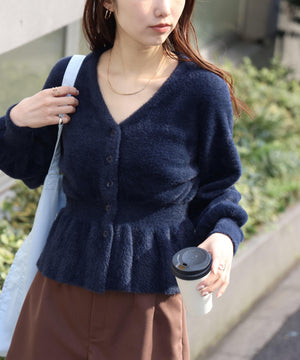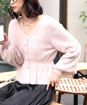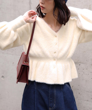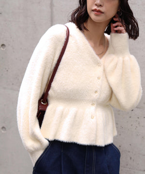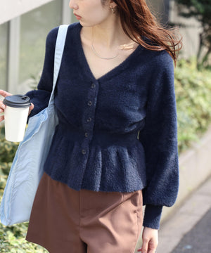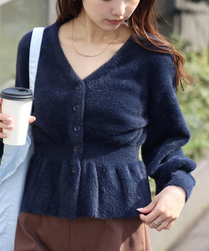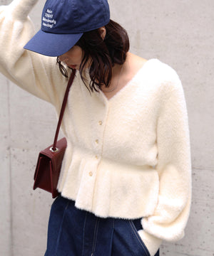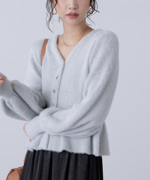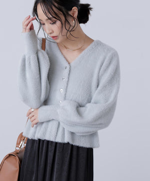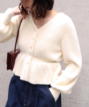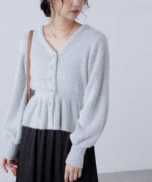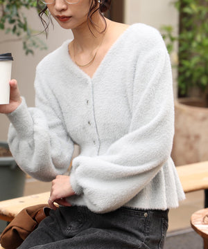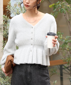 毎年ご好評のカーディガンが今年も登場!トップスとしても羽織りとしても使える、軽やかな着心地のシャギーニットカーディガン。毛足が短く肌に触れてもチクチクしにくい素材を使用、柔らかく滑らかなタッチの糸で仕上げました。シャギーの毛は抜けにくく、しっかりと目が詰まっています。ウエストをリブ編みにしてシェイプさせ、裾はペプラムにすることでスタイルアップを叶えるシルエット。袖口にはギャザーを寄せてボリュームスリーブになっています。1枚でニットプルオーバーのようにも、インナーにブラウスやハイネックトップスを合わせたり、前開きにしてワンピースなどの羽織りにも着回せます。