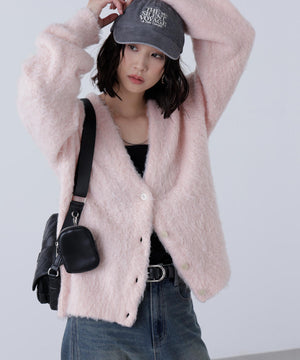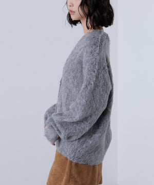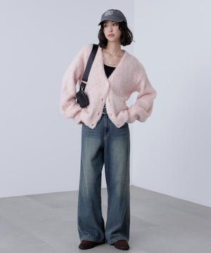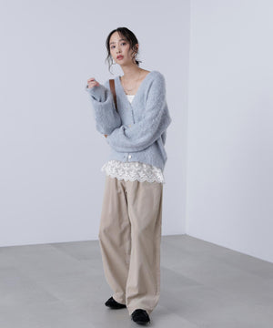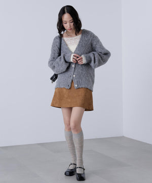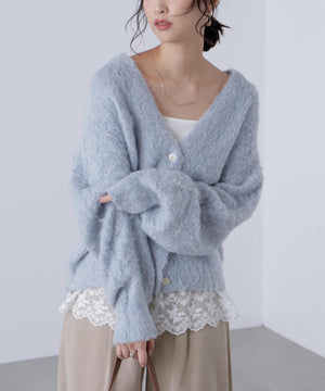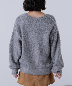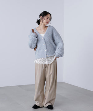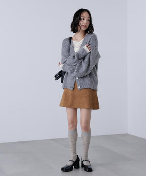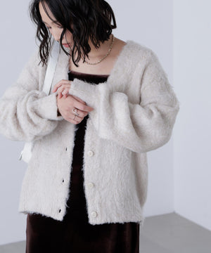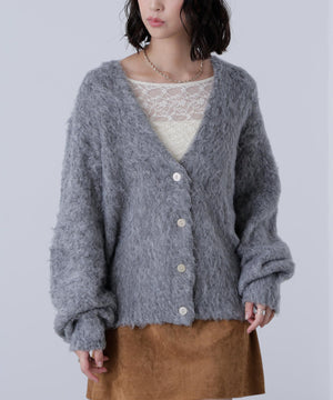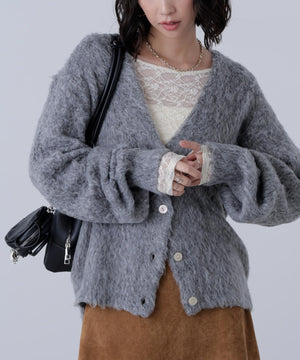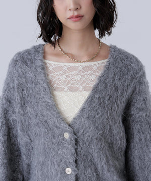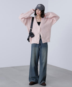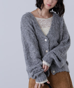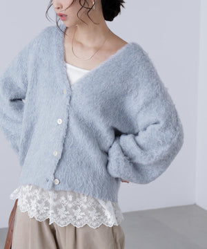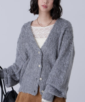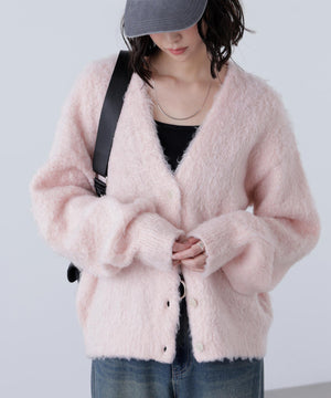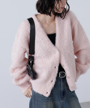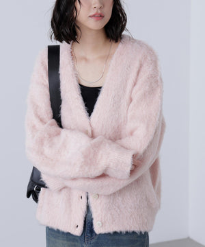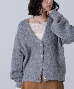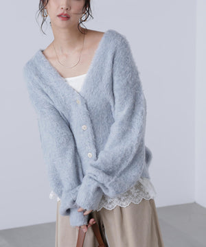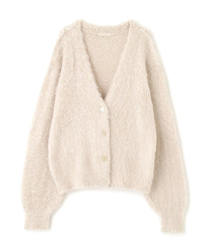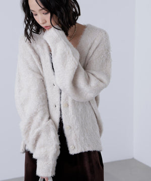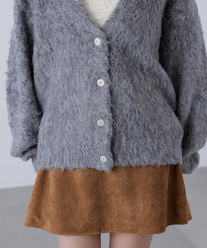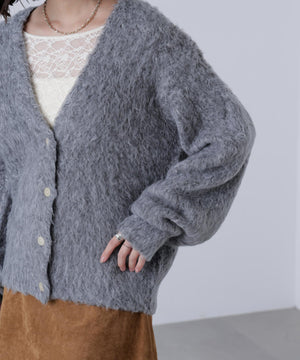 立体感のあるウェーブシャギーが映えるシンプルなVネックカーディガン。ウェーブ状の起毛加工を施したふわふわのタッチに、貝調ボタンがアクセントになっています。厚手すぎず、程よいボリュームの編地なので、秋はアウターの代わりに羽織ったり、冬はコートインにもぴったり。ミニボトムスにも合わせやすい着丈感で、低身長さんにもおすすめです。デニム合わせはもちろん、ミニティアードスカート、プリーツスカートも相性バツグン。Tシャツやタートルネックニットなどとレイヤードも楽しめます。