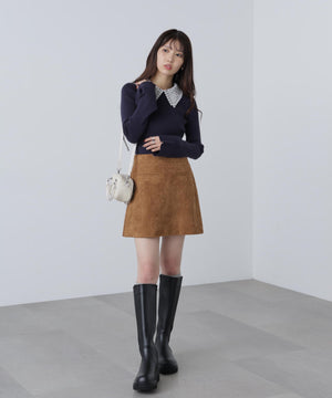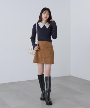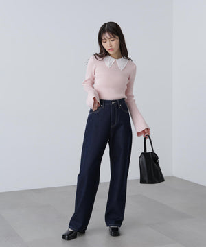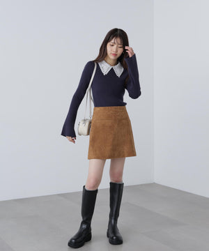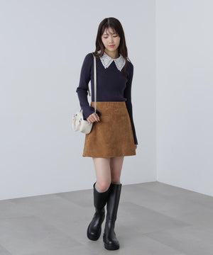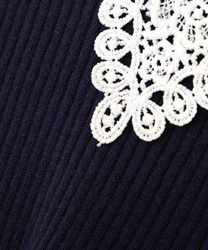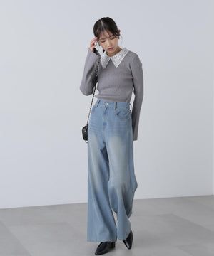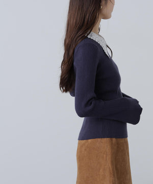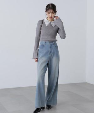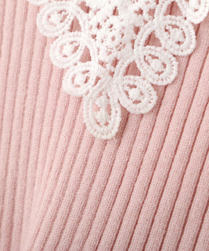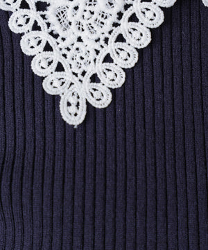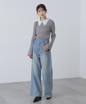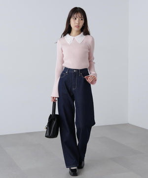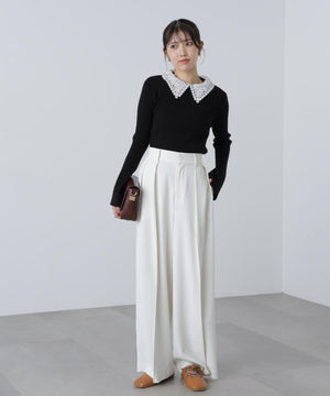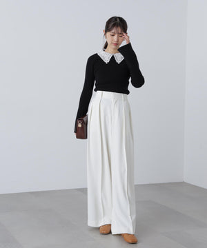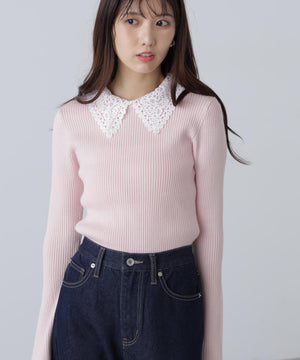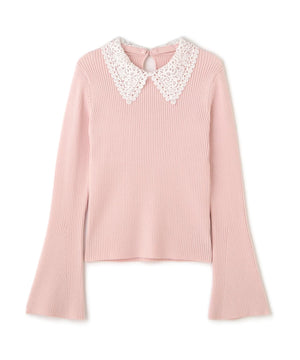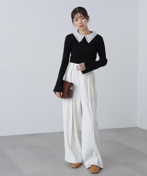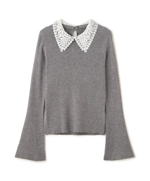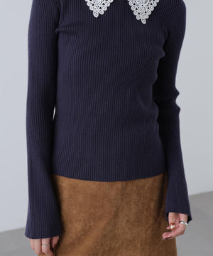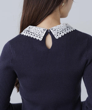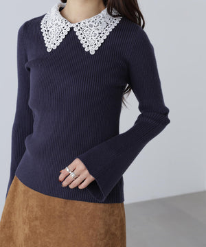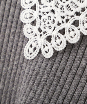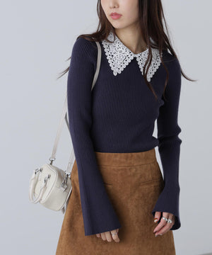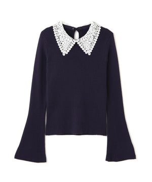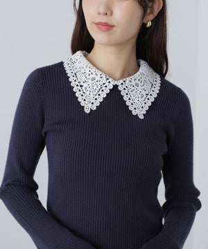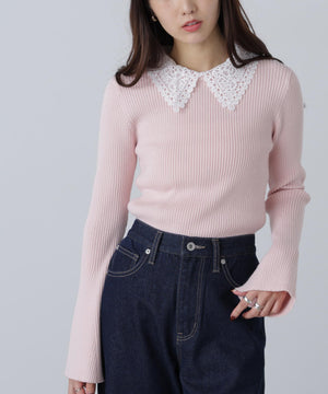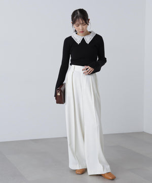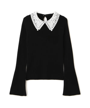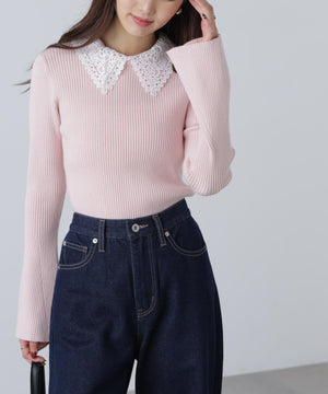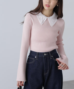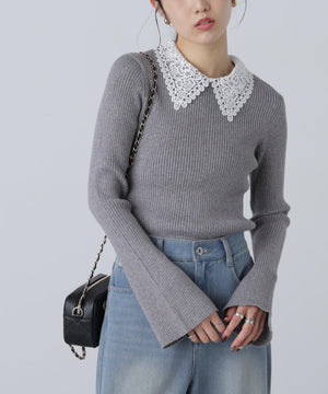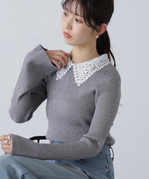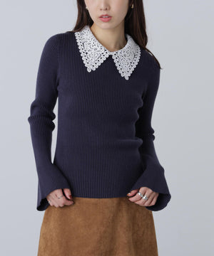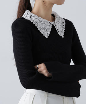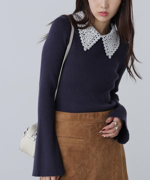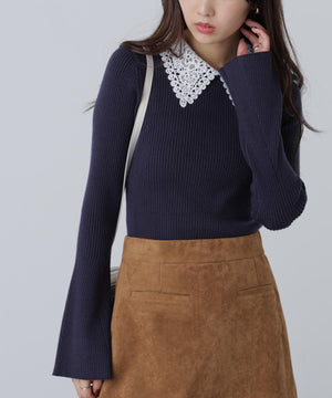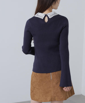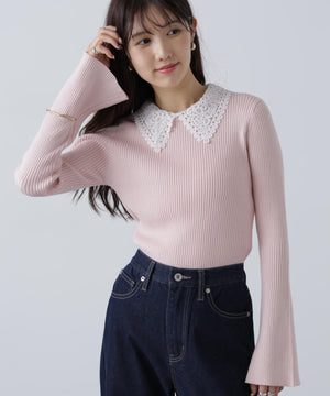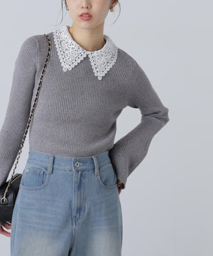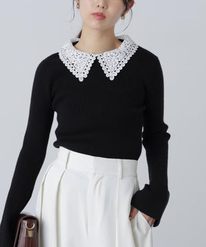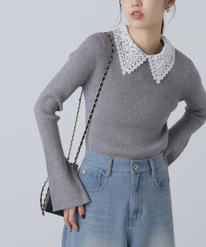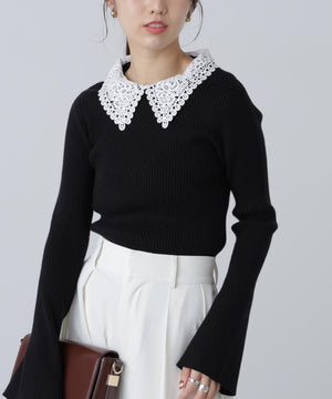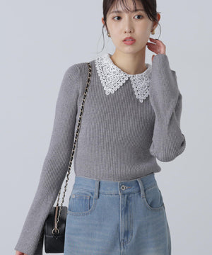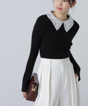【レース襟でコーデを格上げ】この秋取り入れたいレース襟デザインです。上品なレース襟は注目度抜群。もちっとした柔かいタッチニット素材を使用。肌ざわりのよいニット素材を使用しているため、コンパクトでありながら体のラインを拾いにくいです。袖のベルスリーブもデザインポイント。ほどよいクロップド丈なのでボトムスを選ばずに着回せます。ショートパンツ・ミニ丈スカートとの相性抜群。ワイドデニム・ハイウエストスラックスと合わせたコーディネートもおすすめです。