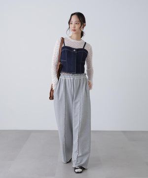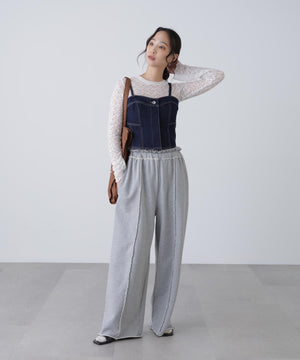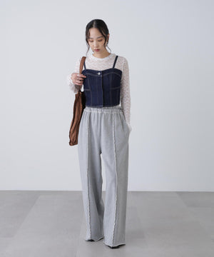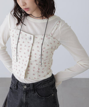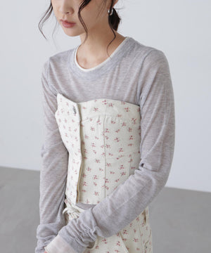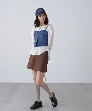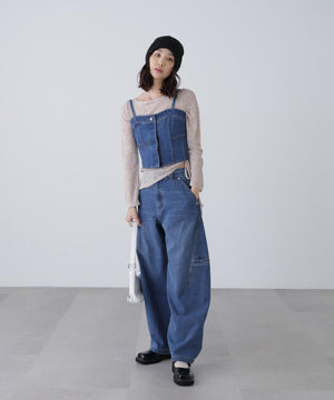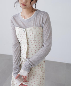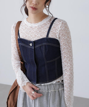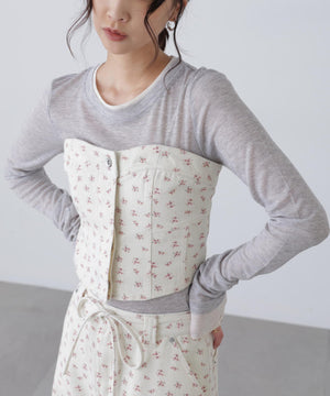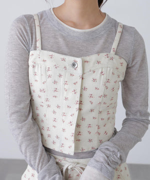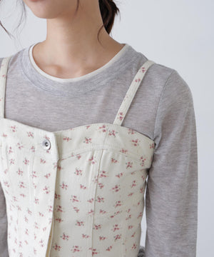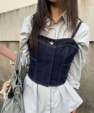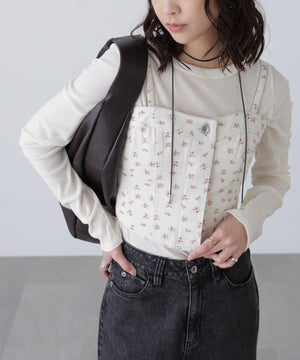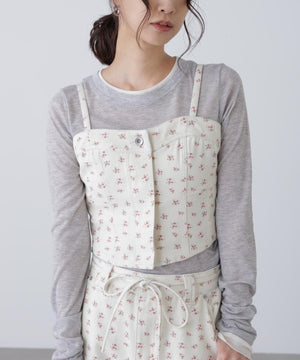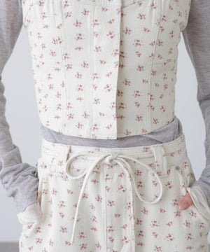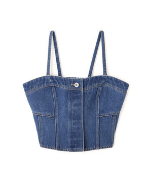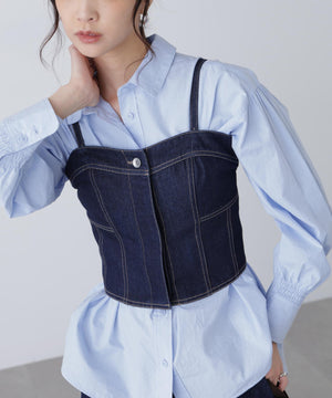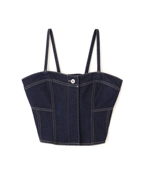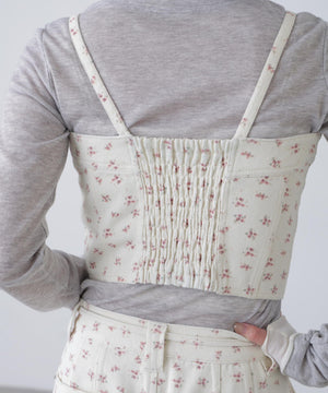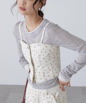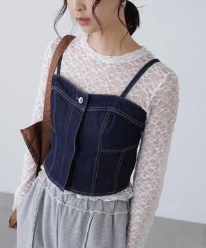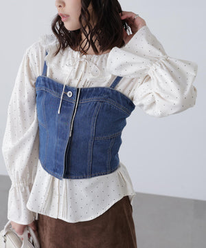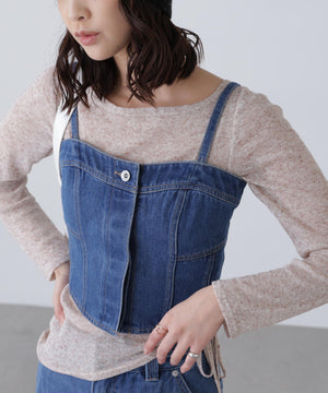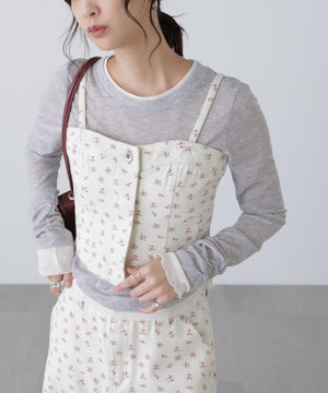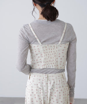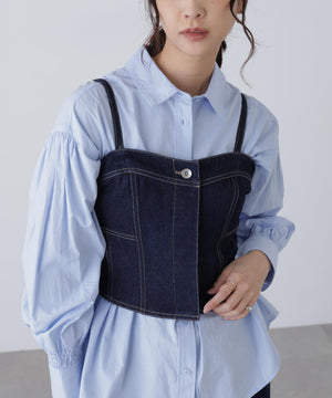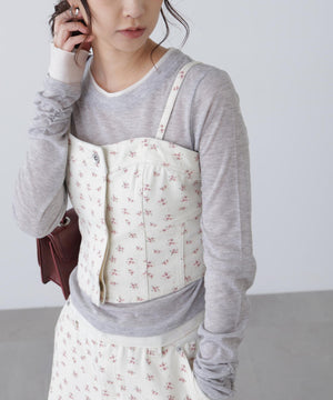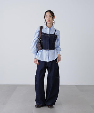 コルセットライクなパネル切り替えを入れたすっきりシルエットのビスチェ。バックシャーリング仕様で、程よいフィット感と着心地の良さも嬉しいポイントです。フロントは比翼仕立てにしてすっきりとした印象に。肩ストラップは取り外し可能なので、ベアタイプとしても着こなせます。サイドポケットコクーンデニムパンツ(店舗商品番号1316130006)とのセットアップもおすすめ。インナー次第でオールシーズン楽しめます。裾のボタンを外すと抜け感のあるこなれたスタイリングも楽しめます。デニム素材の2色と、ノスタルジックな雰囲気が可愛いトレンドの小花プリントツイル生地を揃えています。