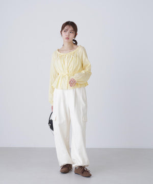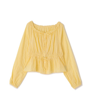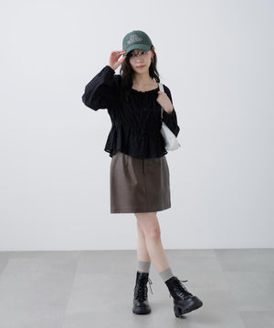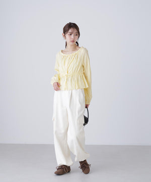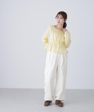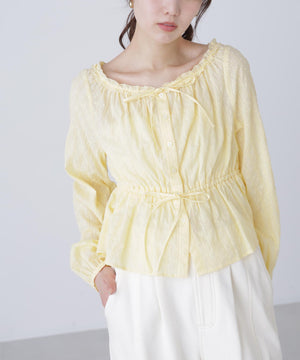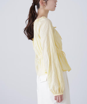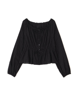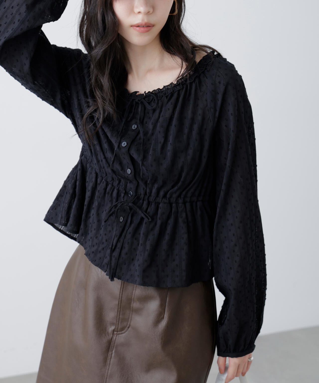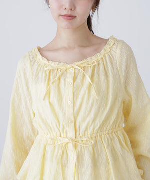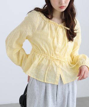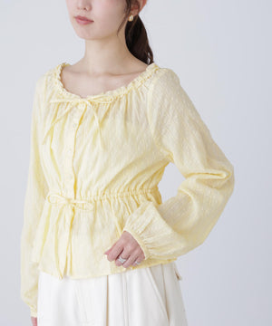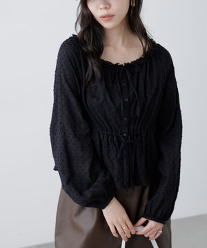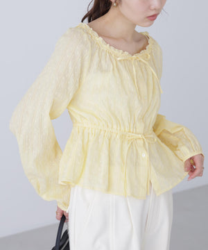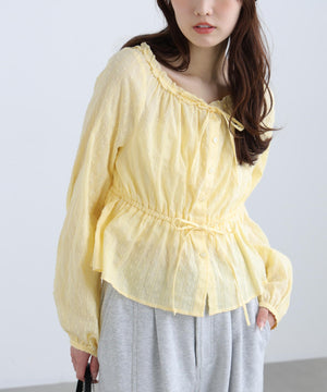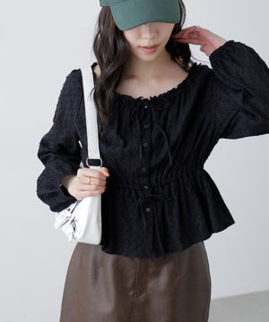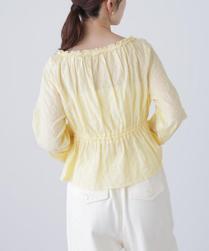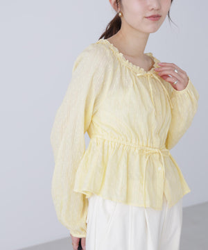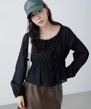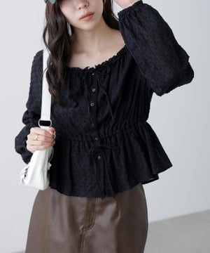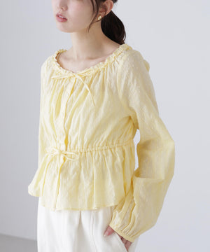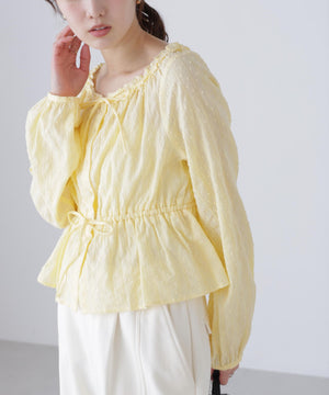 襟ぐりリボンとフリルディテールが華やかで可愛らしいペプラムブラウス。からみ織りとドビー織りを組み合わせた、凹凸感が特徴のカラミドビー生地を使用。ふんわりと軽やかな生地感ながら、ウエストマークでスタイルアップが叶います。一枚で着るのはもちろん、長袖インナーとレイヤードしたり、前開きで羽織りとしても長い期間着回せます。