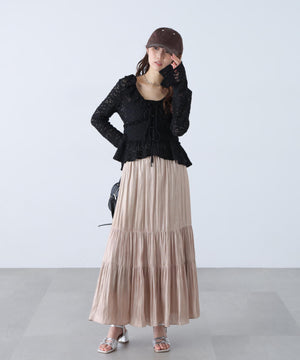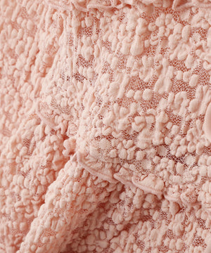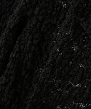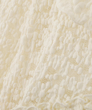 立体感のあるぷくぷくレースを使用した前開きブラウス。肉感のあるレースなのでカジュアルにも着こなせます。襟にフリル、バスト切り替えにギャザーフリルをあしらい、高めのウエスト位置とイレヘムの裾フリルでバランス良く仕上げたデザイン。袖は肘を細く、袖口に向かって広がるスリット入りフレアスリーブです。リボンと釦で開閉でき、一枚着はもちろん羽織りとしても長く活躍。日よけや冷房対策にもおすすめです。