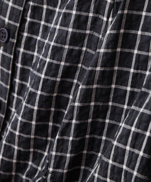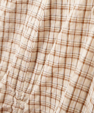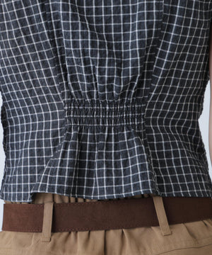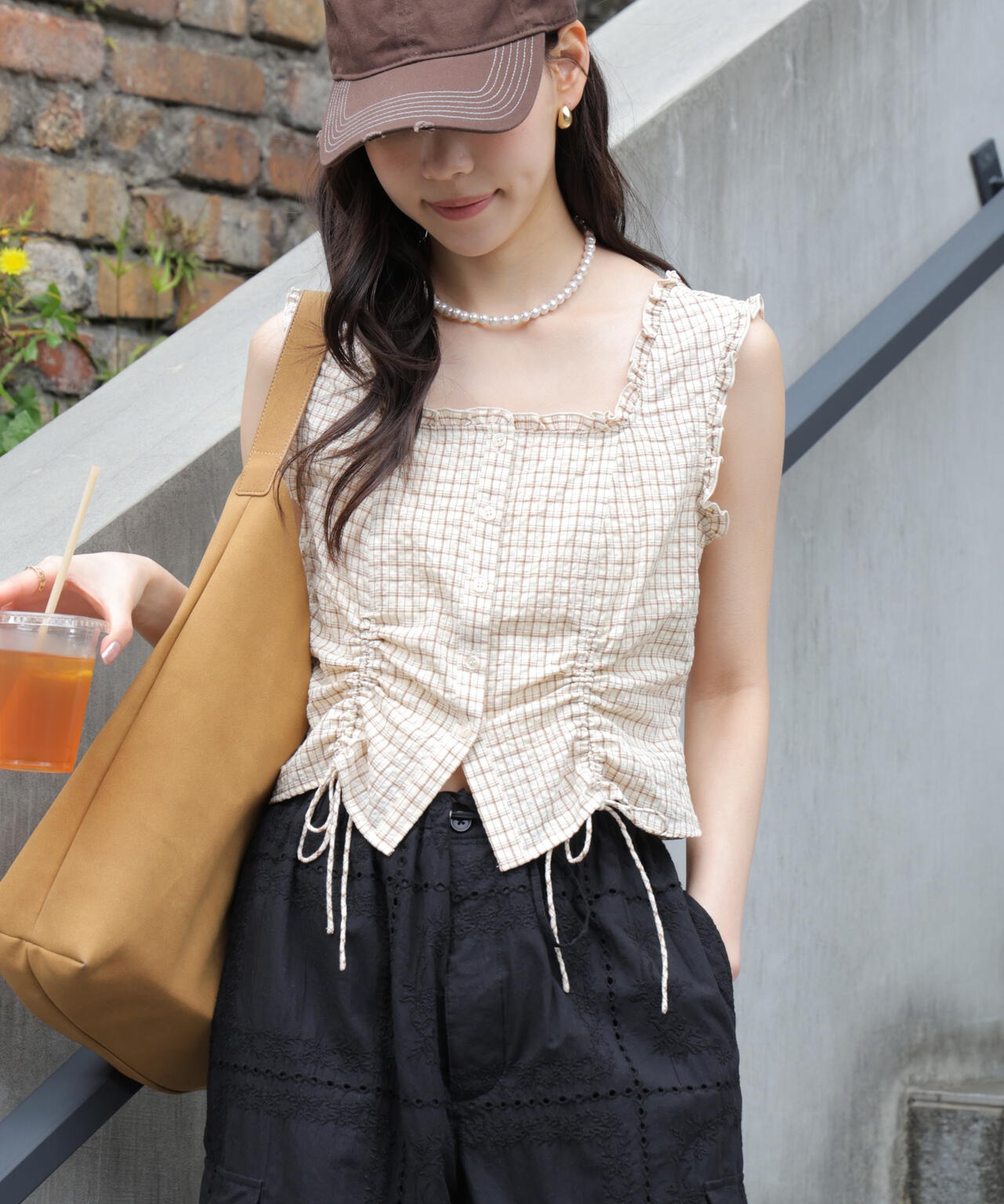 デコルテが綺麗にスッキリ見えるスクエアネックに、フロントのドロストギャザーで表情をつけたブラウス。リボンを結んだり垂らしたり、ギャザーの寄せ具合で着丈を変えて着こなせます。襟まわりと袖口には共地ミニフリルをあしらいポイントをプラス。後ろは一部シャーリングギャザーが入っているので、体に程よくフィットします。ワイドデニムやカジュアルなボトムス合わせがおススメ。清涼感のあるコットン素材なので、ラフでカジュアルな印象です。