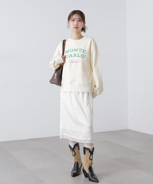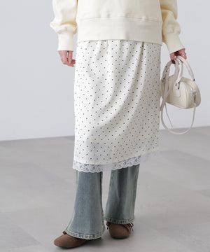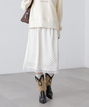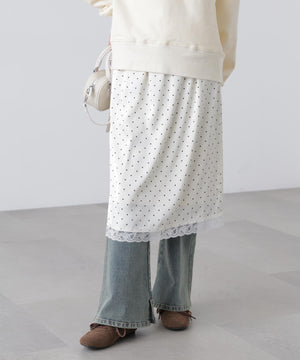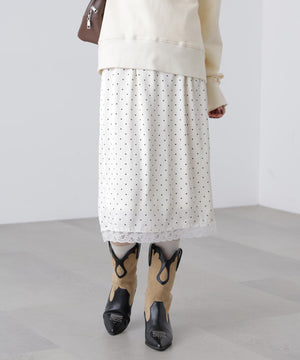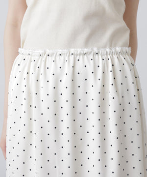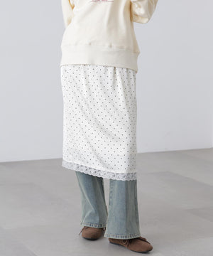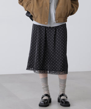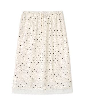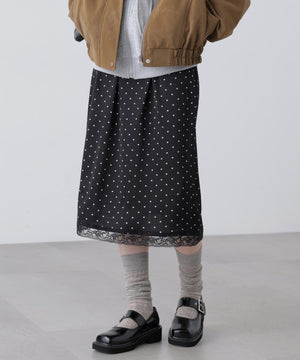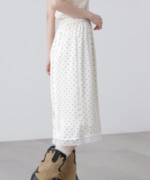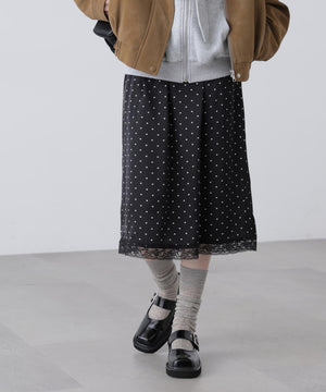 動くたびにキレイな表情を見せる、しなやかなサテン素材のミディスカート。黒ベースとホワイトベースはトレンドのドット柄でレトロな雰囲気を演出。無地はワッシャー感のあるサテン素材なのでカジュアルスタイルにもおすすめです。ランジェリーライクな華奢なレースを裾にあしらい、ウエスト部分にはピコゴムでガーリーさをプラス。ウエストはぐるりゴム仕様でストレスフリーなはき心地です。ロングブーツにミドルゲージニット合わせでカジュアルな着こなしが気分!デニムとレイヤードしてカジュアルダウンさせても今年らしくておすすめです。