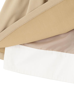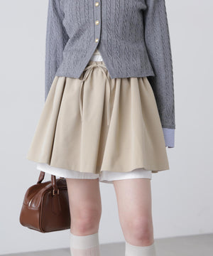 今季トレンドのインナーパンツがスカートから見える、レイヤード風デザインのミニスカート。白いショートパンツを重ねているように見せるため、ウエストと裾から別布がのぞく仕様。パンツ型の裏地にし、裾だけ白地に切り替えています。スカートでも安心のはき心地が魅力。スカートはタック&ギャザーでボリューム感を出し、ウエスト上端をフリルにしてレイヤード感を強調。トップスインするとウエストデザインが映えるスタイルに、ゆるっとしたトップスと合わせて裾を見せるレイヤードもおすすめです。カラートップスとも合わせやすい、トレンドのグレーとベージュの2色展開です。