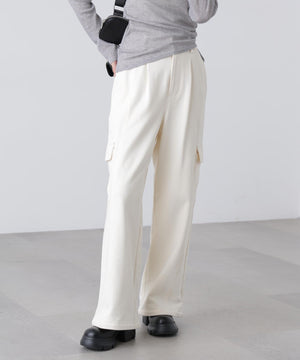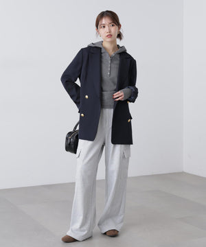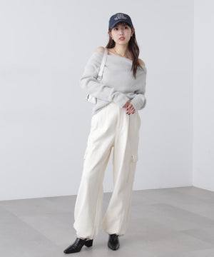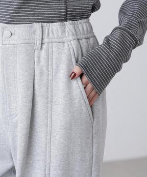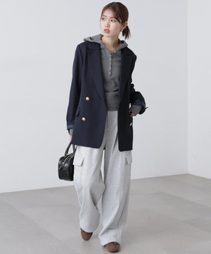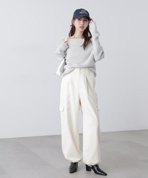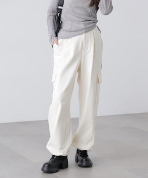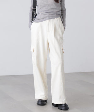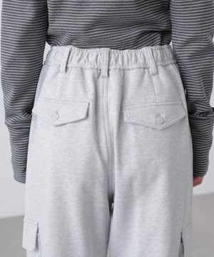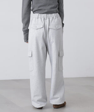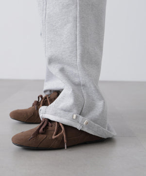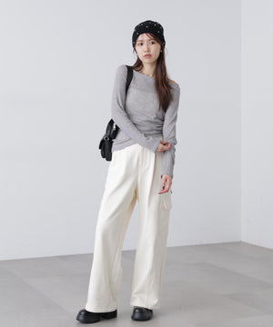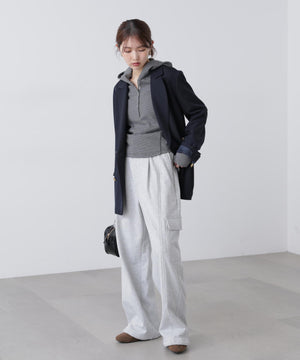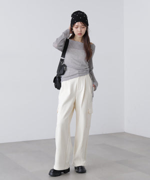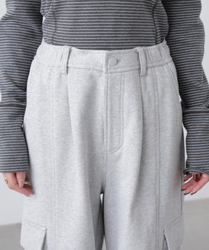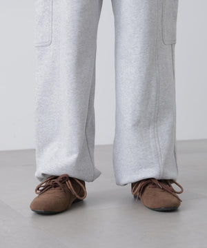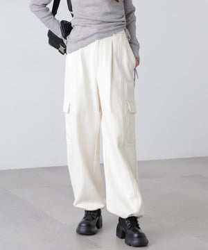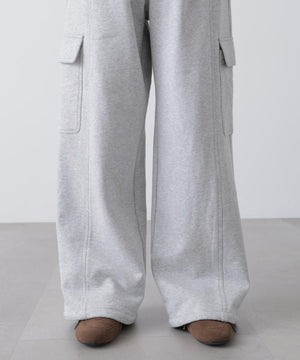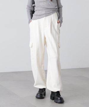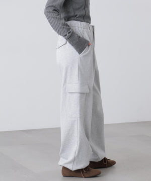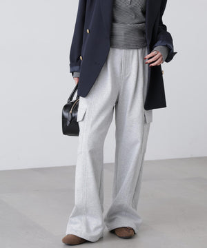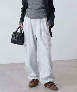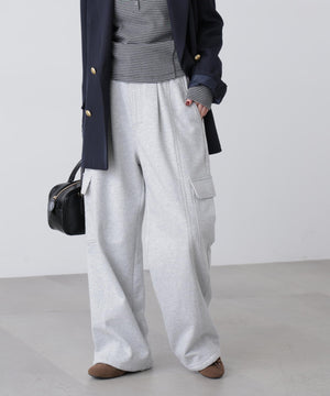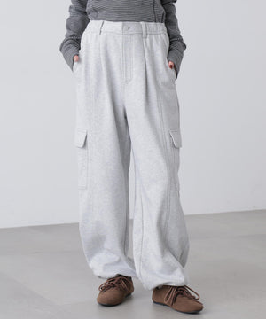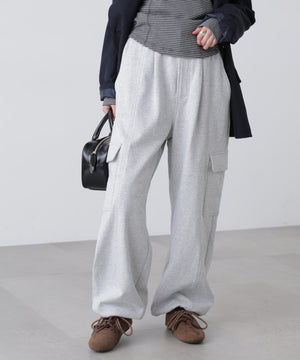程よい厚みのある裏毛を使用したカーゴパンツ。前開き仕様と布帛仕立てにすることで、スウェットなのにきちんと感のでるデザイン。フロントタックでウエストのモコ付きを抑え、トップスインしてもウエスト周りがすっきりと見えます。フロントハギでIラインを強調し脚長効果を期待。ウエストはドロストで調節できます。裾はデザインを邪魔しない隠しドロストを絞っても着られる2wayデザイン。ガーリーな甘めブラウスと合わせたミックスコーデがおすすめ!スキッパーカットソーフーディなど、コンパクトなトップスとも相性良く着用いただけます。