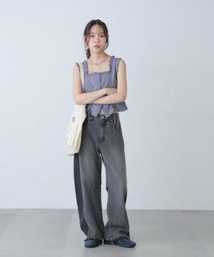 リメイク風のサイド濃淡パネル切り替がアクセントのカーブラインデニムパンツ。裾の三巻ステッチをほどいたヴィンテージ感あるデザインです。ワイドシルエットながら縦ラインを強調して、すっきりとした印象に。Tシャツやニットなど、シンプルなトップスと合わせるだけで、こなれたスタイリングが叶います。シャーリングデニムビスチェ(ブランド品番131-6110216)とのセットアップもおすすめです。