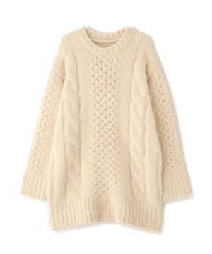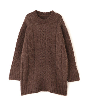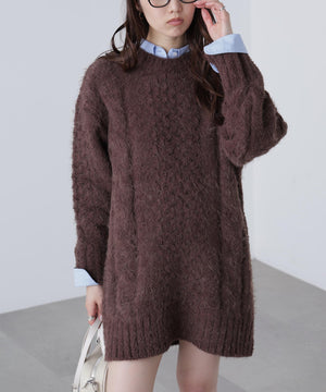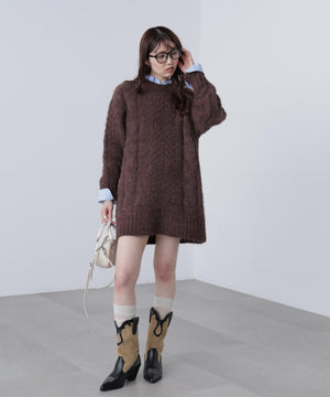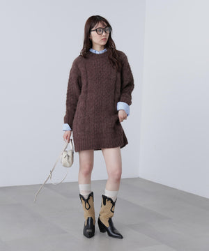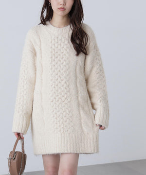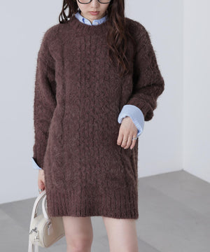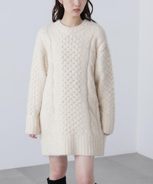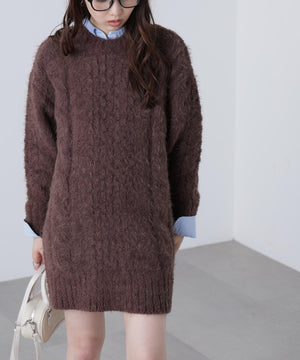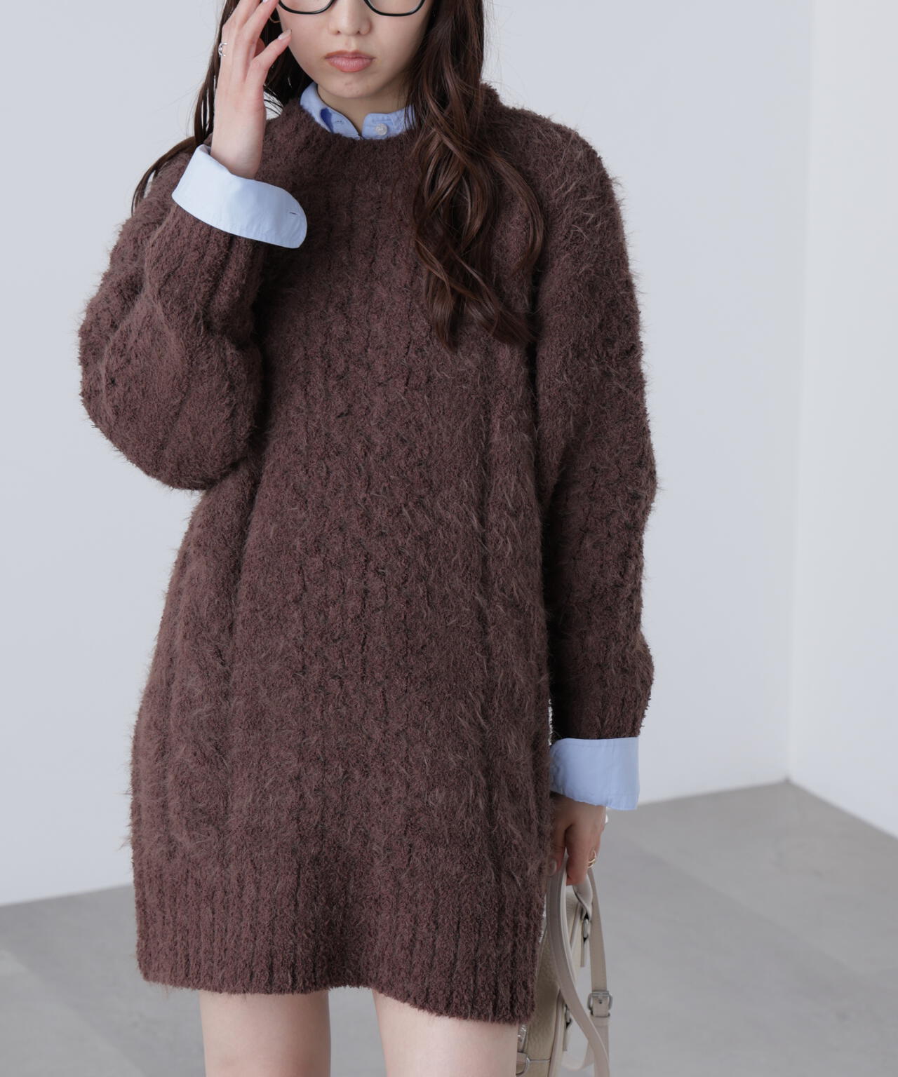見た目も着心地もふわふわなボリューム感が魅力のミニワンピース。柔らかなテディベアヤーンと、ふんわりとした毛足を持つシャギーヤーンを引き揃えて編み上げた、他にはない立体的なケーブル編みになっています。 もこもことした素材感は暖かさだけでなく、着るだけでトレンド感のあるスタイルが完成します。オーバーシルエットが華奢見えを叶え、ミニ丈でヘルシーな女性らしさを演出。 一枚で主役になる、冬のワードローブに欠かせないアイテムです。ビッグシャツをインしてロングブーツを履くと、今年おすすめのきちんと感をプラスした着こなしに。ワンピースの下に細身のデニムパンツやプリーツスカートを重ねると、チュニック風な着こなしも楽しめます。