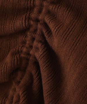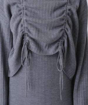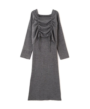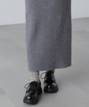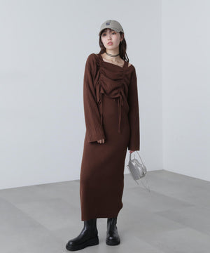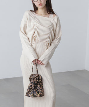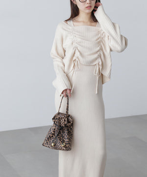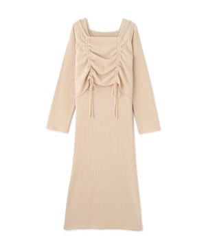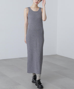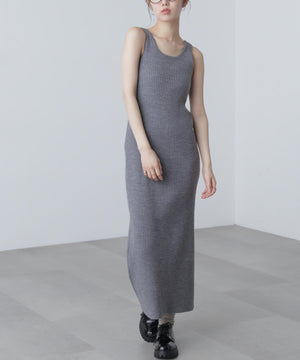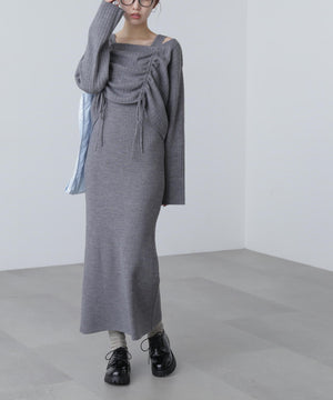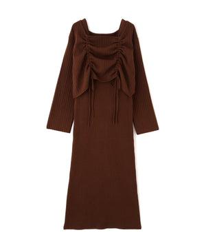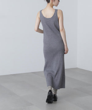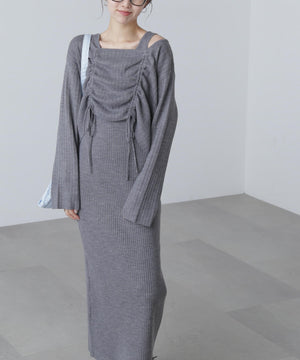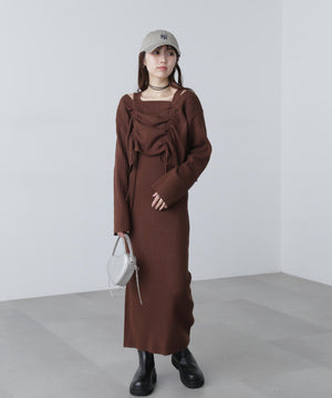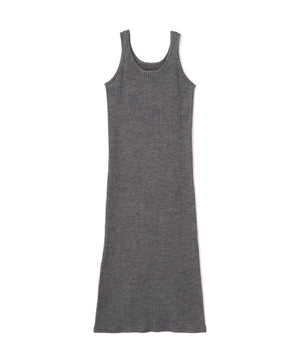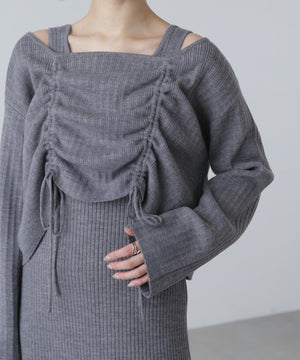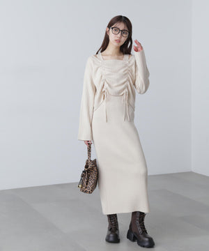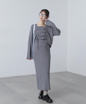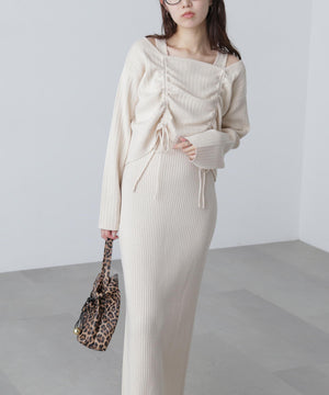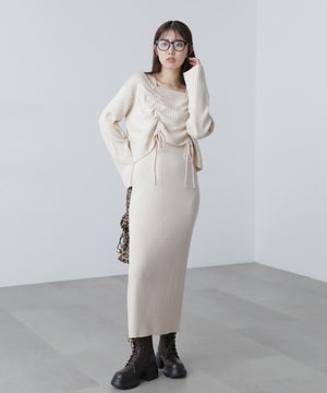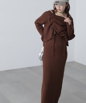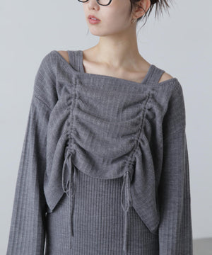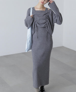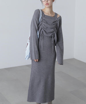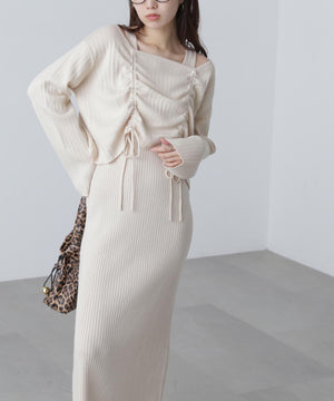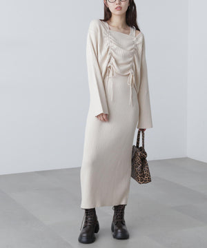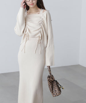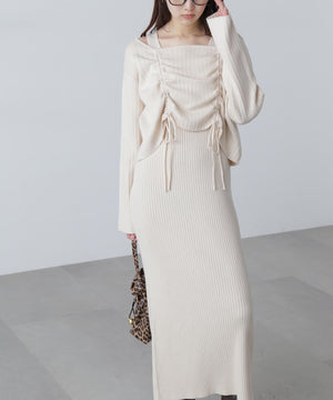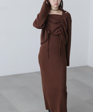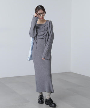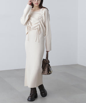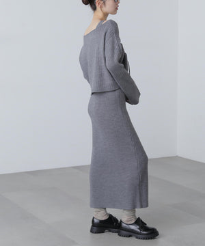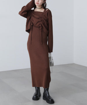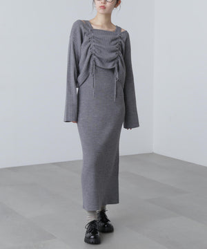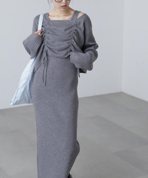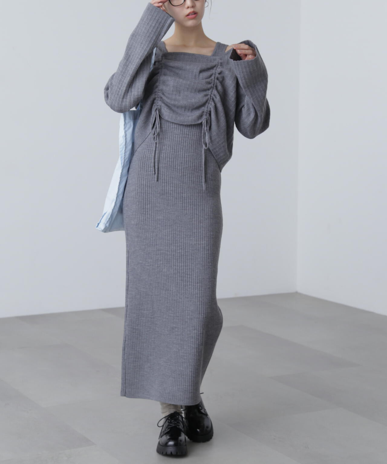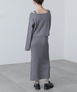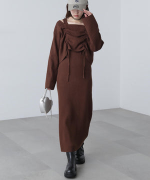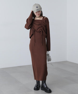 それぞれ単品使いもできるトップスとワンピースの2点セットアイテム。トップスは異ピッチのリブ編み、ワンピースはすっきりとしたリブ編みにして、編地の変化を付けています。しっかりめの編地と暖かみのある風合いで生地がダレにくくなっています。ドロストデザインが効いたショートトップスは、襟ぐりをすっきり開けているので片方の肩を下げるとワンショル風にも着こなせます。ワンピースとレイヤードすると肩紐が見える設定です。タンク型のリブワンピースはメリハリの効いたナローシルエット。着るだけでコーディネートが完成します。