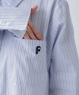 ローウエスト気味のシャツ地バルーンワンピース。ローウエストなのでカーディガンを羽織った時にバランス良く決まります。長めの袖とカフスなので、カーディガンの袖口からカフスをのぞかせるのもおすすめ。スカート部分は裏地つきで透け感を軽減。胸ポケットの刺しゅうロゴがポイントです。ニットカーディガンやパーカーを羽織り、ソックス×ローファーやスニーカー合わせがおすすめです。