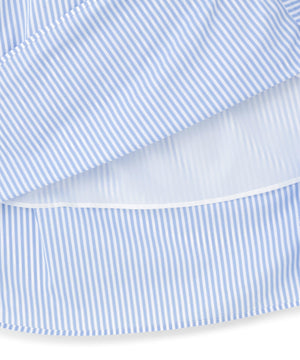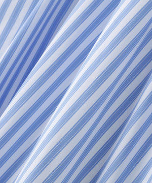 ウエストゴム仕様で自然なブラウジングを叶えるシャツワンピース。裾に向かって広がるフレアシルエットで、レディライクな印象に仕上げています。両脇ポケット付き。一枚着るだけでサマになるデザインです。無地2色(オフホワイト・サックス)と先染めストライプ1色を揃えています。無地は程よい厚みのツイル素材を使用し、さらっとした肌触りが特徴。スカート部分は裏地つきです。