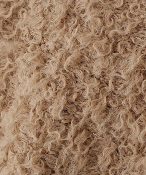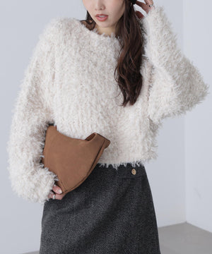 プードルのような毛足がウェーブした可愛らしい生地が特徴のニットソー。ニットソーなので、ニット特有の伸びや垂れを抑えながら着用いただけます。オーバーサイズのクロップド丈で、ボトムスとバランスが取りやすいデザイン。カジュアルな風合いのトップスなのでボトムスはデニムパンツやチノパンツがおススメです。