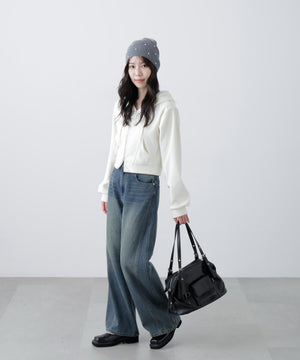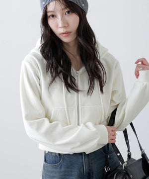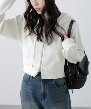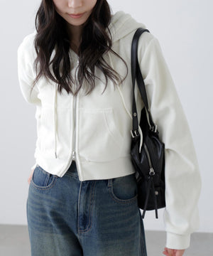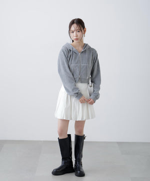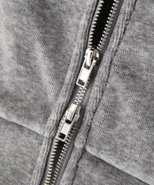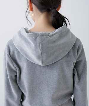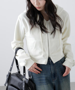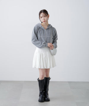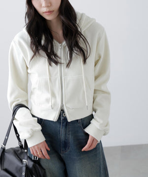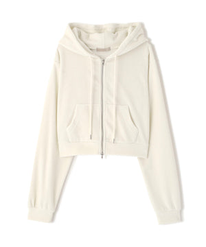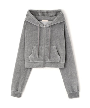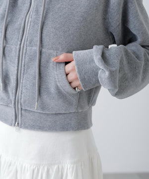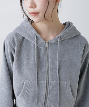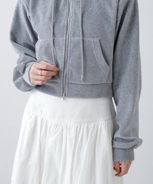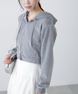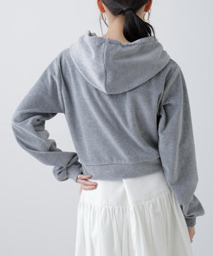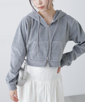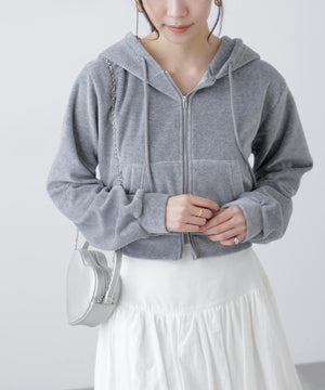 コンパクトな丈感のベロアパーカー。ほんのり光沢のあるベロア素材がコーデのアクセントになってくれます。フロントポケット付きで実用性もプラス。逆開きファスナーにより、上下の開閉が可能で着こなしの幅が広がります。デニムパンツ、シャイニーティアードスカート(ブランド品番1316120200)合わせもおすすめです。コーディネートに合わせやすいオフ白とトップグレーの2色展開です。