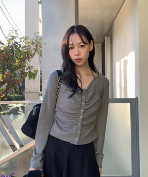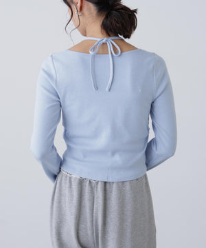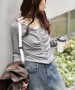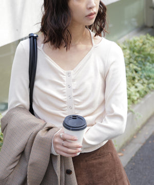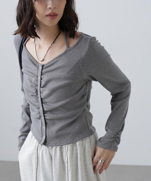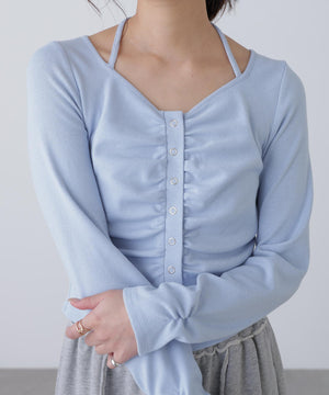 ギャザーが映えるデザイントップス。ウォーム感と伸縮性のある肌触りの良い天竺ジャージ素材を使用しており、体にフィットするサイズです。スナップ釦は裾から1つか2つ外して、ボトムスのウエストを見せる着こなしがおすすめ。襟は広めながらホルター紐で着やすくなっています。身頃とウエストの高い位置にギャザーが入り、スタイルアップを期待。ボリュームのあるバレルパンツや、膝丈のナロースカート×ローファーでY2Kスタイルもおすすめです。