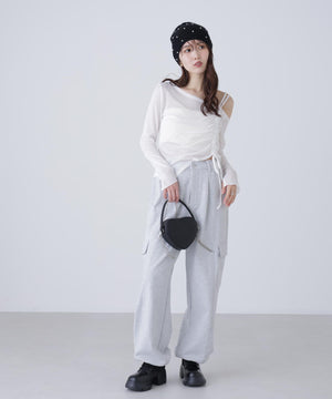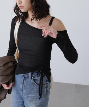 柔らかいタッチのシアーカットソー素材のカットソー。ワンショルデザインで肩紐から前身頃までドロストをあしらい、ギャザーを寄せて立体的なデザインに。裾もアシメトリーなヘムにしてポイントを付けています。袖口はスリットを入れて抜け感をプラス。コンパクトなシルエットなので、ワイドデニムでカジュアルな着こなしがおすすめ。フェイクレザースカパン合わせで辛目スタイリングもイチオシです。