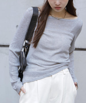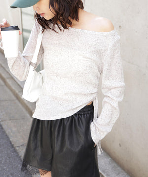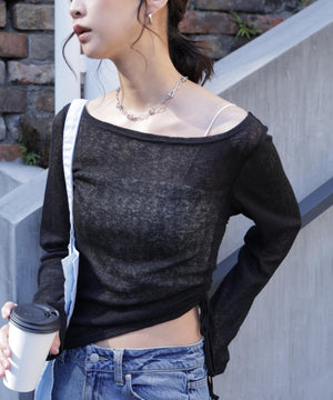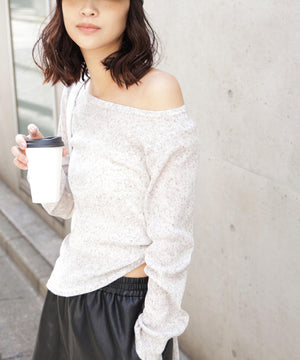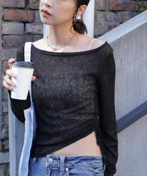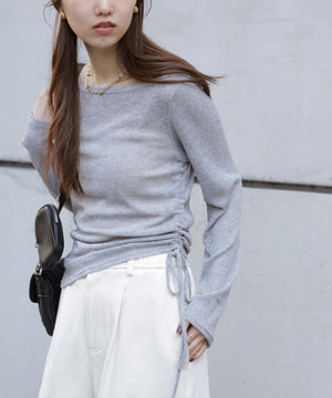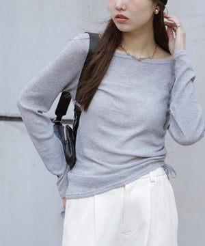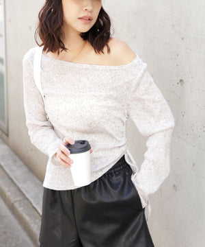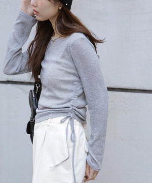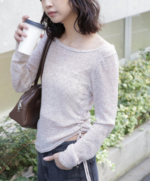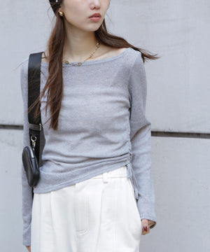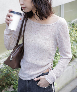 メランジ調のニットソー素材のデザイントップス。メランジカラーでカジュアルな雰囲気を演出し、シンプルながらもアクセントになるカットソーです。裾はアシンメトリーヘムデザインで、左脇は共地リボンで絞れるドロスト仕様。首は広めで抜け感があるのでカットソー同士のレイヤードや、ジャケットやカーディガンのインナーとしてもバランスよく着られます。ポイントはアシメヘムなので、シンプルにデニムパンツを合わせるだけでもスタイリングが決まります。