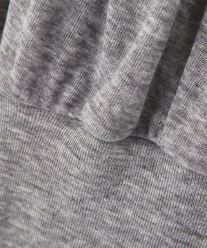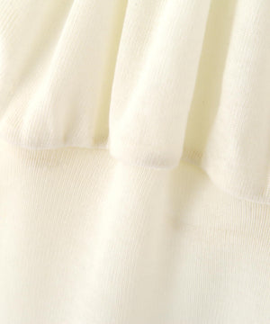 シアー感とメランジ調のあるカットソー生地を使用したトップス。襟ぐりから肩にゴムを入れており、オフショルとして着られます。バスト切り替え上にはギャザーでボリューム感を出し、切り替え下はタイトにしてウエストをすっきり見せるシルエットに。中にカラーや柄のキャミソールを合わせたり、長袖レースインナーとのレイヤードも楽しめます。