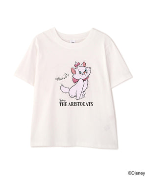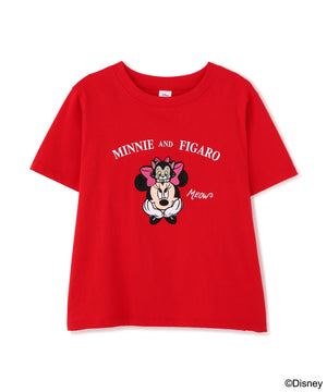 ディジニーの人気キャラクター「ミニーマウス」と「フィガロ」、『おしゃれキャット』の「マリー」のロゴ入りプリントTシャツ。肌触りの良いコットン100%の天竺素材。ぴったりしすぎずどんなスタイリングにもなじむサイジングです。ミニー、マリーのトレードマークであるリボンにピンクの刺繍を施しているのがデザインポイント。