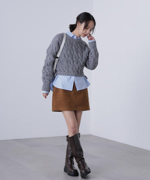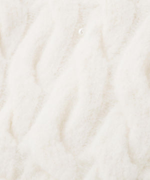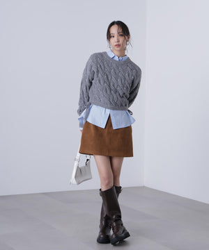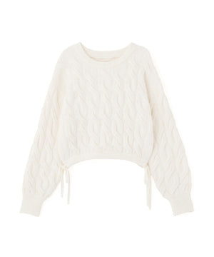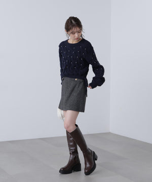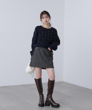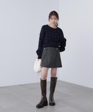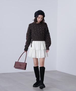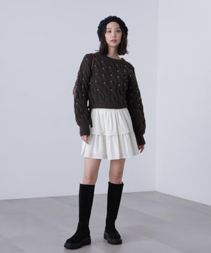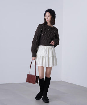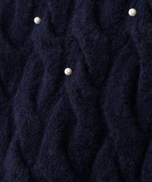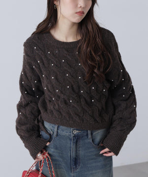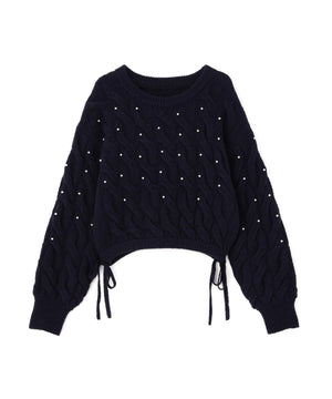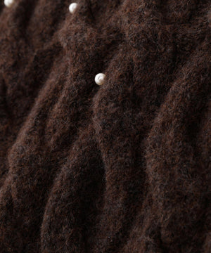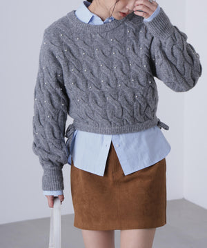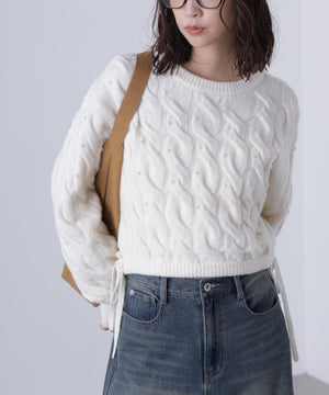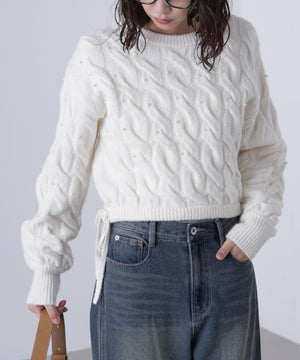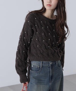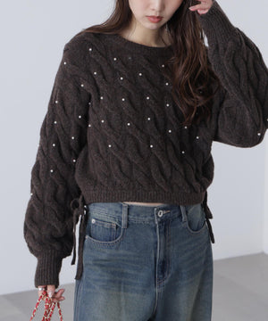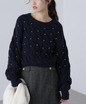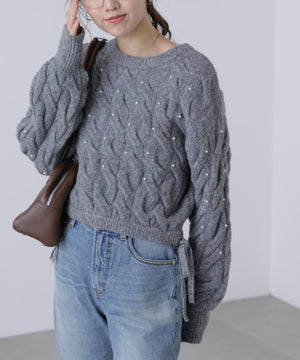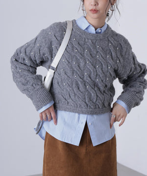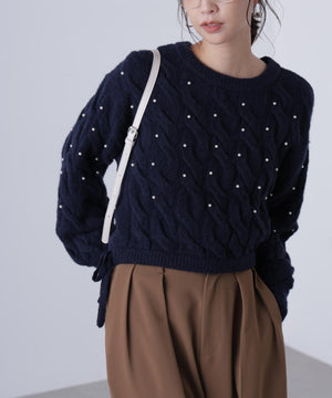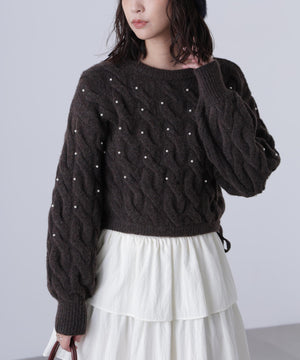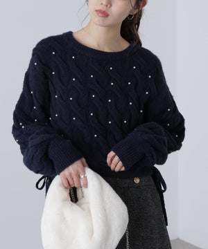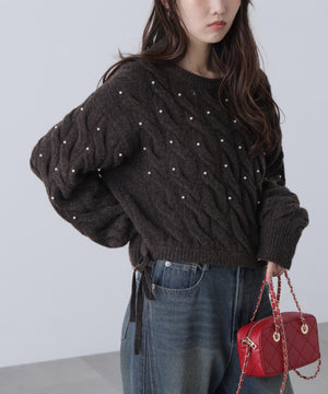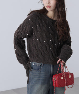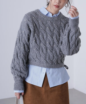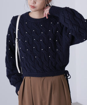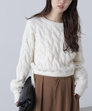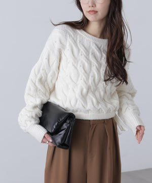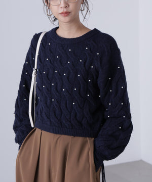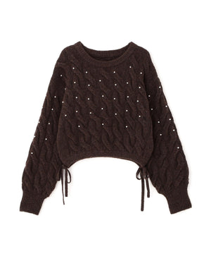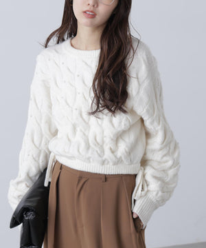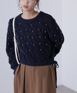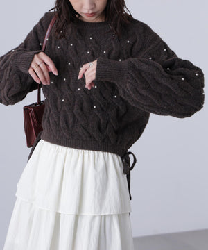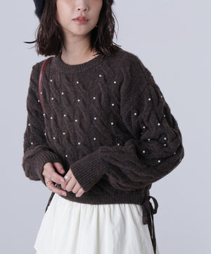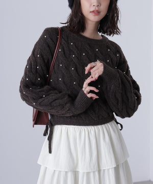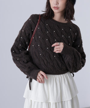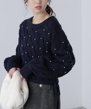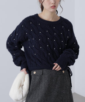 昨シーズンご好評いただいたニットが、新色ブラウンとネイビーを加えて登場!ふんわりとしたケーブル編みにパール調ビーズを散りばめた、トレンド感のある華やかなニット。今季は膨らみのあるソフトなタッチの糸に変更し、アウターインしやすくなっています。ショート丈なので合わせるボトムスを選ばず、袖はドロップショルダーで程よくリラクシーな印象に。襟まわりから肩、ひじにかけてランダムにパール調ボタンをあしらい、顔まわりを華やかに演出します。裾は平ゴムでふんわりとさせ、さらに脇に施した共地リボンで結び具合いを調整できます。着るだけで目を惹く華やかな1枚なので、コーディネートの主役に。スカートでもパンツでも合わせやすいアイテムです。