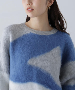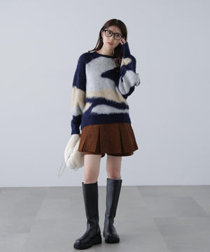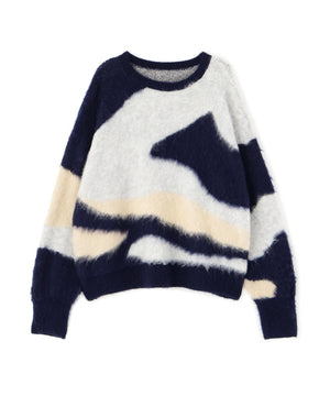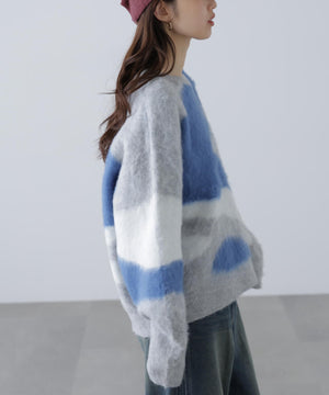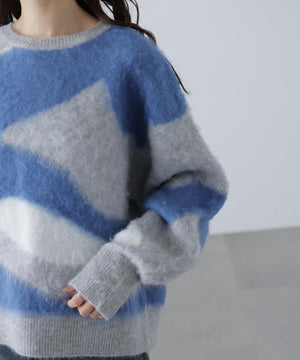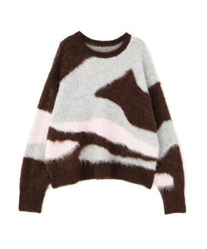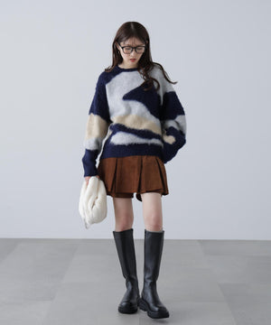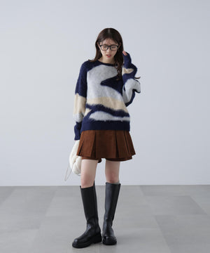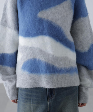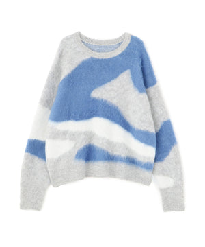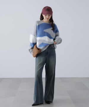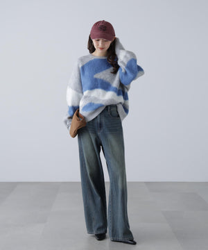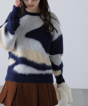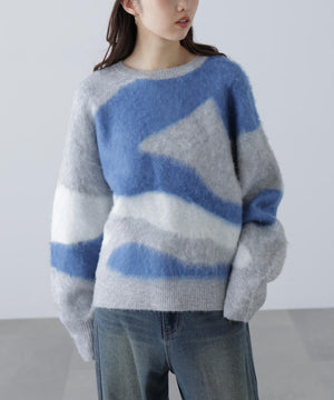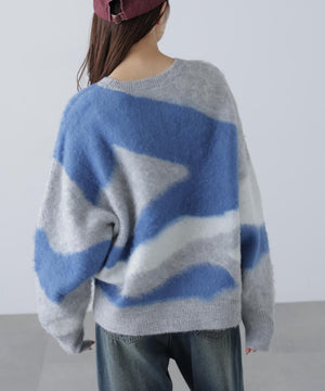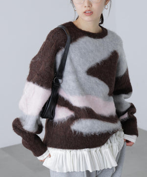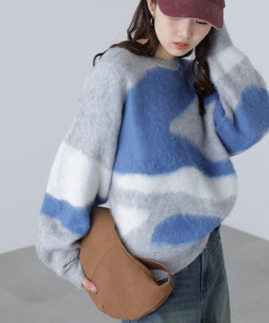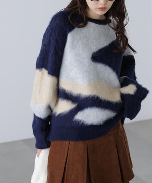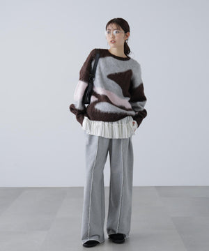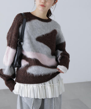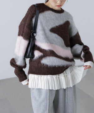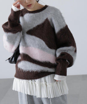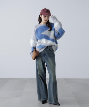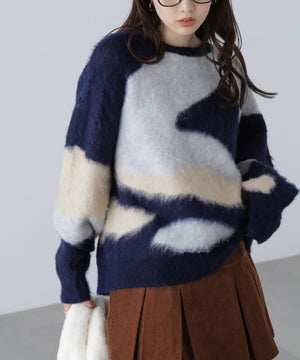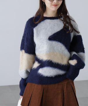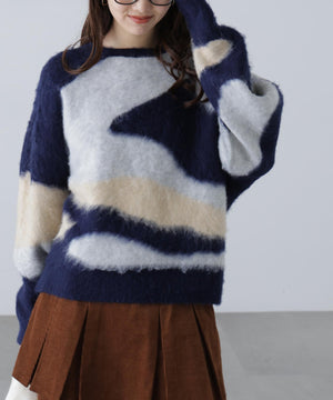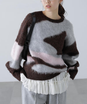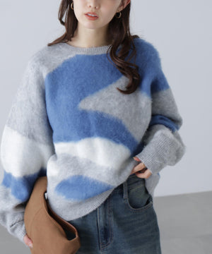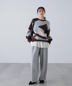 ニュアンス柄のダブルジャカード編みに起毛加工を施したウォーム感のあるニット。ニュアンス柄でインパクトがあり、ゆるっとしたオーバーサイズのため、カジュアルに着ていただけます。ゆるっとしたシルエットなので、デニムに前裾だけタックインをして着こなすのがおすすめ。ナロースカートを合わせると大人っぽく着用いただけます。
