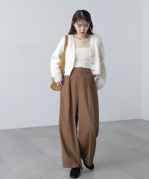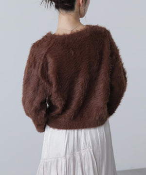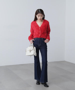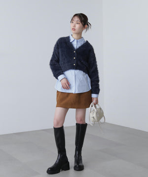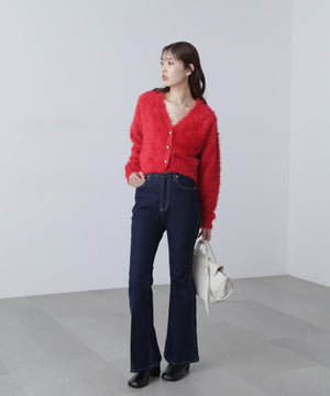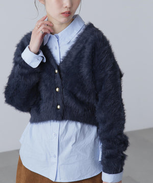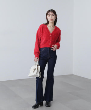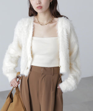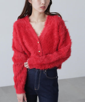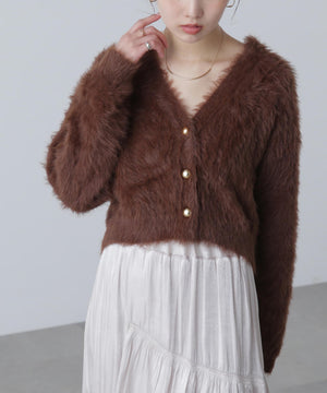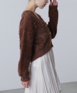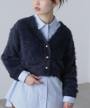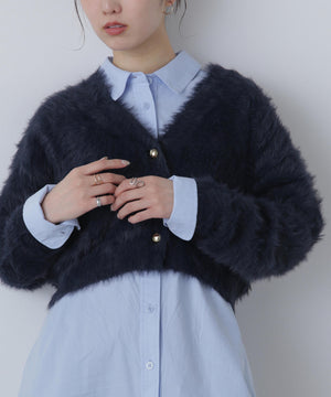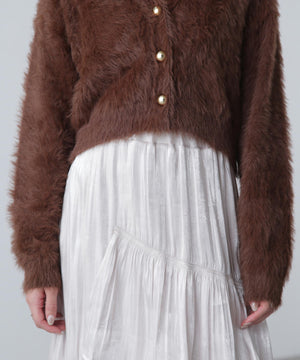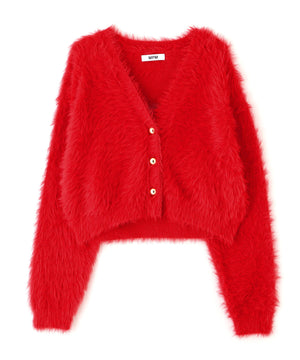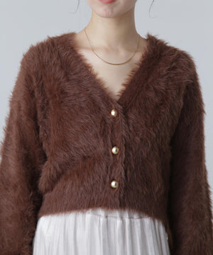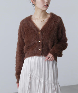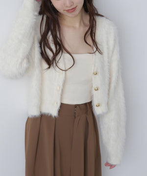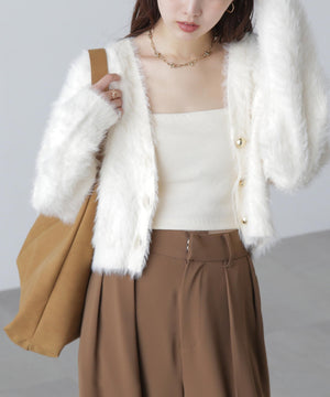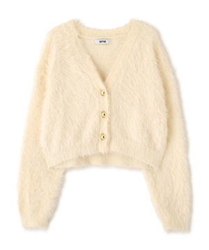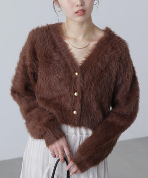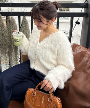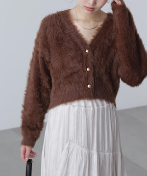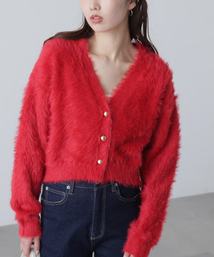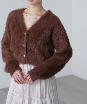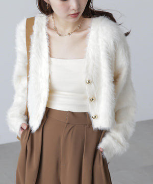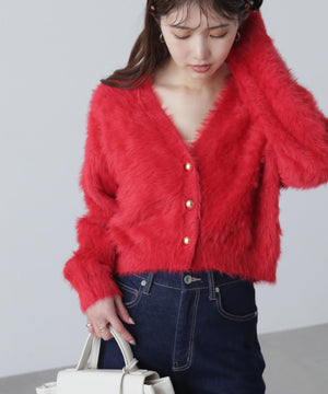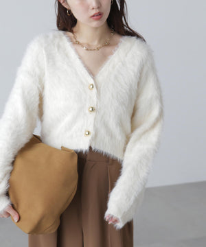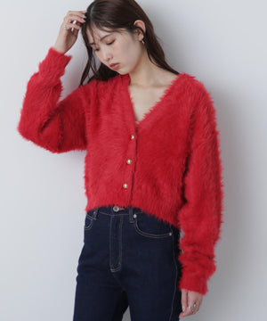 【人気インフルエンサースタッフ@h_kana43コラボ企画】【一枚で主役級!低身長さんもぴったりクロップド丈カーディガン】ふわふわで柔らかな手触りのロングシャギー素材を使用しています。ふわふわ素材に丸い金色ボタンを施したホリデームードあふれるデザイン。クロップド丈なので、どんな骨格・どんな身長の方も取り入れやすいです。ティアードスカートやデニム合わせ、キャミワンピースとも相性もバツグンです。