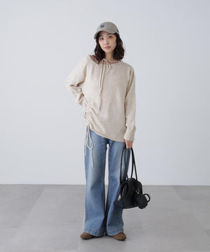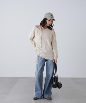 杢調の肌触り柔らかいウール混糸を使用したオーバーサイズのニット。首元をワンショルダーにして抜け感をプラスし、裾片側に長さ調節できるドロストを取り入れて、ボトムスとバランスが取りやすいデザインになっています。ワンショルダーで着る時に肩から落ちすぎないよう共紐チョーカー付き。共紐チョーカーは取り外し出来ます。ミニスカートやショートパンツにブーツがおすすめ。イレヘムキャミワンピース(店舗商品番号1316140101)とのレイヤードスタイリングもおススメです。