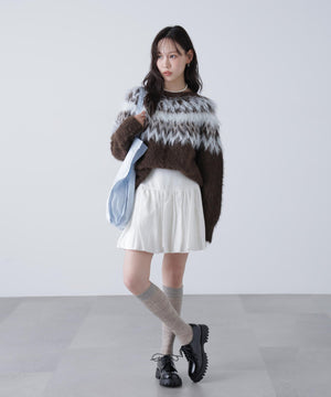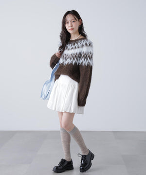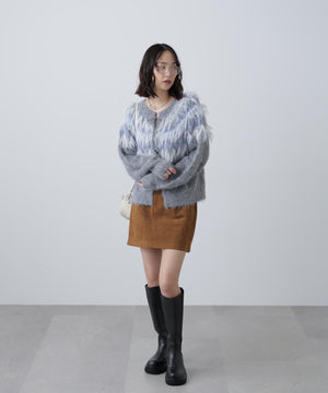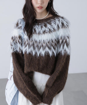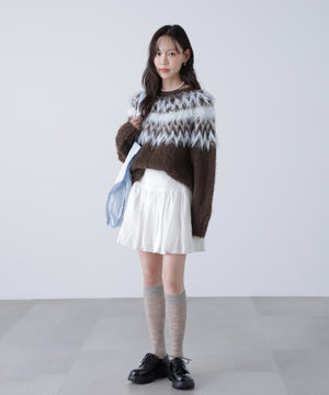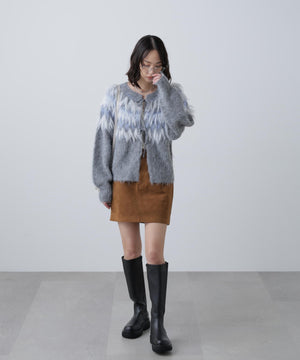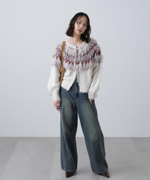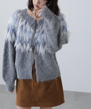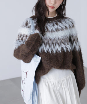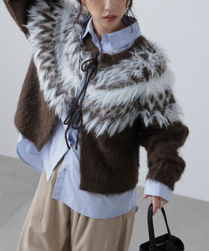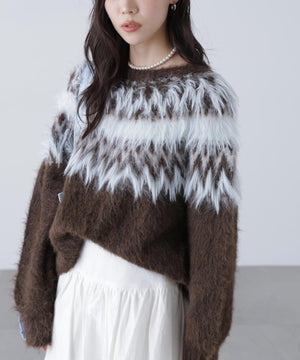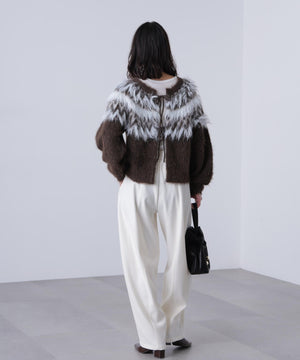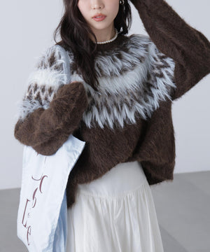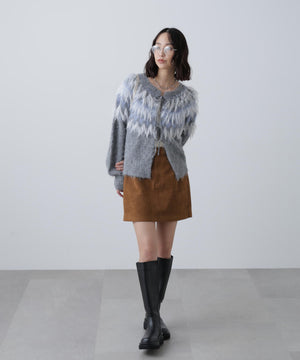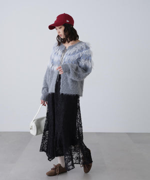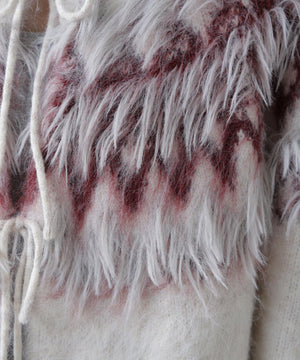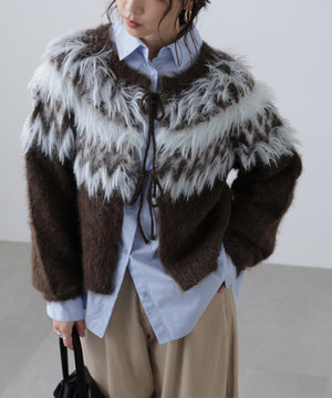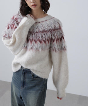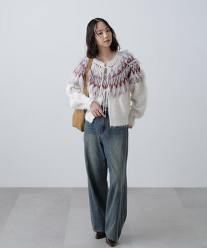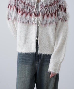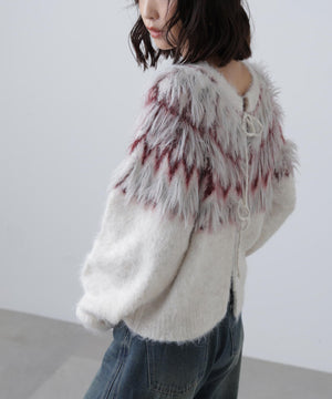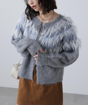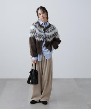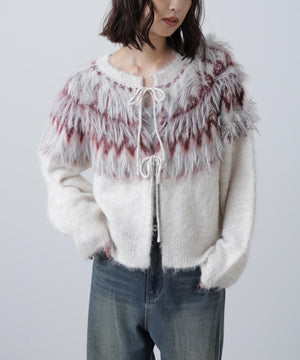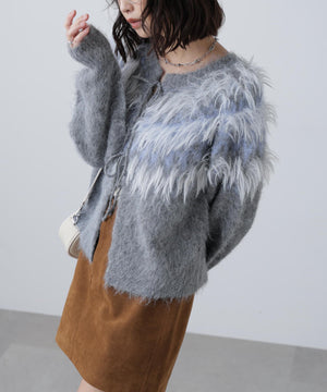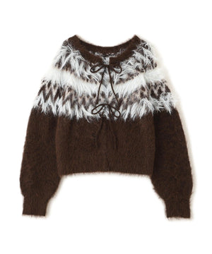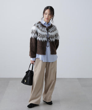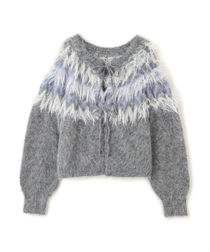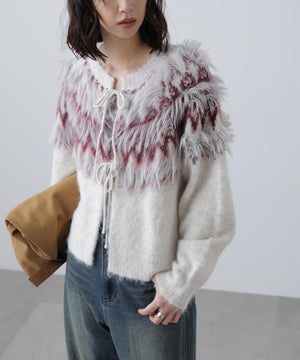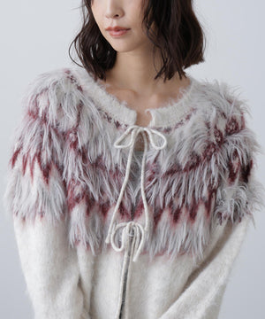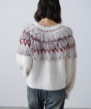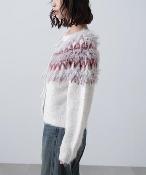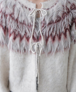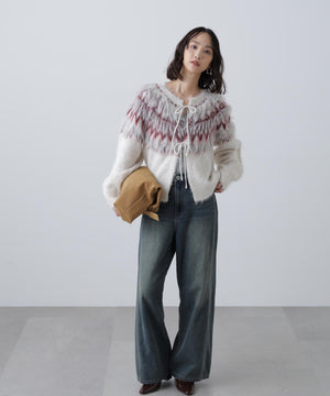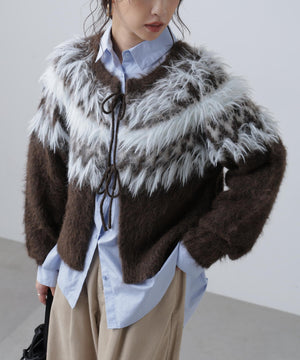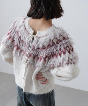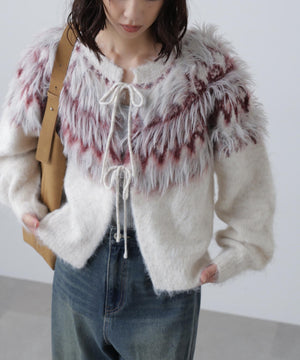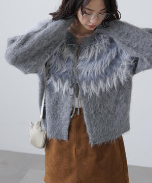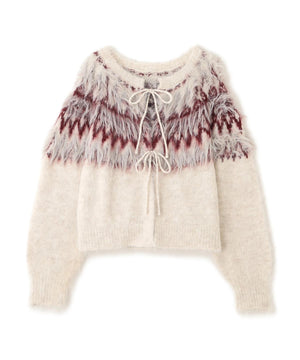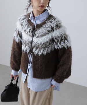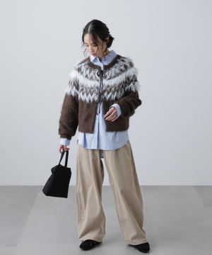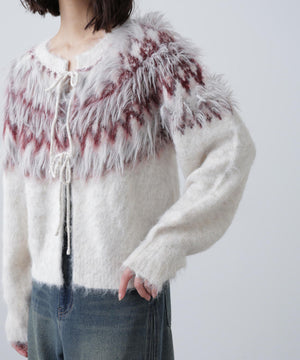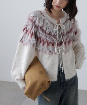 アウター代わりにもなるリラクシーなサイズのノルディック柄ニット。柄の一部にシャギーヤーンと起毛加工を入れる事で、より柄が柔らかな印象と暖かみがあり合わせやすくなっています。ふんわりと柔らかいタッチでアウターインしてもモコモコしにくいのがうれしいポイント。リボン開きでカーディガンに、リボン面を後ろにするとプルオーバーとしても2wayで着用いただけます。程よいオーバーサイズながら素材特有の落ち感のあるシルエットのため、ワイドなボトムやスカートとも相性バツグンです。
