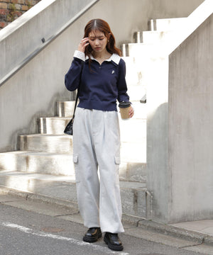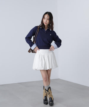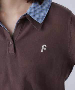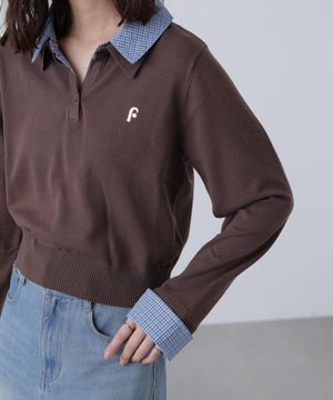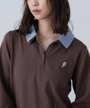 ご好評いただいているポロニットに長袖が登場!グレーとネイビーは人気色、秋らしいブラウンはブルーチェックの襟とカフスを付けた新色です。綿タッチのニットポロにシャツをレイヤードしたようなドッキングデザイントップス。トレンドのレイヤードスタイリングが1枚着るだけで完成します。左胸にはブランドロゴの頭文字を取った「F」刺しゅう入りでプレッピーな雰囲気に。ミニスカート合わせでヘルシーなプレッピースタイリングが今年らしくておすすめ。袖はたくし上げたり、カフスは伸ばしたままでも折り返しても着ていただけます。