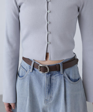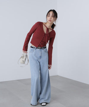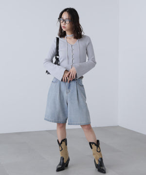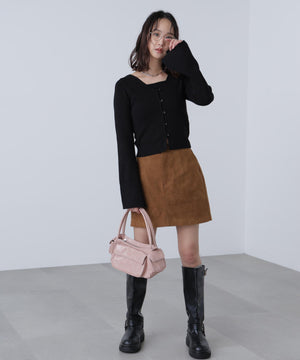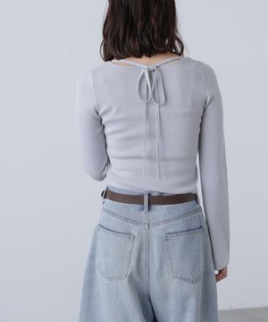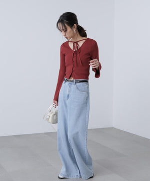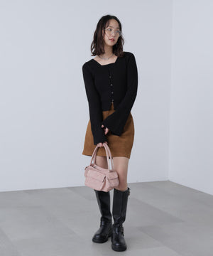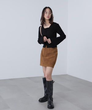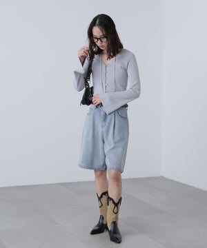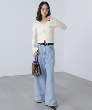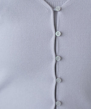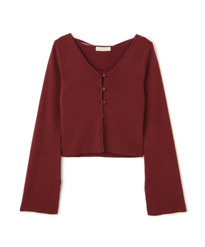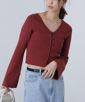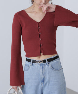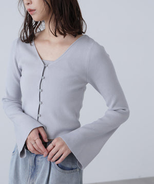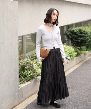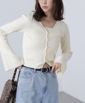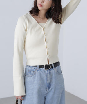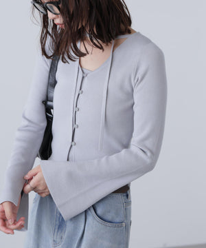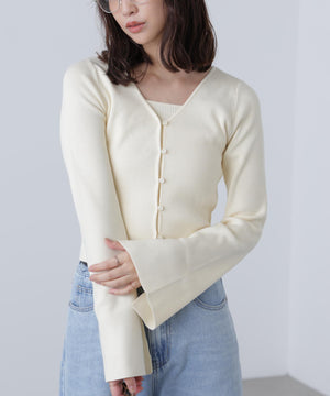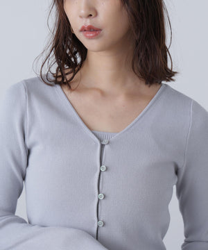 昨年ご好評いただいたカーディガンが今年も登場!ニットカーディガンの中にキャミソールをドッキングしたレイヤードアイテム、2wayで着方を楽しめます。カーディガンは総針で、フラットな目面でしっかり型崩れしないよう目の詰まった編地です。インナー部分はリブ編みで、同じ糸でも表情の変化が出るようにしています。タイトめのシルエットで体をきれいに見せてくれ、フレア袖にはスリットを入れてポイントをプラス。2way着用方法、(1)キャミ部分は前身頃のみに内蔵されているので、キャミ部分を後背面にして体を通すとカーディガンとして着られます。(2)キャミ部分を前身頃にして体を通すと、カーディガンの中にキャミを着たレイヤードした見え方に。