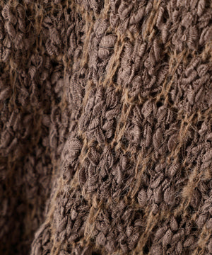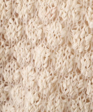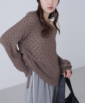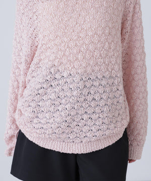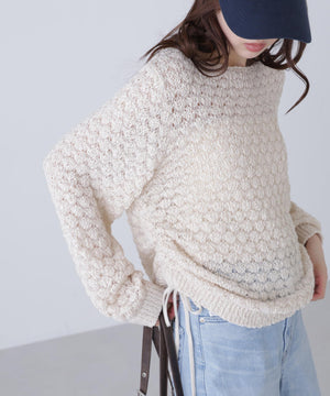 ラスティックな雰囲気のざっくりとしたオーバーサイズニット。テープヤーンと細糸を引きそろえたポコポコとした変わり編みで、立体感のある仕上がりです。ヒップが隠れるくらいの丈感は、両脇のドロストリボンで着丈調節が可能。ボートネックでワンショルダーとしても着用でき、抜け感をだしたラフなデニムスタイルもおすすめ。ミニボトムを合わせるとミニワンピース風にも着回せます。