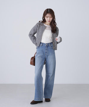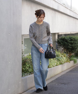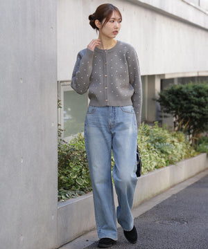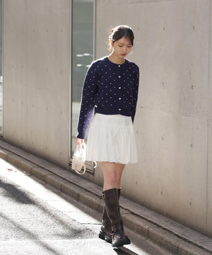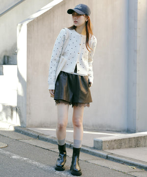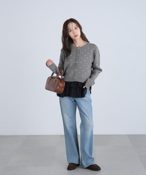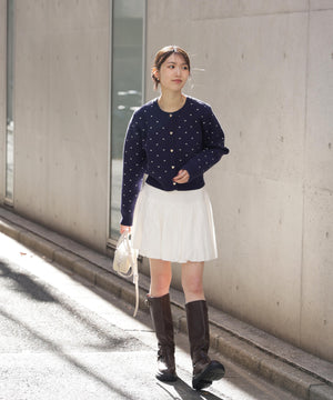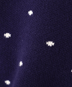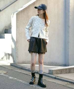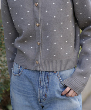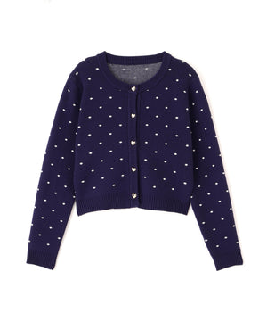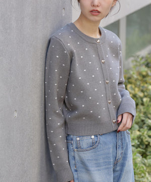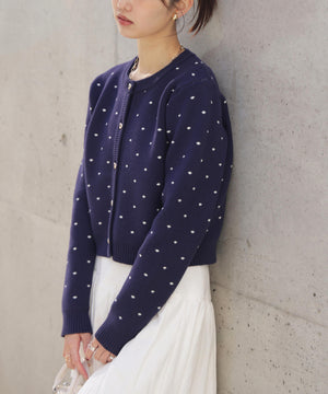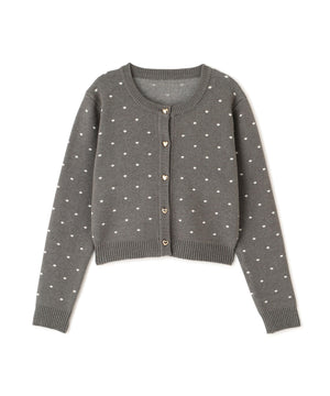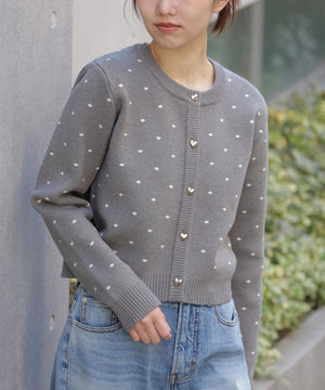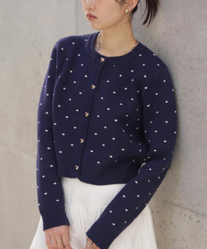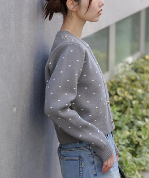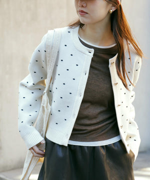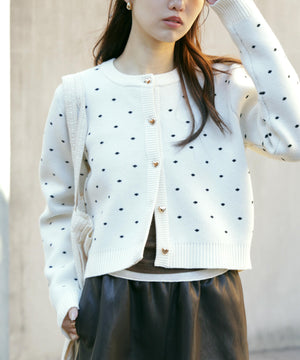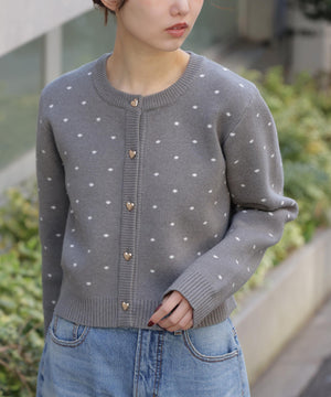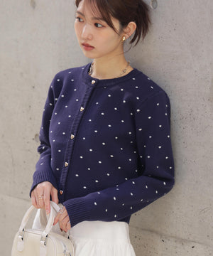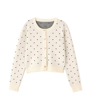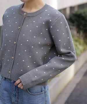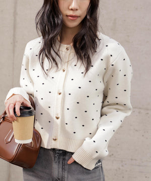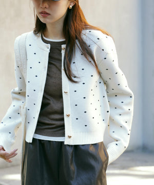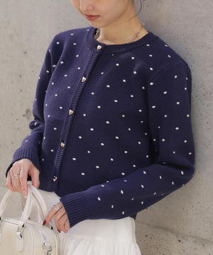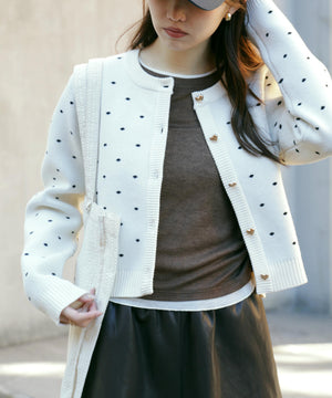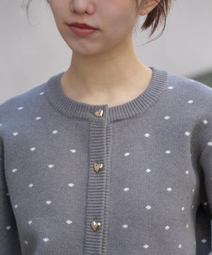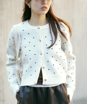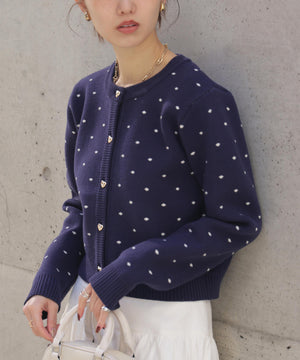 コットンアクリルのダブルジャガード編みをミドルゲージで仕上げた、ふっくらとした風合いのカーディガン。主張しすぎない小さめのドット柄と、ゴールドカラーのハート型ボタンが愛らしさを演出しつつ、コットン混素材で程よくカジュアルな印象に見せてくれます。デニムと合わせたカジュアルスタイリング、バルーンシャツミニワンピース(ブランド品番131-6140201)合わせもおすすめです。