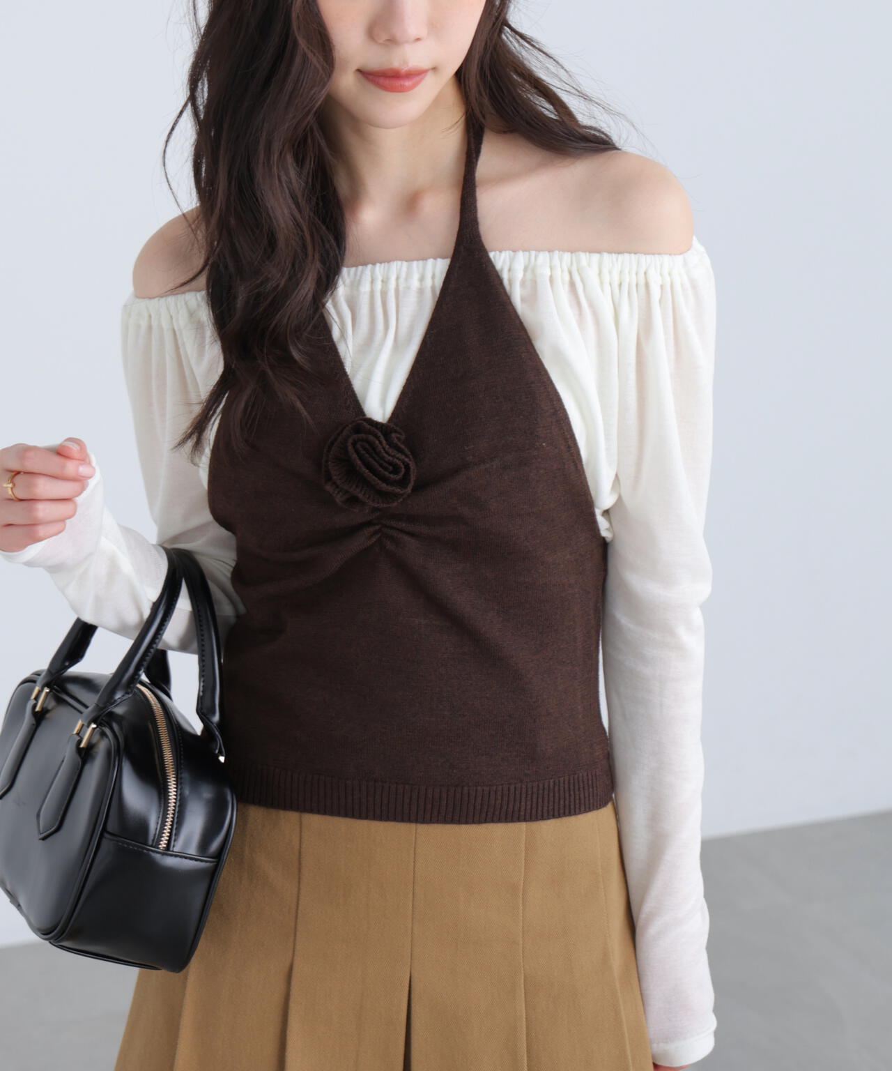 注目トレンドのホルターネックニットベスト。ハイゲージの天竺編みにプレーティングを施し、ほどよい中肉厚に仕上げています。フロントギャザーと同素材のフラワーモチーフのコサージュがポイント。後ろ身頃バストには平ゴムを内蔵して安定した着用感に。ハギ目のないホルターネックは、附属を省いたすっきりキレイな仕上がりです。シアーロンTやラグランTシャツ、シャツとのレイヤードがおすすめです。デニムはもちろん、膝丈ナロースカート×ソックスでY2Kスタイルも楽しめます。