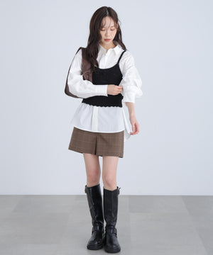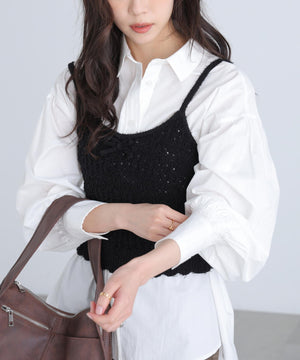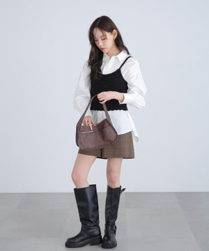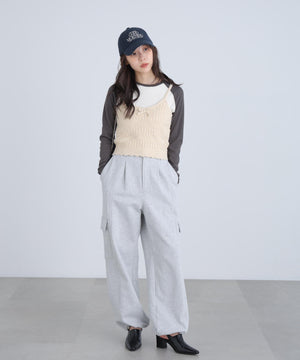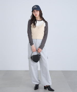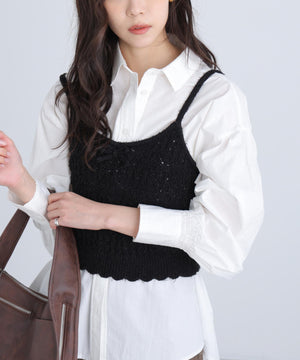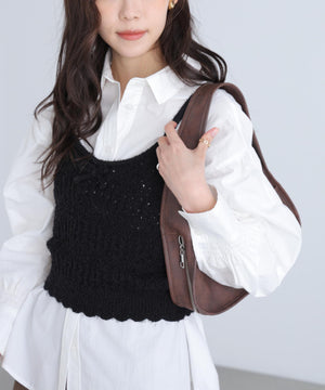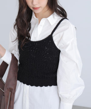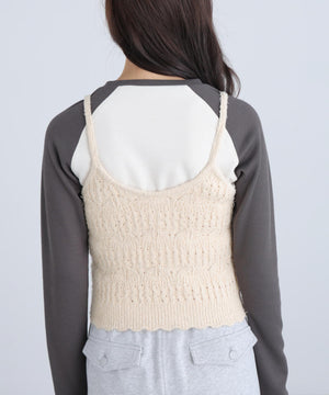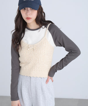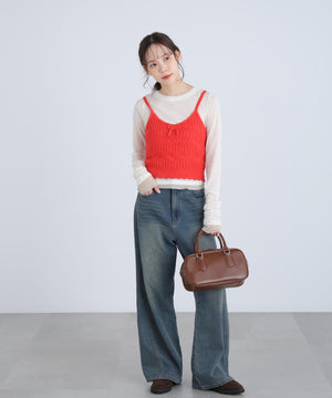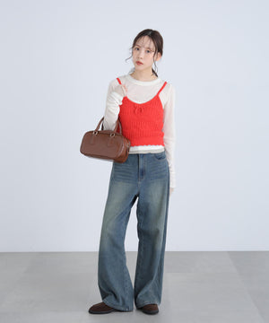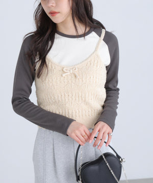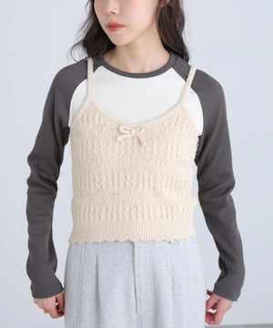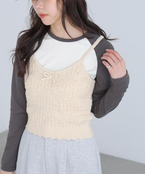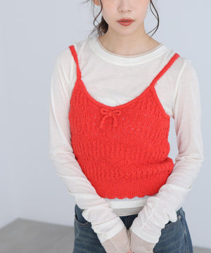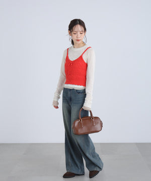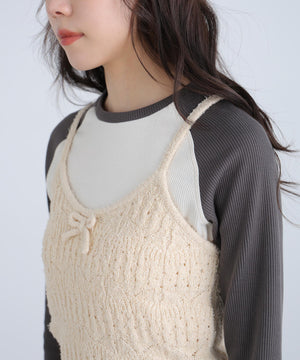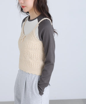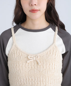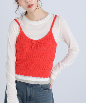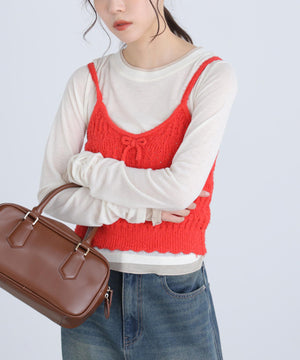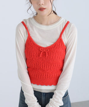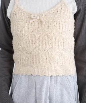 カジュアルでヴィンテージ感ある毛足糸を使用した透かし編みビスチェ。表情のある糸にコットンアクリルを引き揃え、程よくしっかりとした編地に仕上げています。コンパクトなシルエットのキャミソール型で、フロントリボンと裾スカラップがポイント。無地やラグラン、ボーダーなど、コンパクトTシャツとのレイヤードがおすすめです。
