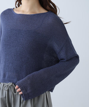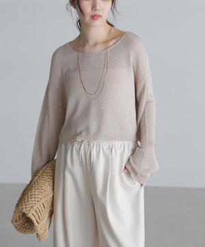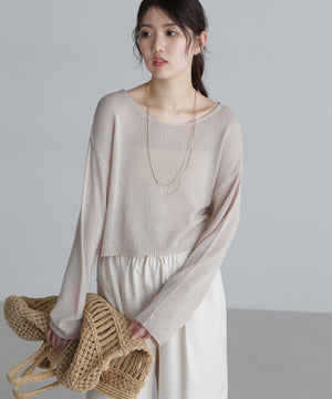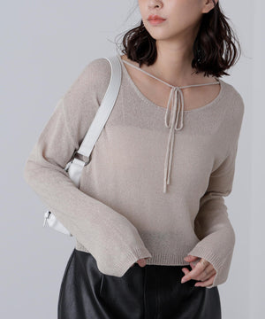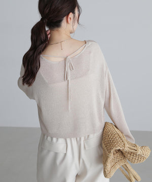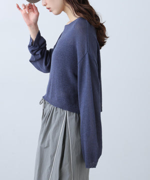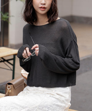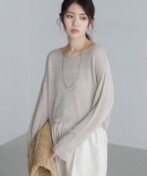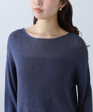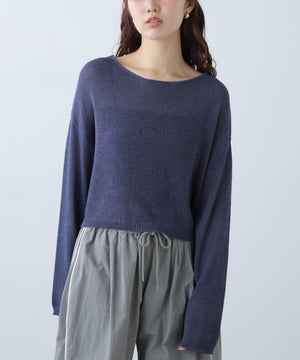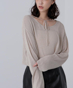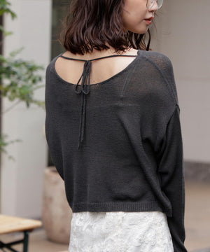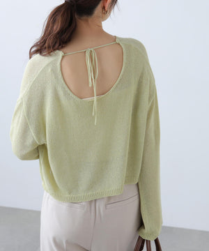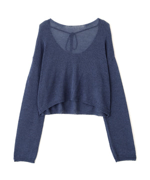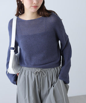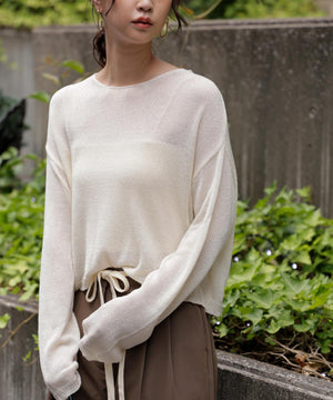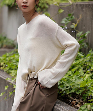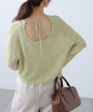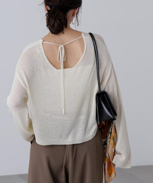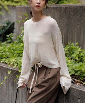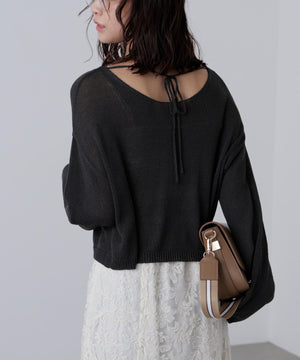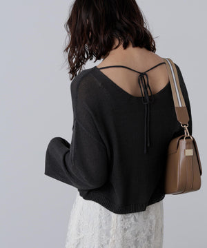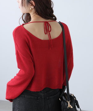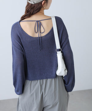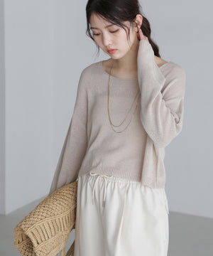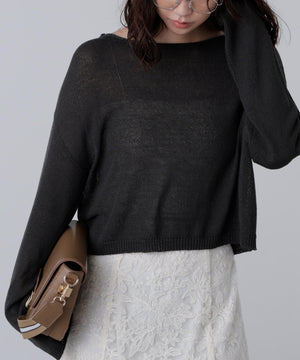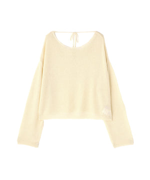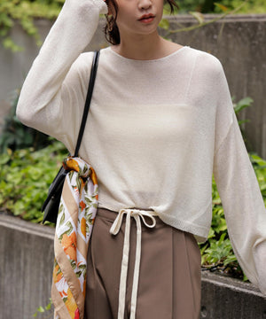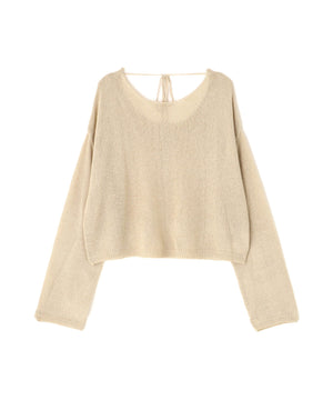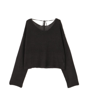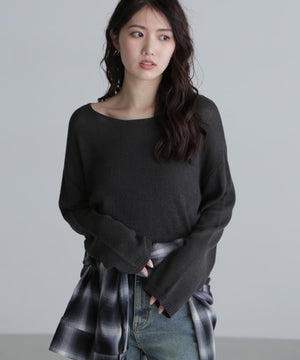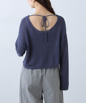 ゆったりとした身頃でリラクシーな抜け感がかわいい、からっとした風合いのニット。フロントはボートネック、バックスタイルは深めのUネックでヘルシーな印象です。ルーズな着心地ながら、肩先から共地リボンを付けてポイントにしつつ、肩からずり落ちないように仕上げています。デニム合わせでカジュアルにも、ティアードスカート合わせでフェミニンカジュアルなスタイリングもおすすめです。