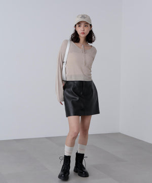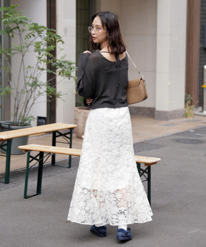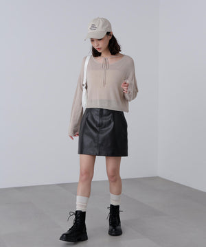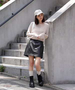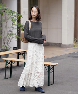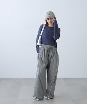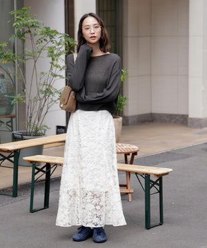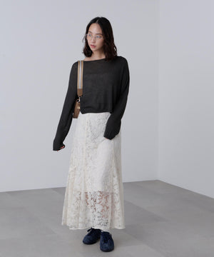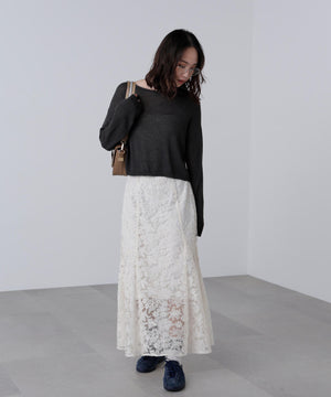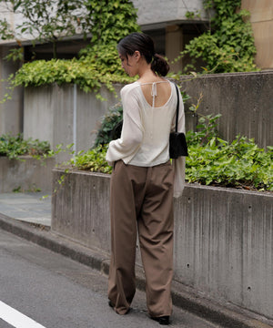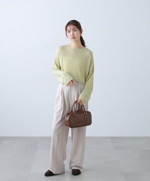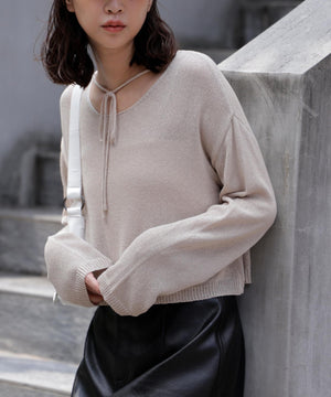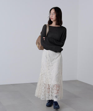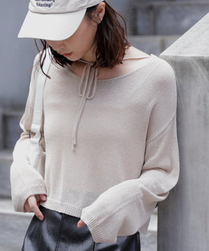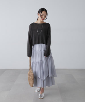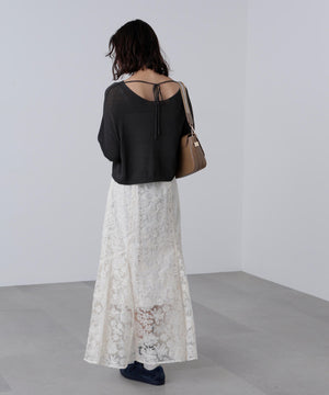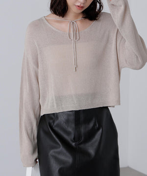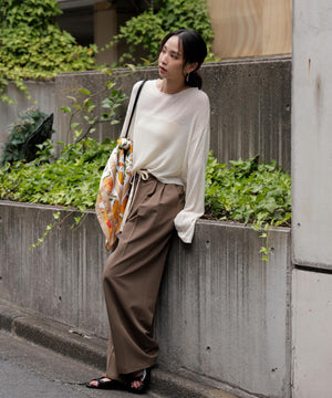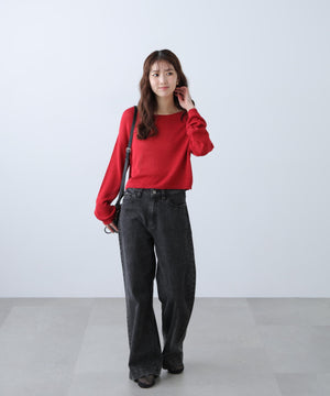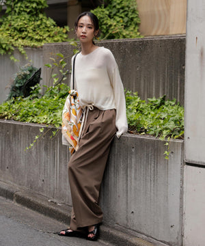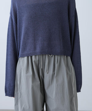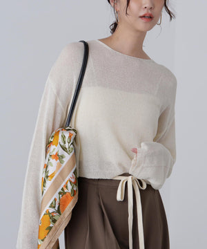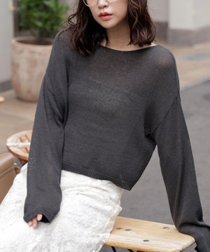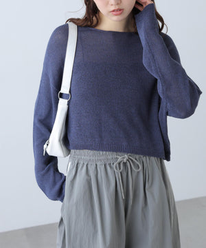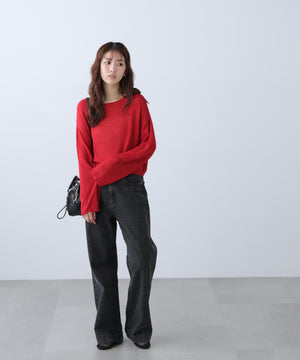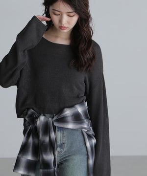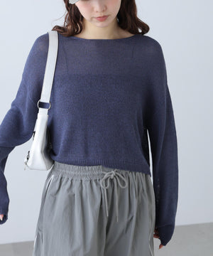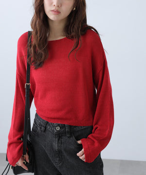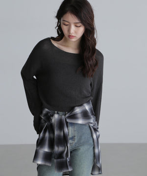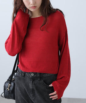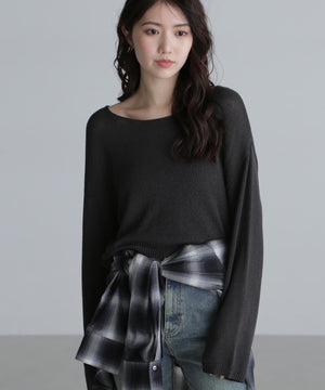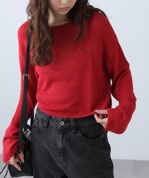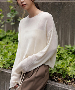 ゆったりとした身頃でリラクシーな抜け感がかわいい、からっとした風合いのニット。フロントはボートネック、バックスタイルは深めのUネックでヘルシーな印象です。ルーズな着心地ながら、肩先から共地リボンを付けてポイントにしつつ、肩からずり落ちないように仕上げています。デニム合わせでカジュアルにも、ティアードスカート合わせでフェミニンカジュアルなスタイリングもおすすめです。
