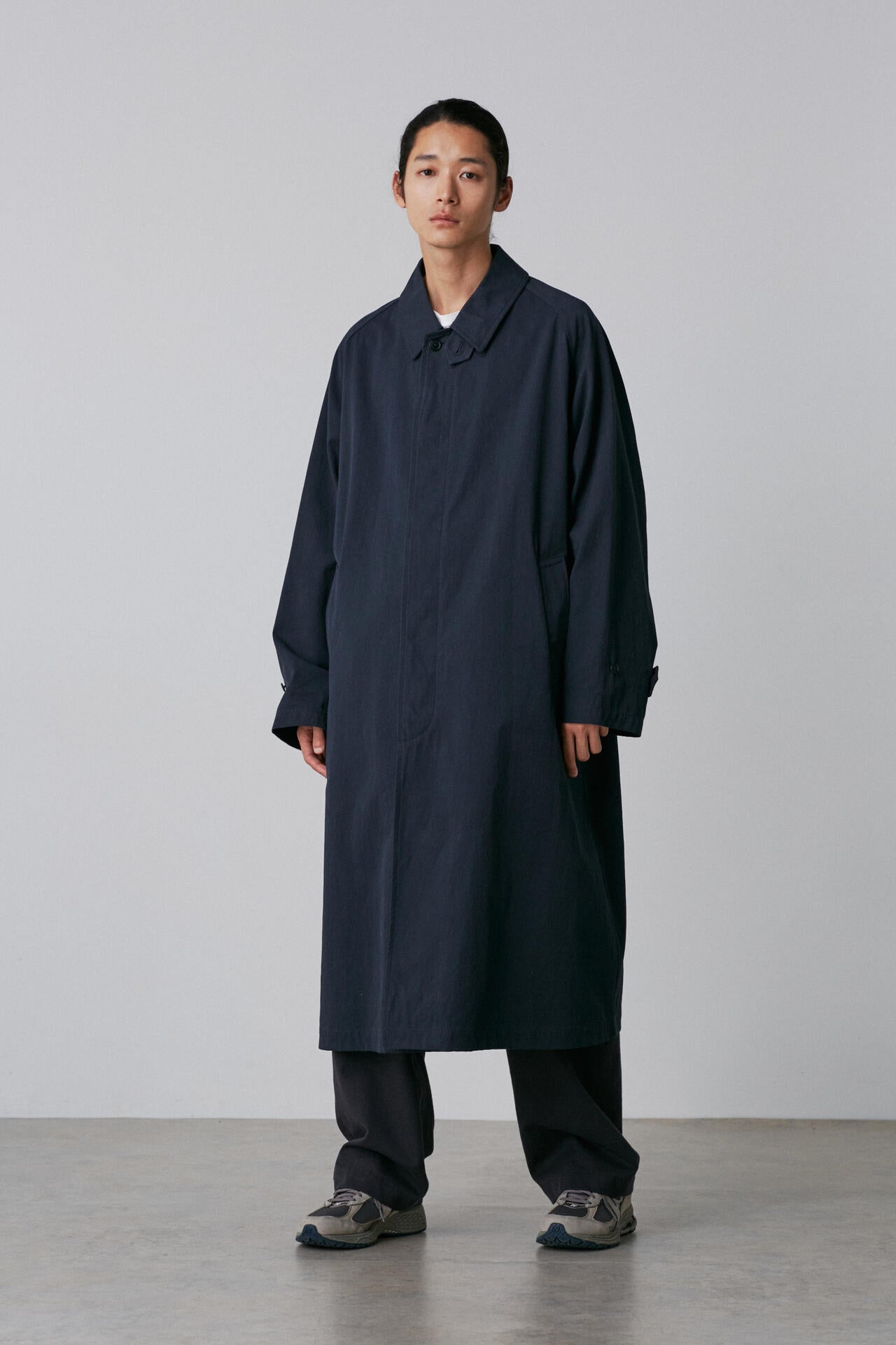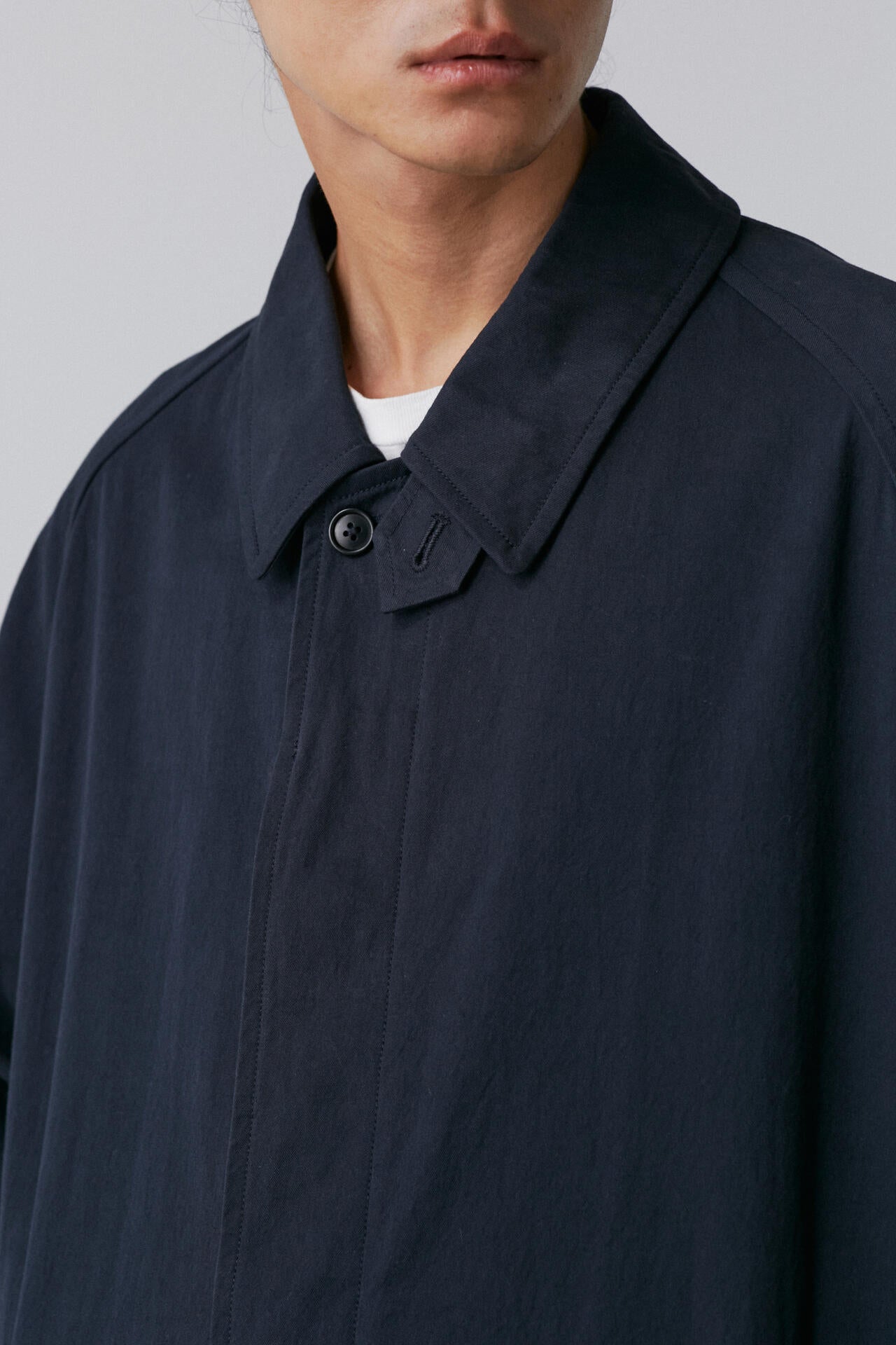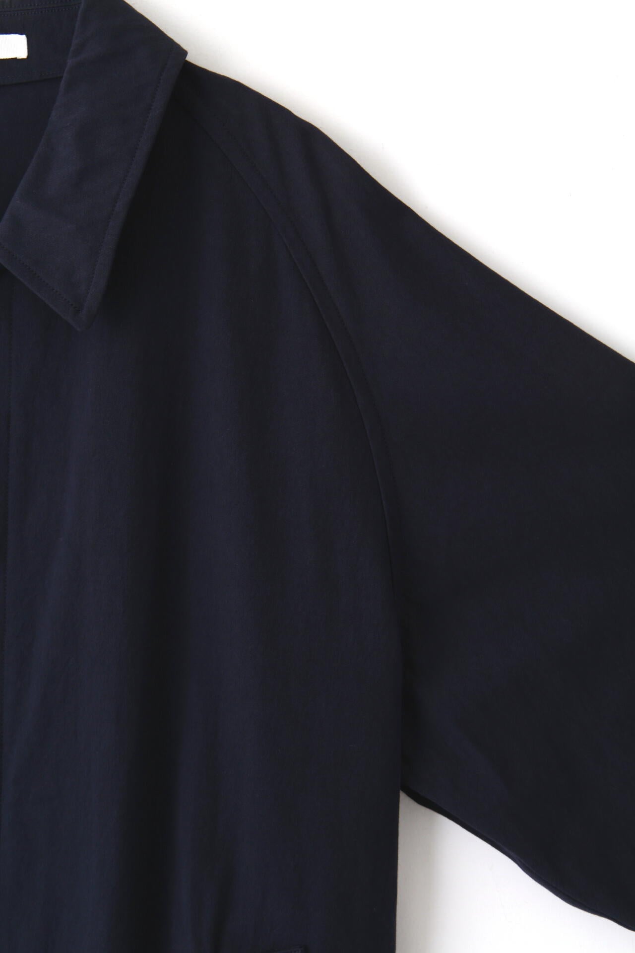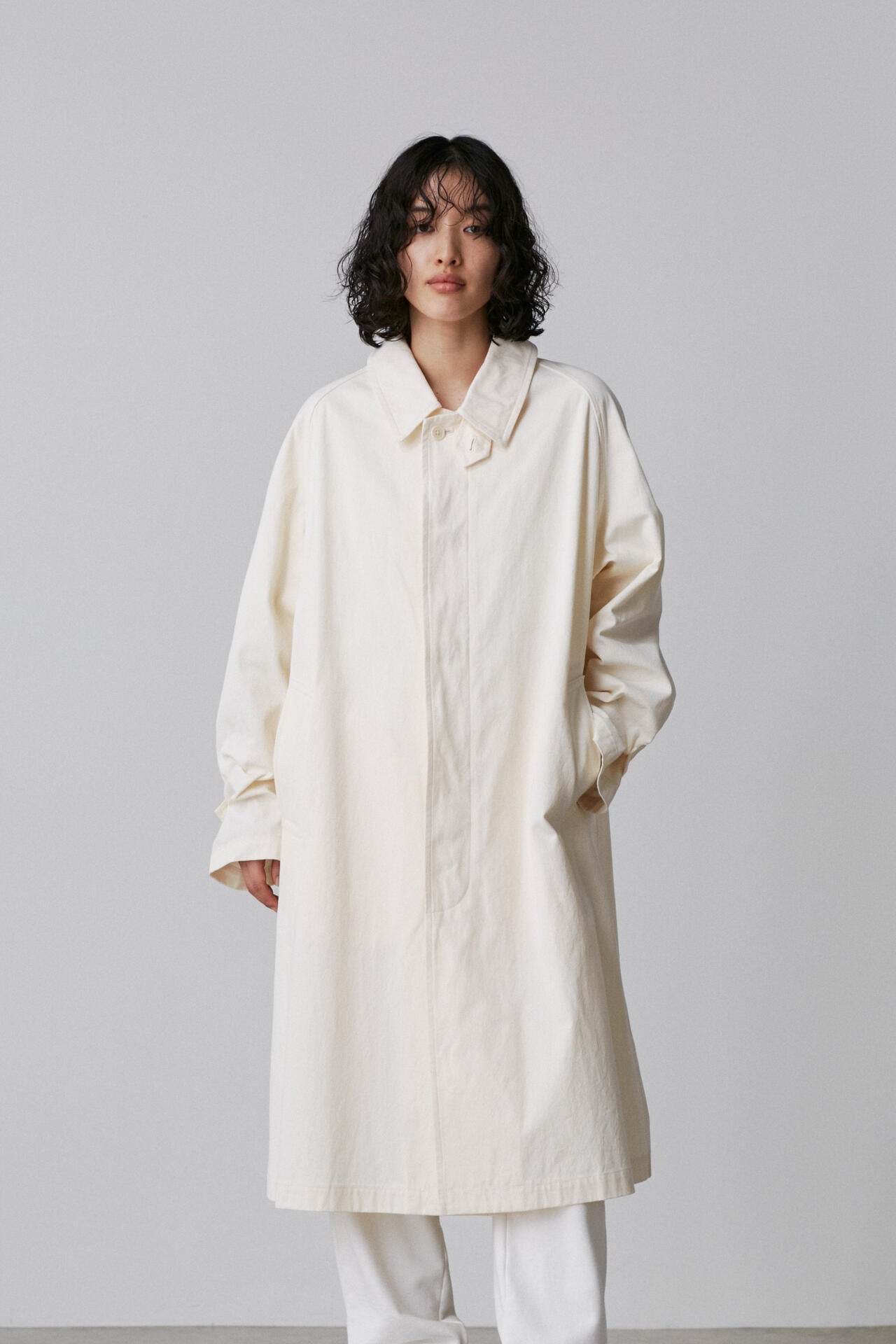 タテはオーガニックの40/2糸を使用、ヨコはオーガニックの40/2強撚糸を使った高密度ギャバジン素材。バーバリーの1枚袖ステンカラーコートを裏無しでラフに仕立てました。
