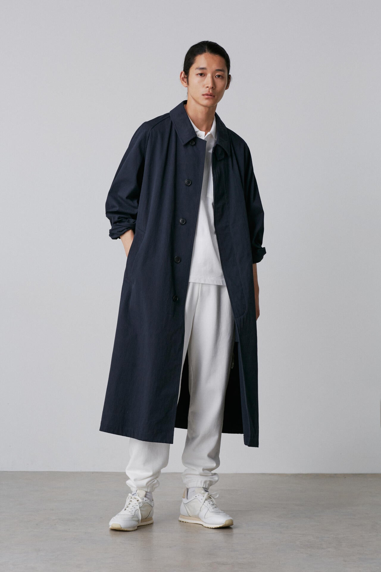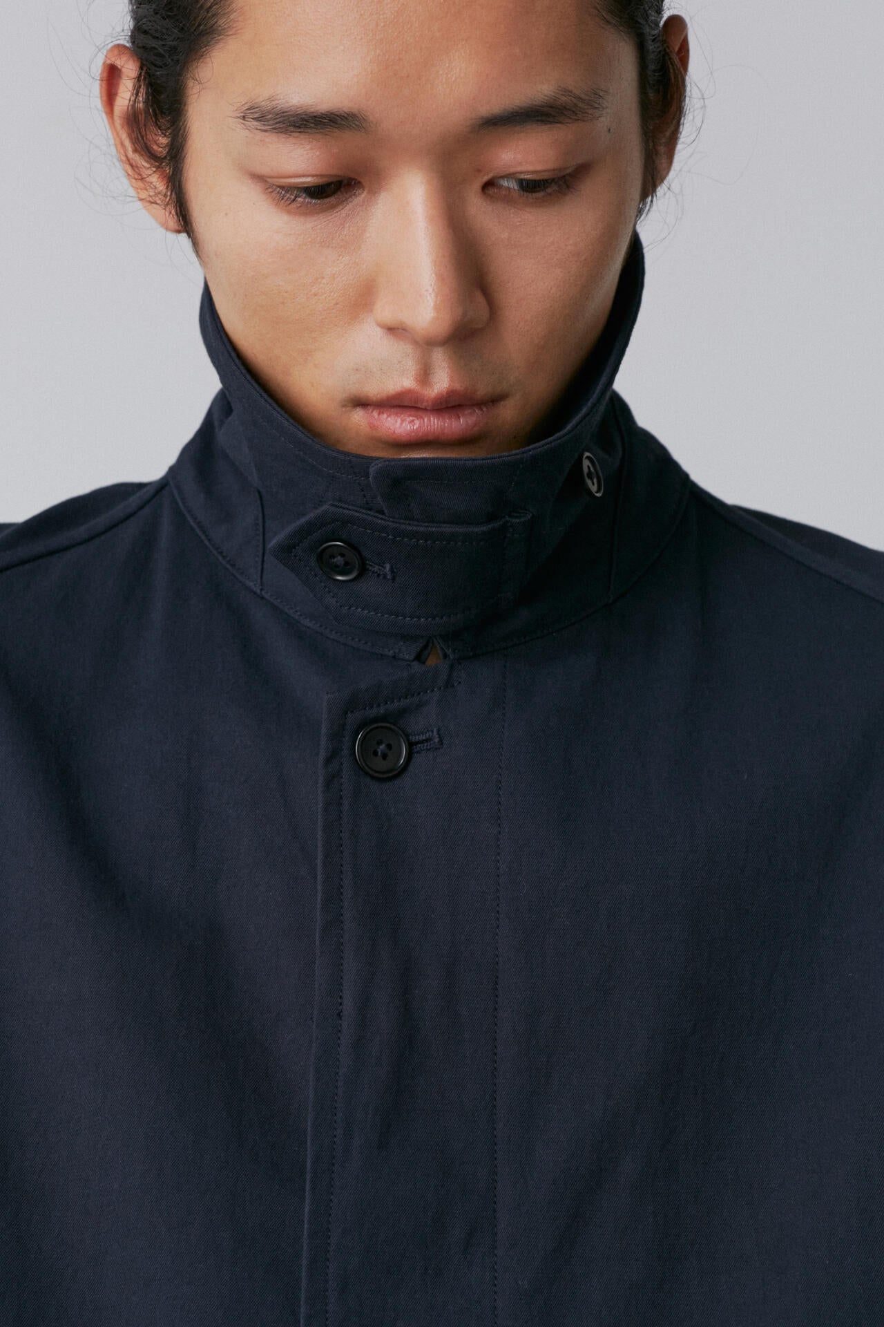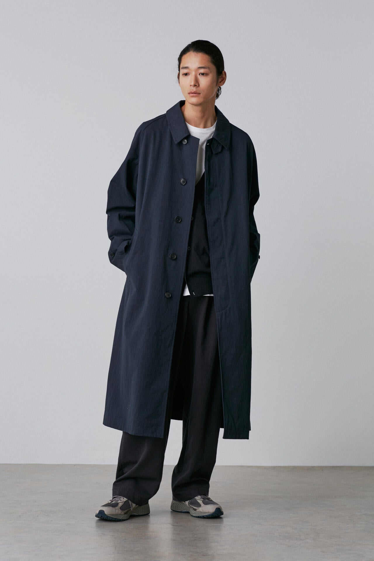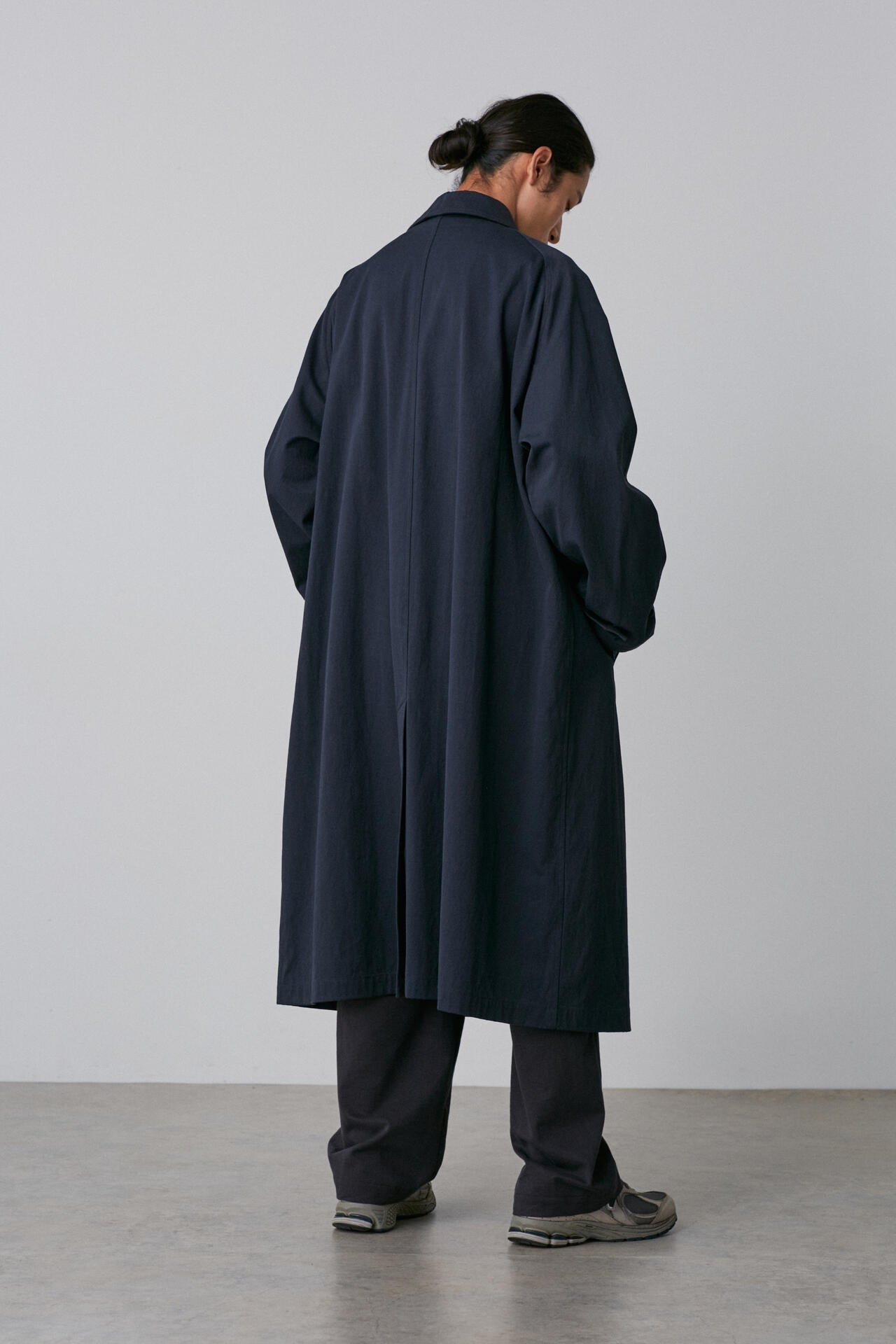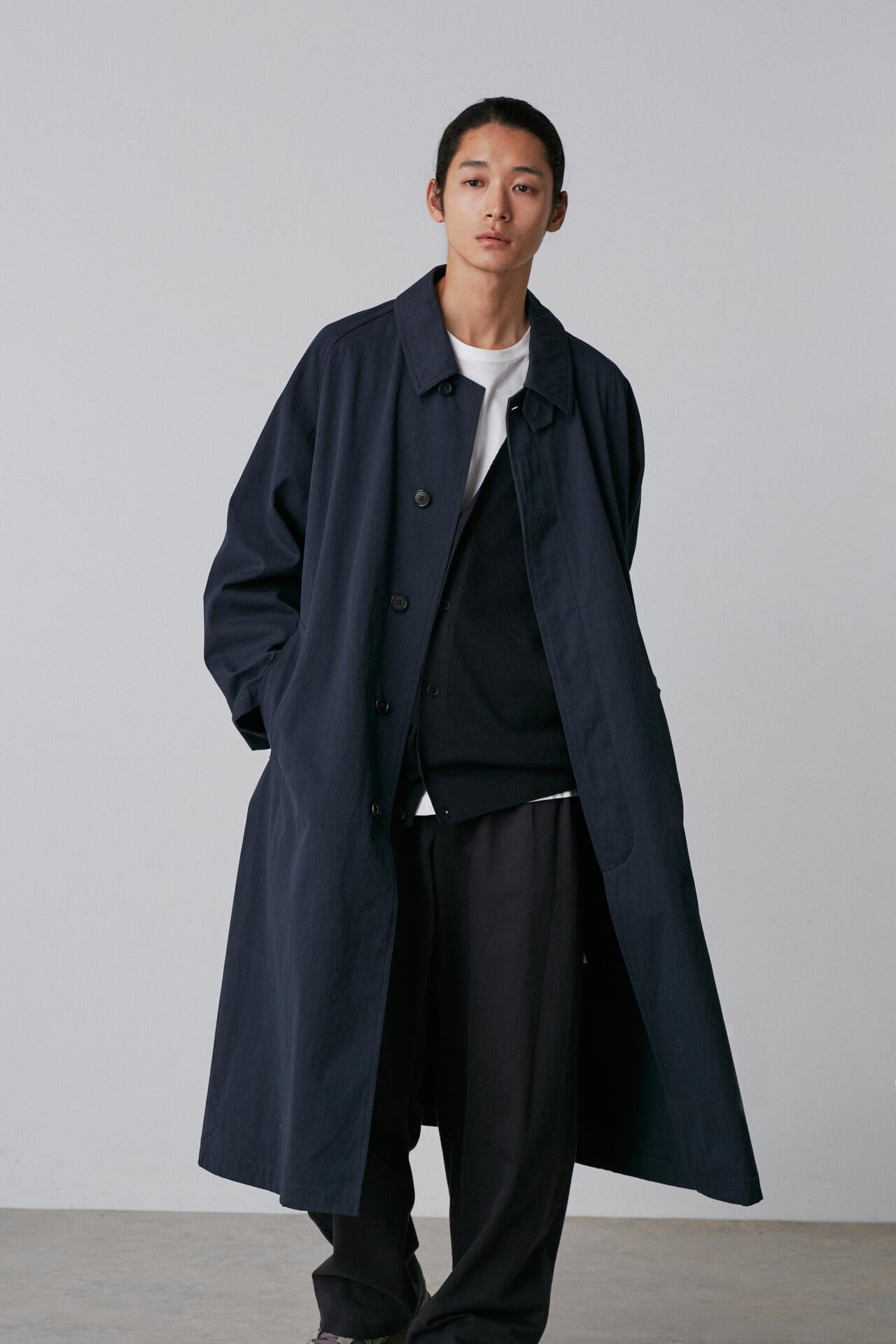 タテはオーガニックの40/2糸を使用、ヨコはオーガニックの40/2強撚糸を使った高密度ギャバジン素材。バーバリーの1枚袖ステンカラーコートを裏無しでラフに仕立てました。