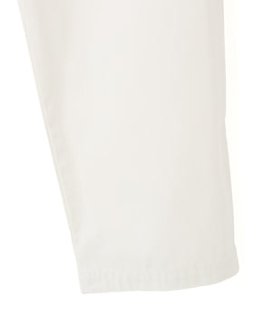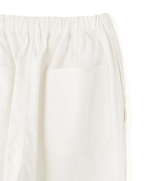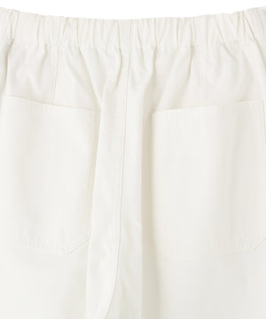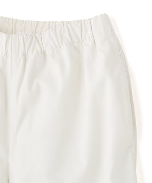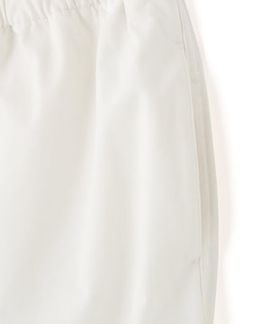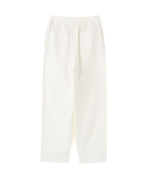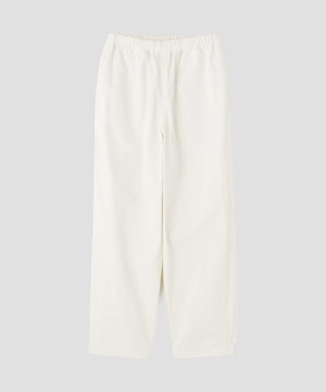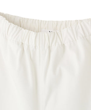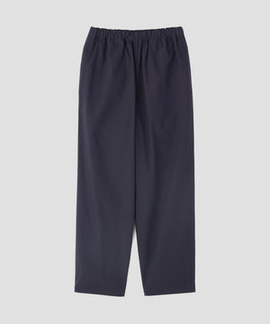 リサイクルポリエステルとオーガニックコットンを使用した高密度の強撚ツイルのため、軽くすっきりした風合い。ウェストドローコードなので、色々なサイズ感の人が着られるテーパードシルエットのイージーパンツです。サイズはユニセックスでお選びいただけます。