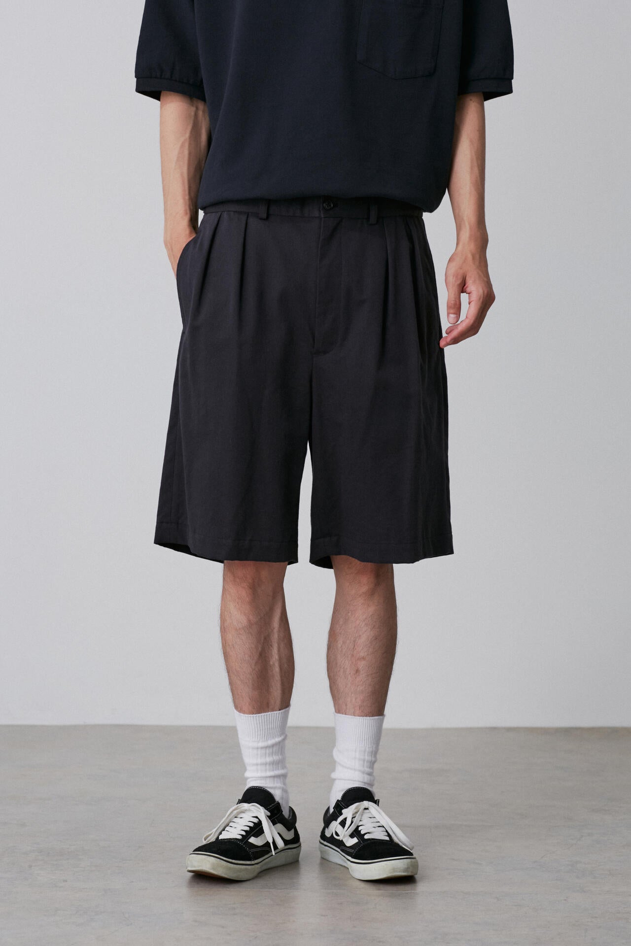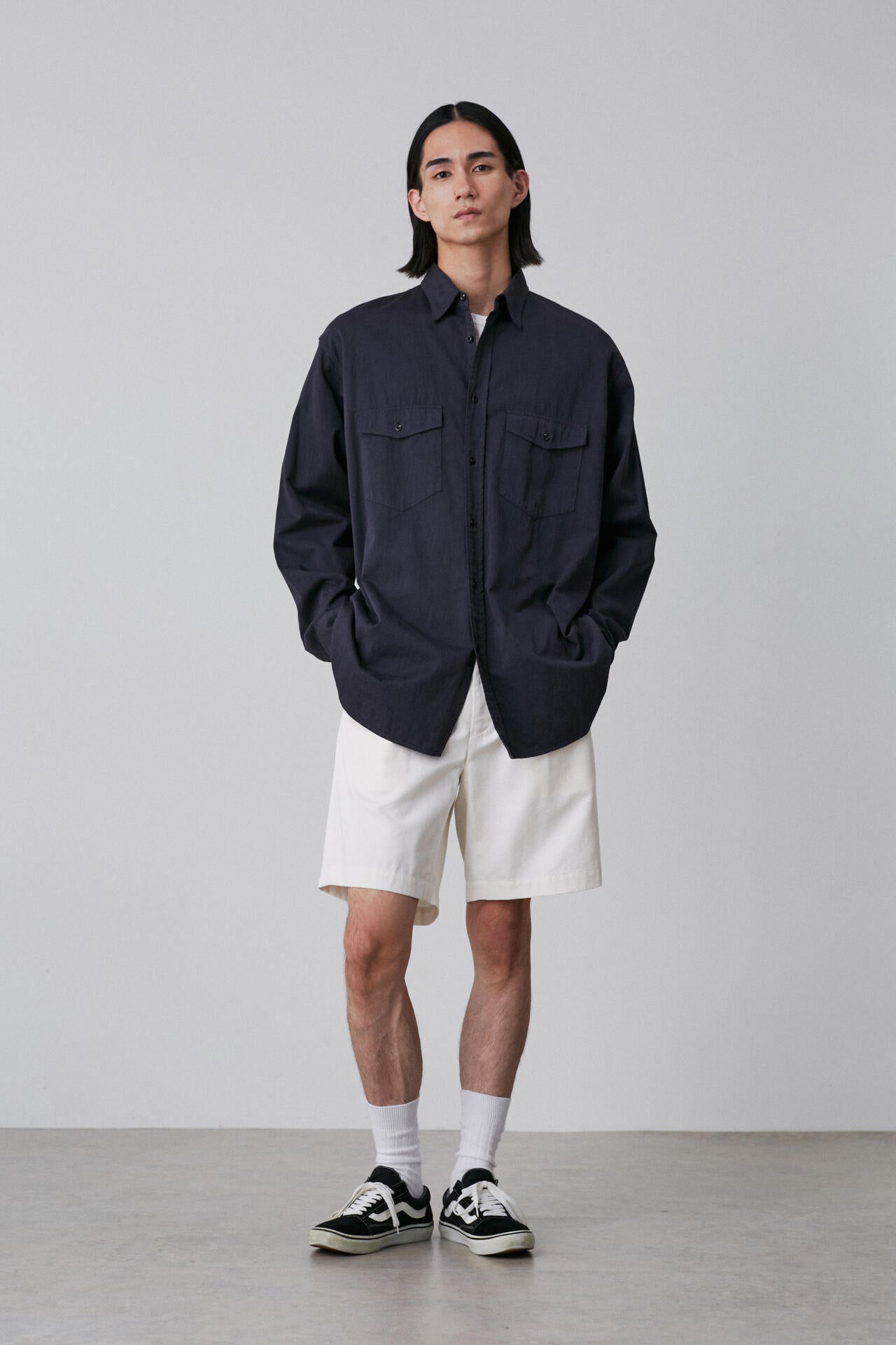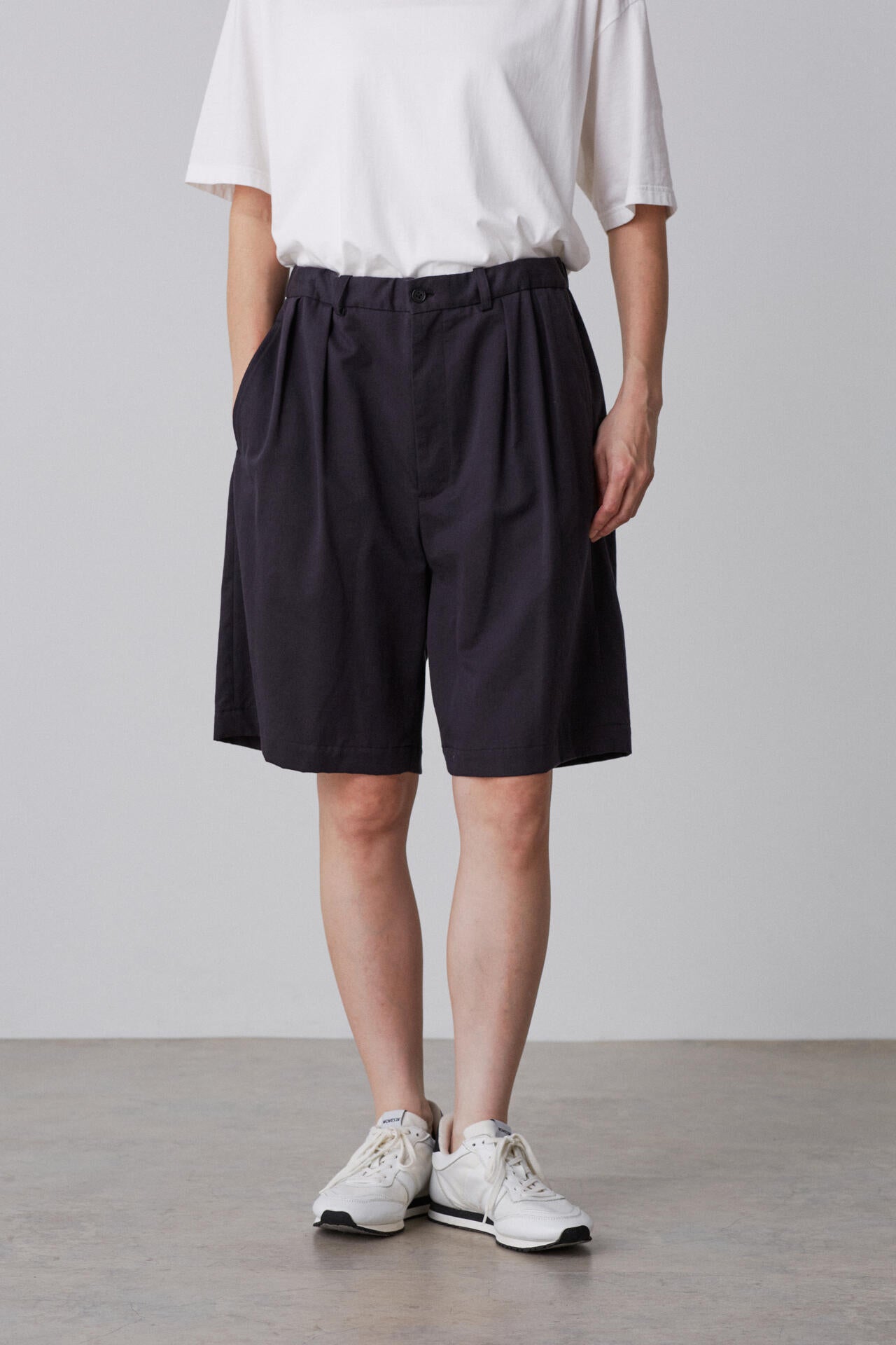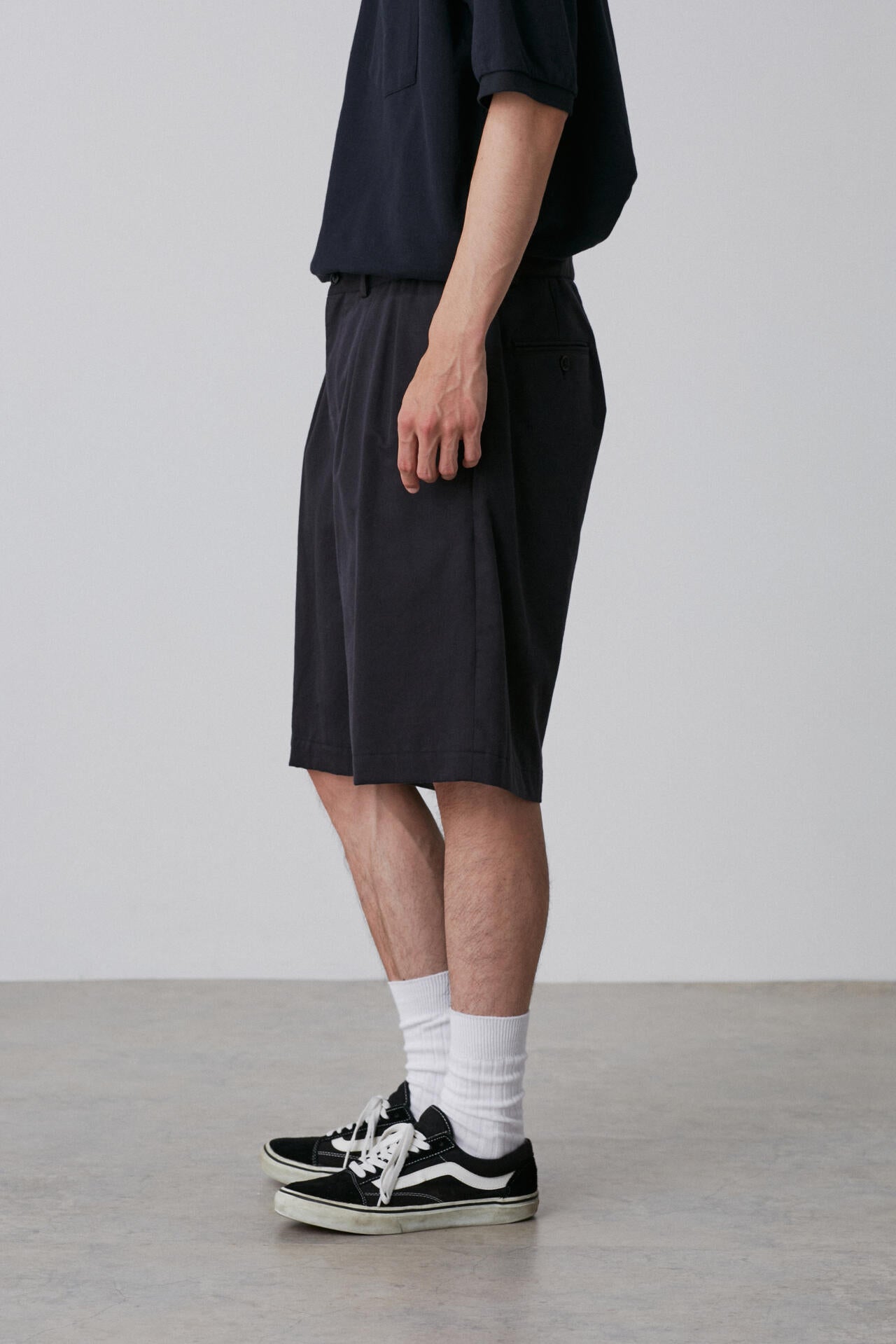 古着のコットンシルクのチノパンツをイメージして、オーガニックコットンとテンセルの交織+加工で古着のような落ち感と適度な光沢を再現。ウエストドローコード入りでラフに履けるチノトラウザーをベースにしたショーツです。