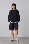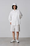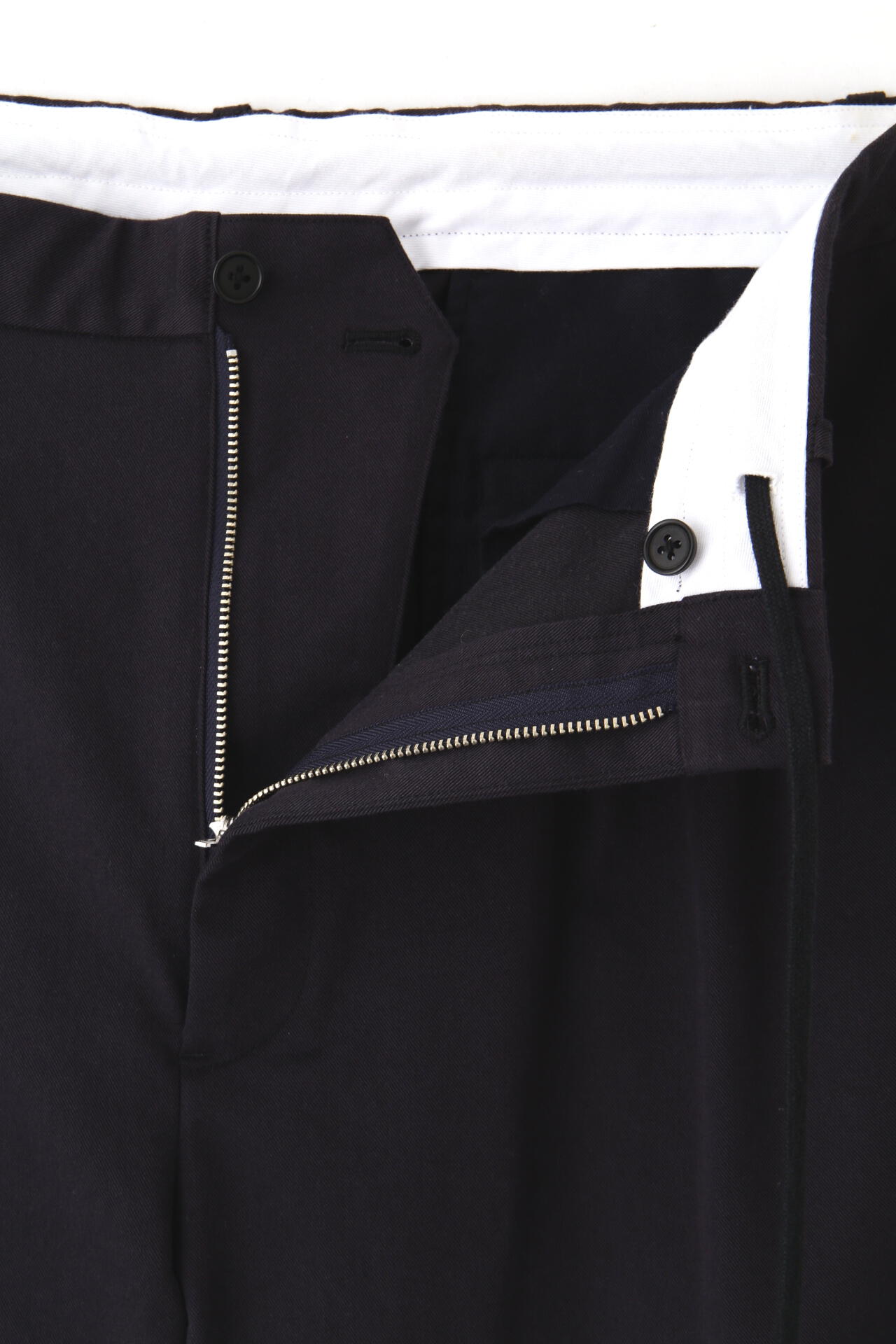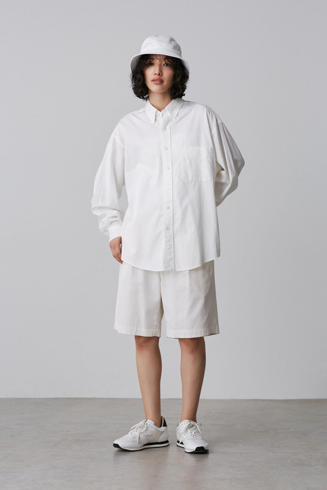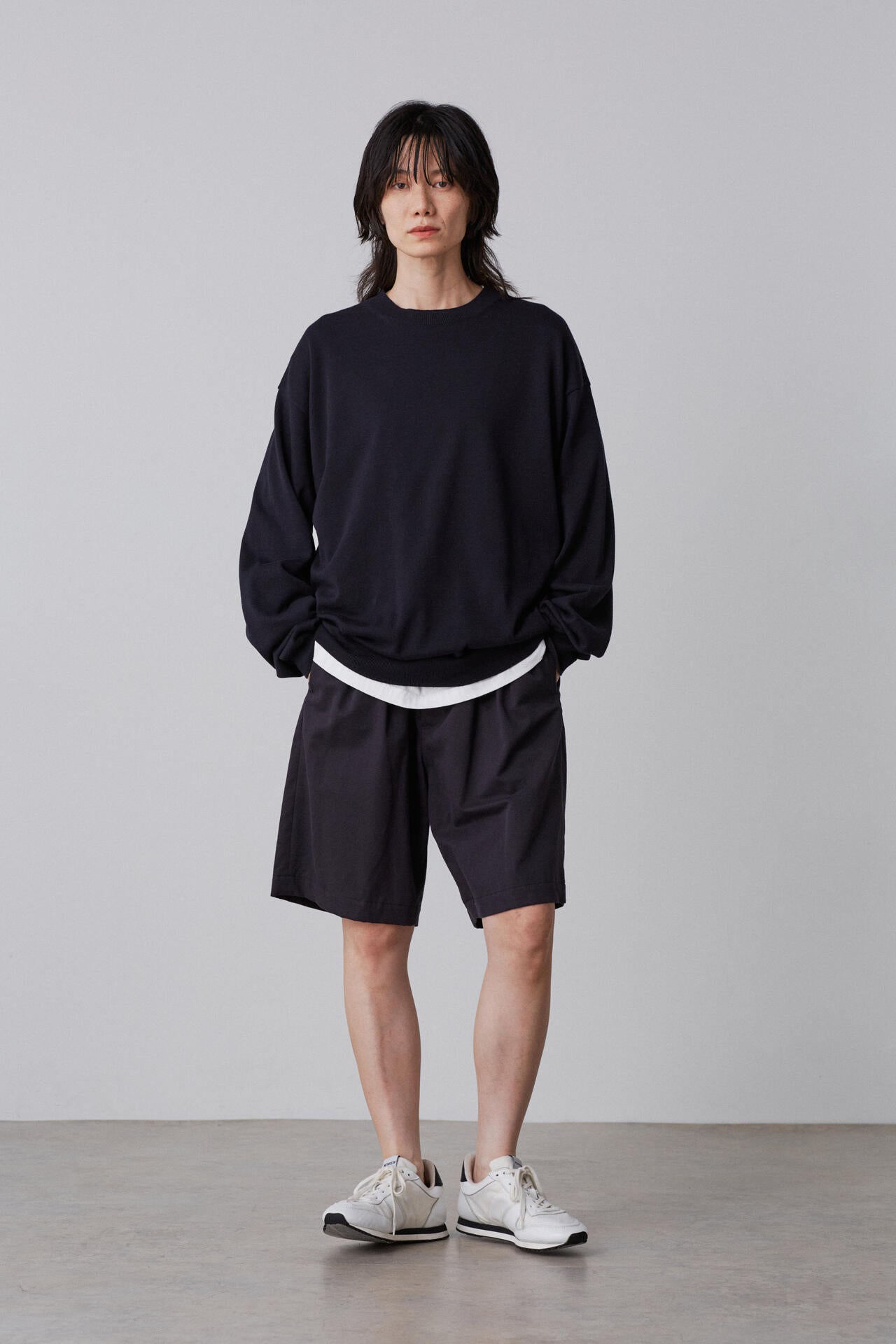 古着のコットンシルクのチノパンツをイメージして、オーガニックコットンとテンセルの交織+加工で古着のような落ち感と適度な光沢を再現。ウエストドローコード入りでラフに履けるチノトラウザーをベースにしたショーツです。
