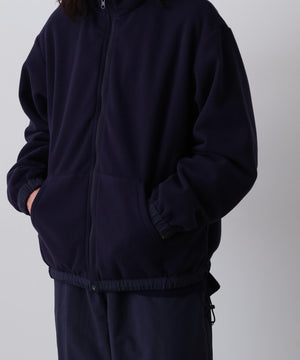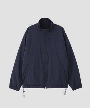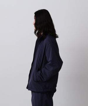 リサイクルナイロンを60%使用し、糸の力で生地を高密度でコンパクトにする超収縮糸を使用しており、この加工技術でしなやかさとハリ・コシ感を表現しています。防風・撥水の高機能素材です。ゆったりとしたシルエットのブルゾンです。袖口と裾はアジャスターで調整できます。裏地にはリサイクルフリースを使用し、今期はリバーシブル仕様です。