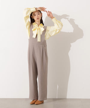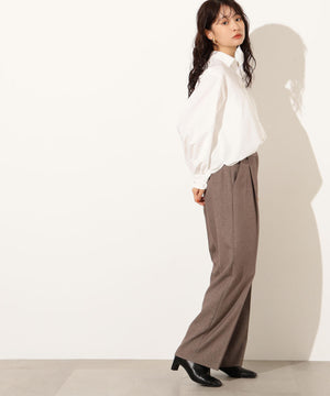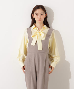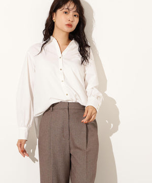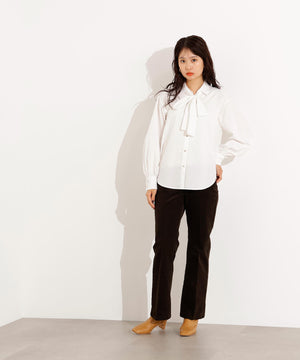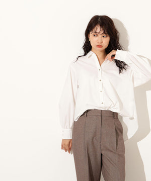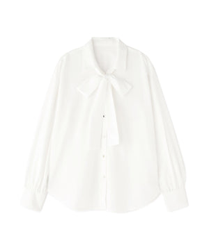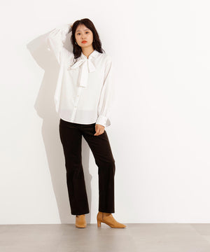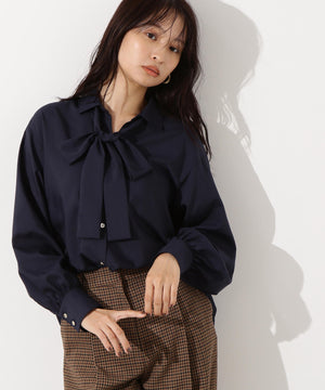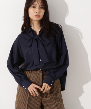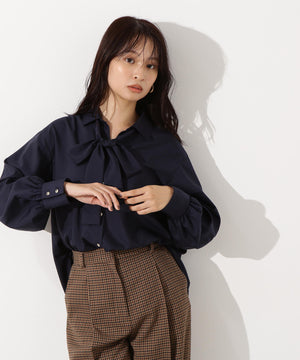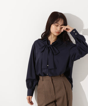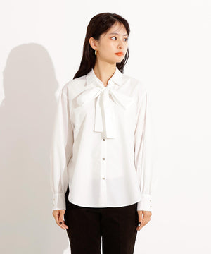 ゴールドカラー釦を効かせたボウタイ付きの2wayのシャツ。ボウタイはリボン結びでも、ひと巻きしても着られます。シャツ襟なのでスキッパーの抜け感が出せるネックデザインも特徴。シワになりにくく、お手入れがラクな素材なので、オンにもオフシーンにも使いやすいデザインです。