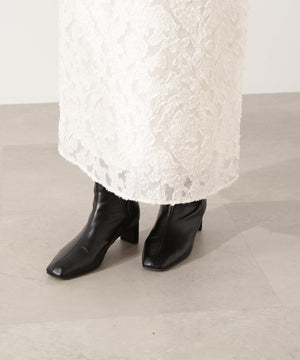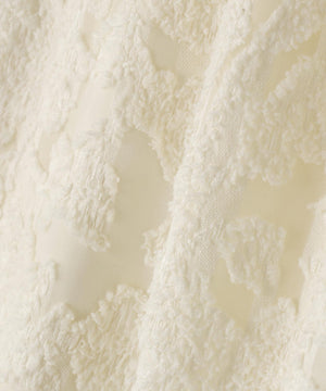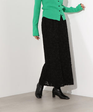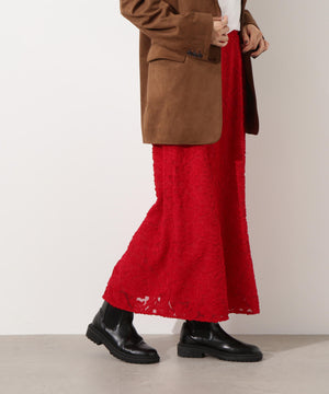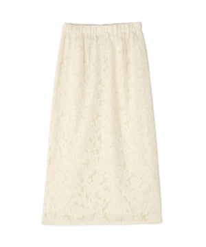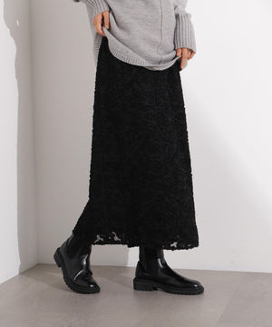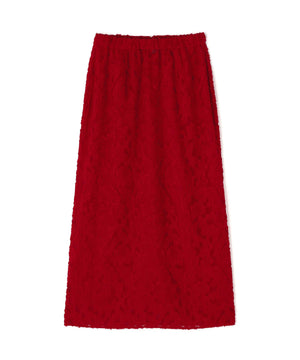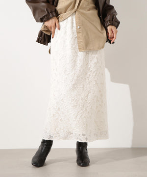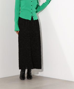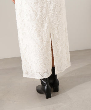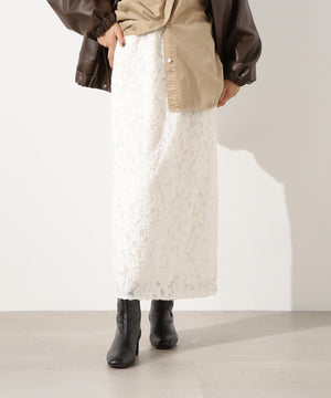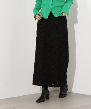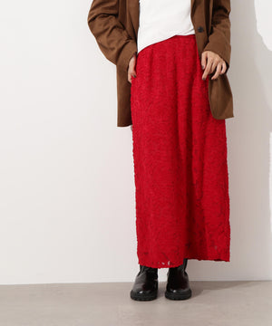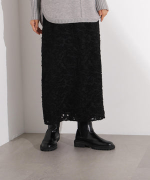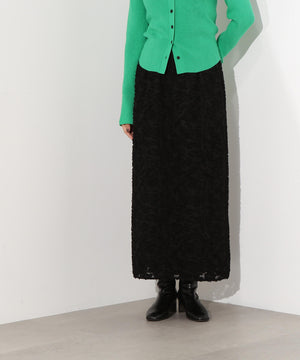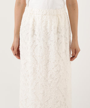 表面感のある表情豊かなカットジャガード素材のナロースカート。上品な透け感と立体感が、シンプルなトップスを合わせるだけで華やかな印象に見せてくれます。すっきりとしたナローシルエットでスタイルアップ効果も期待。後ろはセンタースリット入りです。ウエストはゴム仕様で、見た目以上にはき心地が良い仕上がりです。