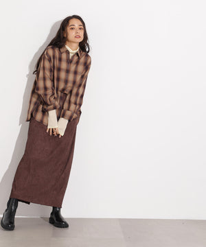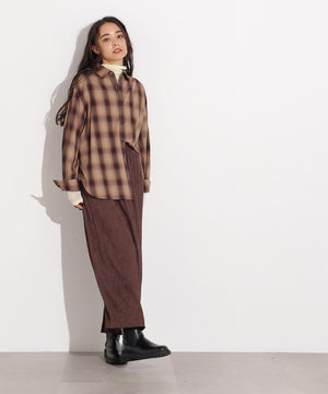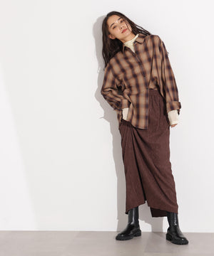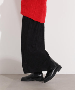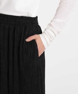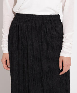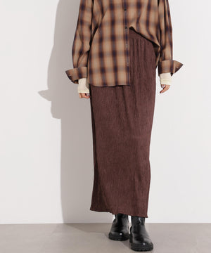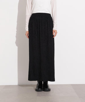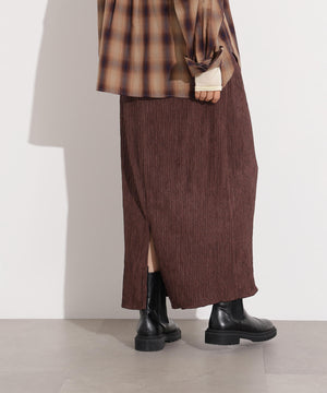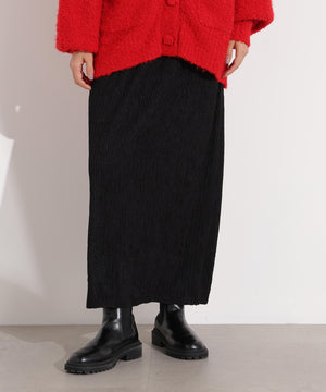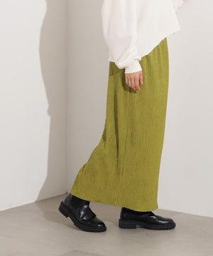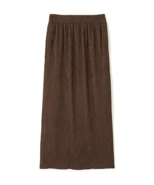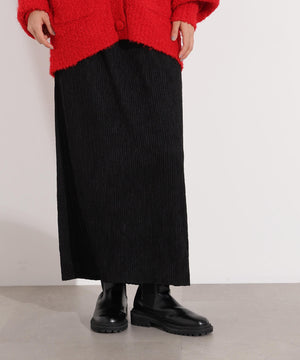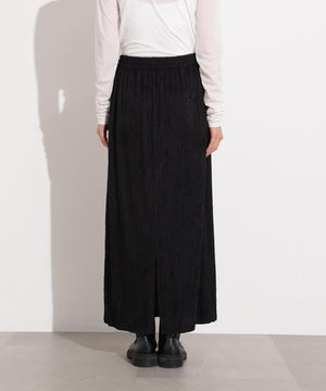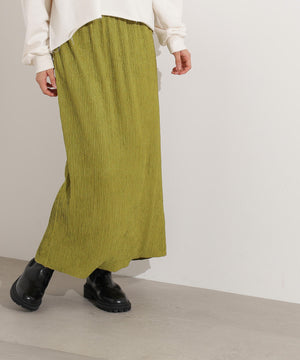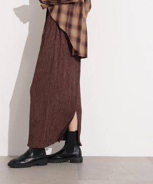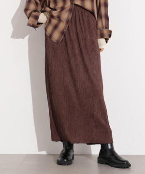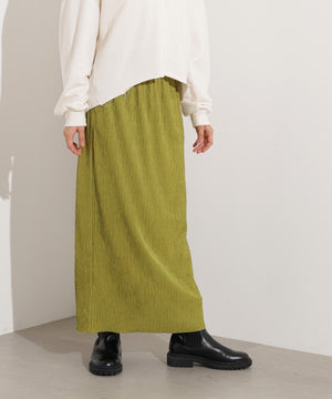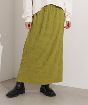 ウエストゴム仕様でリラクシーなはき心地のナロースカート。縦目に表情をつけた伸縮性のあるシュリンク素材が、シンプルな中にさりげないニュアンスをプラスします。後ろスリット入りで抜け感がありつつ、足さばき良く着ていただけます。キレイめなシャツやカジュアルなトップスとも相性が良く、デイリーに活躍します。
