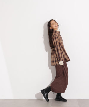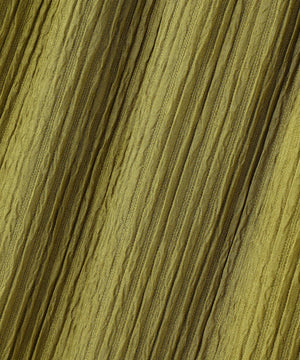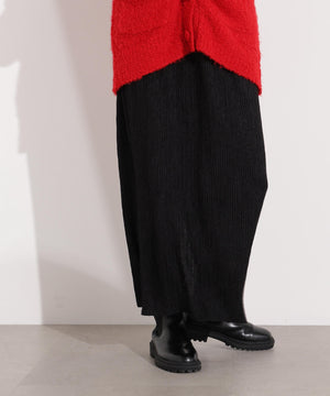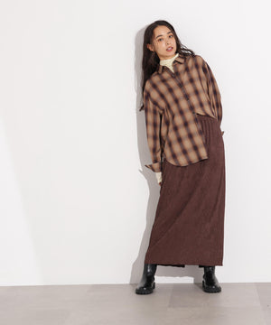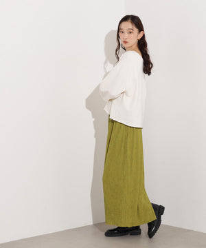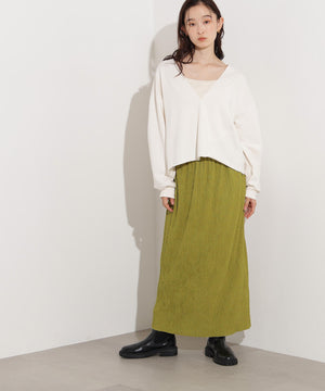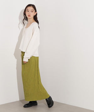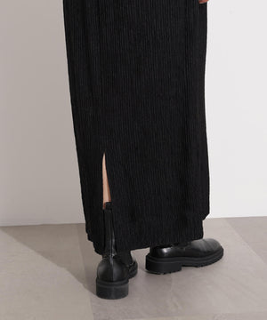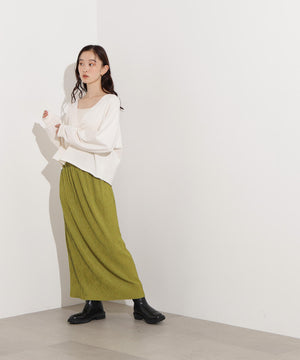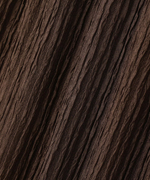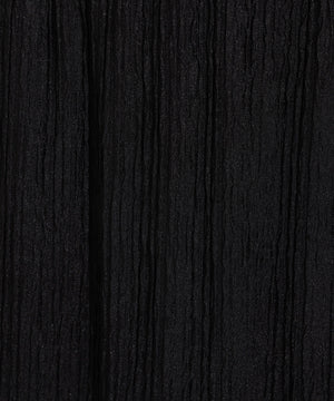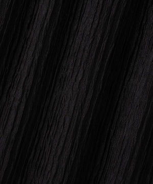 縦目に表情と表面感のあるシュリンク素材を使用。伸縮性があり、体のラインを拾いにくい素材感です。