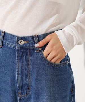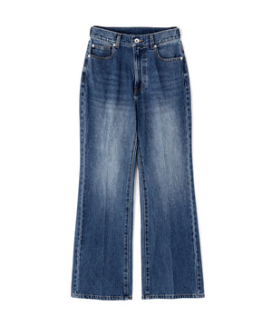 ハイウエストで腰の位置を高く見せるフレアデニムパンツ。コンパクトなフレアシルエットと膝から裾にかけてやさしいフレア感を作り、脚のラインをキレイに見せます。サイドベルトの釦ディテールもポイント。着丈が長いトップスとも着ていただけます。