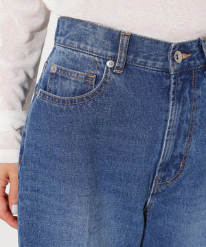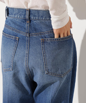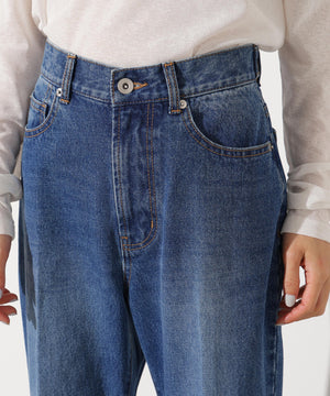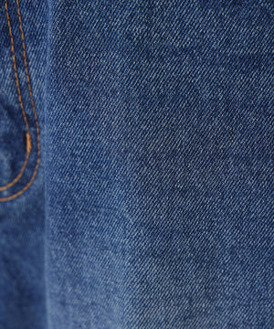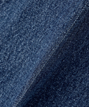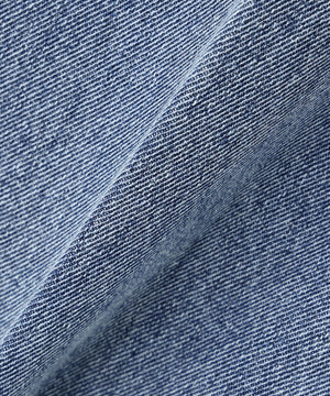 洗いの加工感が綺麗に映えるデニムを使用。デニムの織り目はしっかりありつつも縦にスラブが立ちすぎてない表面感なので加工後もハードになり過ぎず、ブリーチやブラストも全体的に馴染んだ上品な印象です。柔らかい仕上がりの生地感で着心地も良いです。